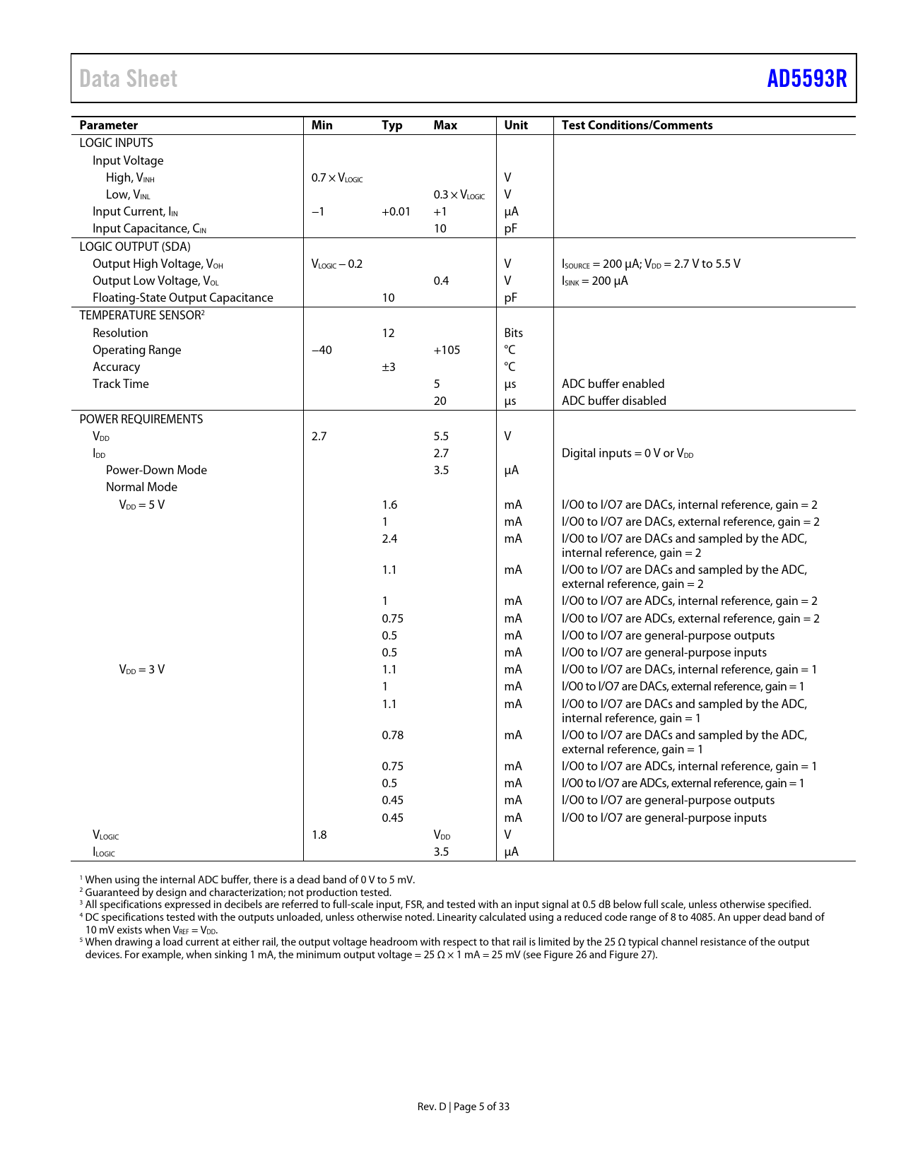 Seiten / Seite33 / 5 — Data Sheet. AD5593R. Parameter. Min. Typ. Max. Unit. Test …