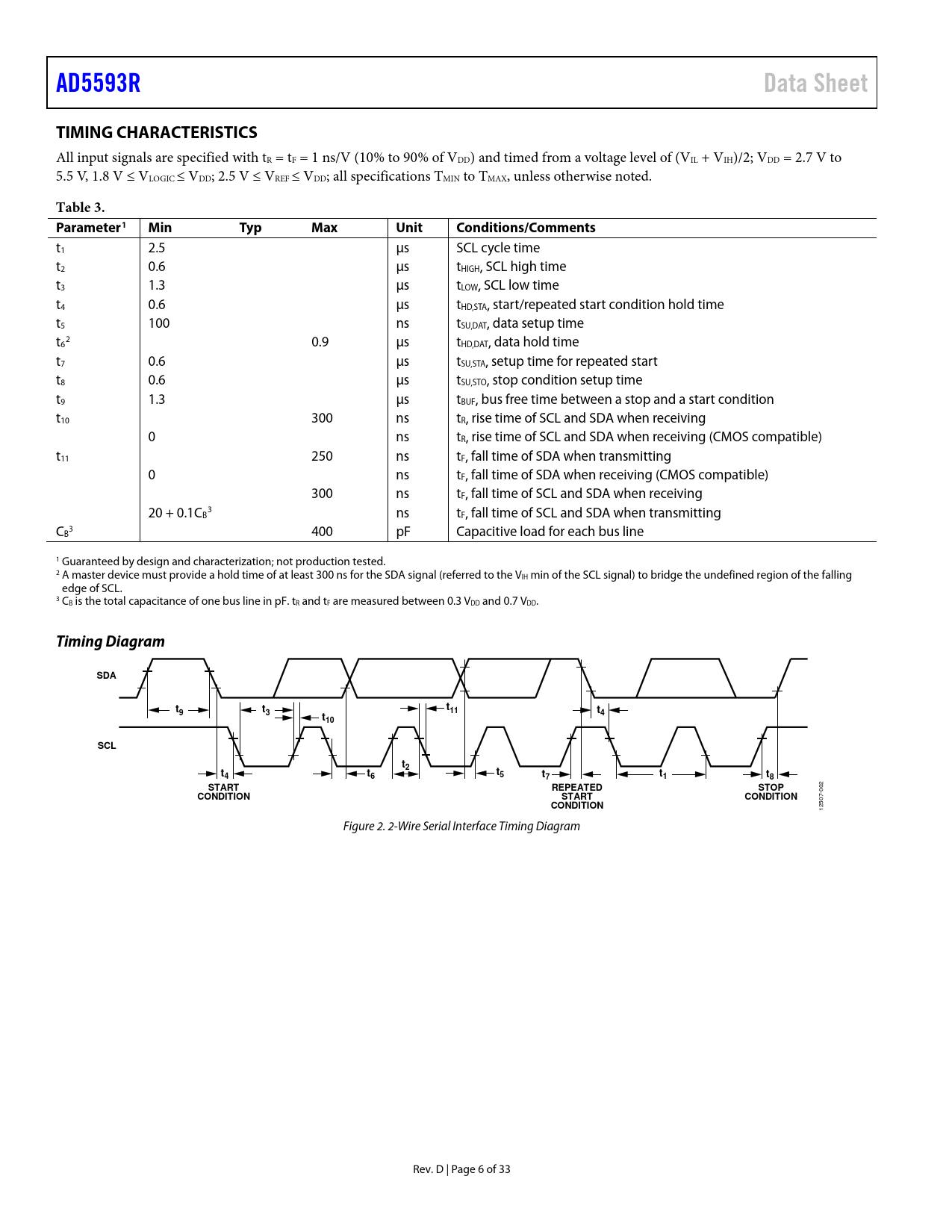 AD5593R. Data Sheet. TIMING CHARACTERISTICS. Table 3. Parameter1. Min. Typ. Max. Unit. Conditions/Comments. Timing Diagram. SDA. SCL. START