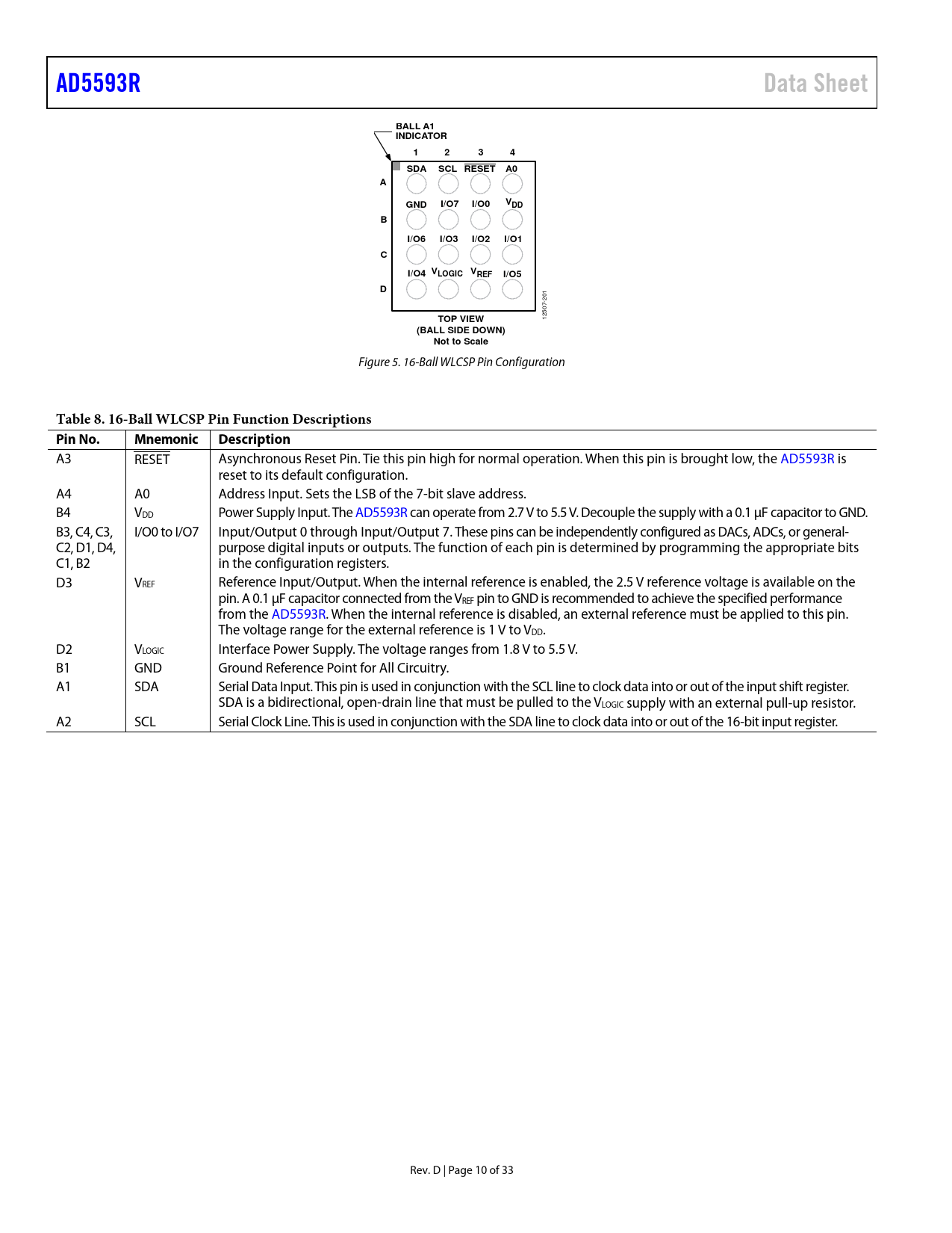 AD5593RData SheetBALL A1 INDICATOR1234SDASCL RESETA0AVGNDI/O7I/O0DDBI/O6I/O3I/O2I/O1CI/O4 VVLOGICREFI/O5D 201 TOP VIEW 12507- (BALL SIDE DOWN)Not to Scale Figure 5. 16-Ball WLCSP Pin Configuration Table 8. 16-Ball WLCSP Pin Function Descriptions Pin No.MnemonicDescription A3 RESET Asynchronous Reset Pin. Tie this pin high for normal operation. When this pin is brought low, the AD5593R is reset to its default configuration. A4 A0 Address Input. Sets the LSB of the 7-bit slave address. B4 VDD Power Supply Input. The AD5593R can operate from 2.7 V to 5.5 V. Decouple the supply with a 0.1 µF capacitor to GND. B3, C4, C3, I/O0 to I/O7 Input/Output 0 through Input/Output 7. These pins can be independently configured as DACs, ADCs, or general- C2, D1, D4, purpose digital inputs or outputs. The function of each pin is determined by programming the appropriate bits C1, B2 in the configuration registers. D3 VREF Reference Input/Output. When the internal reference is enabled, the 2.5 V reference voltage is available on the pin. A 0.1 µF capacitor connected from the VREF pin to GND is recommended to achieve the specified performance from the AD5593R. When the internal reference is disabled, an external reference must be applied to this pin. The voltage range for the external reference is 1 V to VDD. D2 VLOGIC Interface Power Supply. The voltage ranges from 1.8 V to 5.5 V. B1 GND Ground Reference Point for All Circuitry. A1 SDA Serial Data Input. This pin is used in conjunction with the SCL line to clock data into or out of the input shift register. SDA is a bidirectional, open-drain line that must be pulled to the VLOGIC supply with an external pull-up resistor. A2 SCL Serial Clock Line. This is used in conjunction with the SDA line to clock data into or out of the 16-bit input register. Rev. D | Page 10 of 33 Document Outline Features Applications General Description Functional Block Diagram Revision History Specifications Timing Characteristics Timing Diagram Absolute Maximum Ratings Thermal Resistance ESD Caution Pin Configuration and Function Descriptions Typical Performance Characteristics Terminology Theory of Operation DAC Section Resistor String DAC Output Buffer ADC Section Calculating ADC Input Current GPIO Section Internal Reference Reset Function Temperature Indicator Serial Interface Write Operation Read Operation Pointer Byte Control Registers General-Purpose Control Register Configuring the AD5593R DAC Write Operation LDAC Mode Operation DAC Readback ADC Operation GPIO Operation Setting Pins as Outputs Setting Pins as Inputs Three-State Pins 85 kΩ Pull-Down Pins Power-Down/Reference Control Reset Function Applications Information Microprocessor Interfacing AD5593R to ADSP-BF537 Interface Layout Guidelines Outline Dimensions Ordering Guide