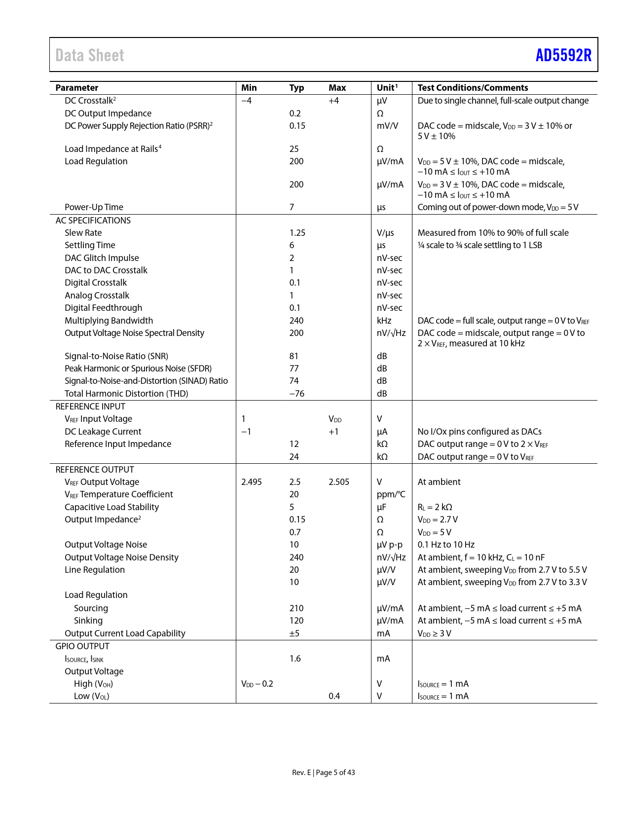 Seiten / Seite43 / 5 — Data Sheet. AD5592R. Parameter. Min. Typ. Max. Unit1. Test …