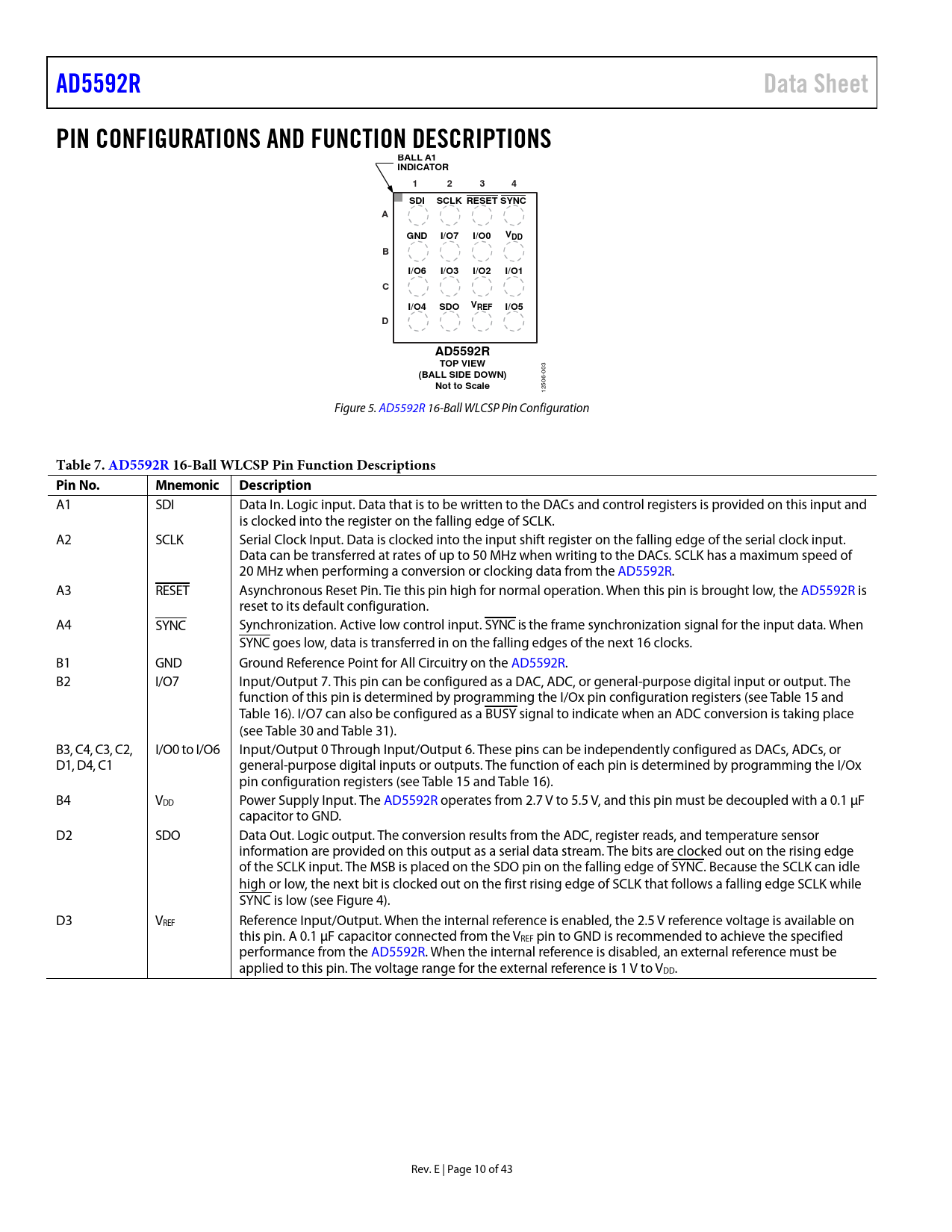 Table 7. AD5592R 16 -Ball WLCSP Pin Function Descriptions Pin No. Mnemonic Description