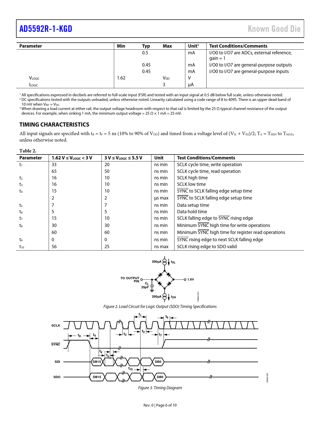 AD5592R-1-KGDKnown Good DieParameterMinTypMaxUnit1Test Conditions/Comments 0.5 mA I/O0 to I/O7 are ADCs, external reference, gain = 1 0.45 mA I/O0 to I/O7 are general-purpose outputs 0.45 mA I/O0 to I/O7 are general-purpose inputs VLOGIC 1.62 VDD V ILOGIC 3 µA 1 All specifications expressed in decibels are referred to full-scale input (FSR) and tested with an input signal at 0.5 dB below full scale, unless otherwise noted. 2 DC specifications tested with the outputs unloaded, unless otherwise noted. Linearity calculated using a code range of 8 to 4095. There is an upper dead band of 10 mV when VREF = VDD. 3 When drawing a load current at either rail, the output voltage headroom with respect to that rail is limited by the 25 Ω typical channel resistance of the output devices. For example, when sinking 1 mA, the minimum output voltage = 25 Ω × 1 mA = 25 mV. TIMING CHARACTERISTICS All input signals are specified with tR = tF = 5 ns (10% to 90% of VDD) and timed from a voltage level of (VIL + VIH)/2; TA = TMIN to TMAX, unless otherwise noted. Table 2. Parameter1.62 V ≤ VLOGIC < 3 V3 V ≤ VLOGIC ≤ 5.5 VUnitTest Conditions/Comments t1 33 20 ns min SCLK cycle time, write operation 65 50 ns min SCLK cycle time, read operation t2 16 10 ns min SCLK high time t3 16 10 ns min SCLK low time t4 15 10 ns min SYNC to SCLK falling edge setup time 2 2 µs max SYNC to SCLK falling edge setup time t5 7 7 ns min Data setup time t6 5 5 ns min Data hold time t7 15 10 ns min SCLK falling edge to SYNC rising edge t8 30 30 ns min Minimum SYNC high time for write operations 60 60 ns min Minimum SYNC high time for register read operations t9 0 0 ns min SYNC rising edge to next SCLK falling edge t10 56 25 ns max SCLK rising edge to SDO valid 200µAIOLTO OUTPUT1.6VPINCL25pF 003 200µAIOH 15688- Figure 2. Load Circuit for Logic Output (SDO) Timing Specifications t1t9SCLKt2ttt3t847SYNCt6t5SDIDB15DB0t10 004 SDODB15DB0 15688- Figure 3. Timing Diagram Rev. 0 | Page 6 of 10 Document Outline Features Applications General Description Functional Block Diagram Revision History Specifications Timing Characteristics Absolute Maximum Ratings ESD Caution Pin Configuration and Function Descriptions Outline Dimensions Die Specifications and Assembly Recommendations Ordering Guide