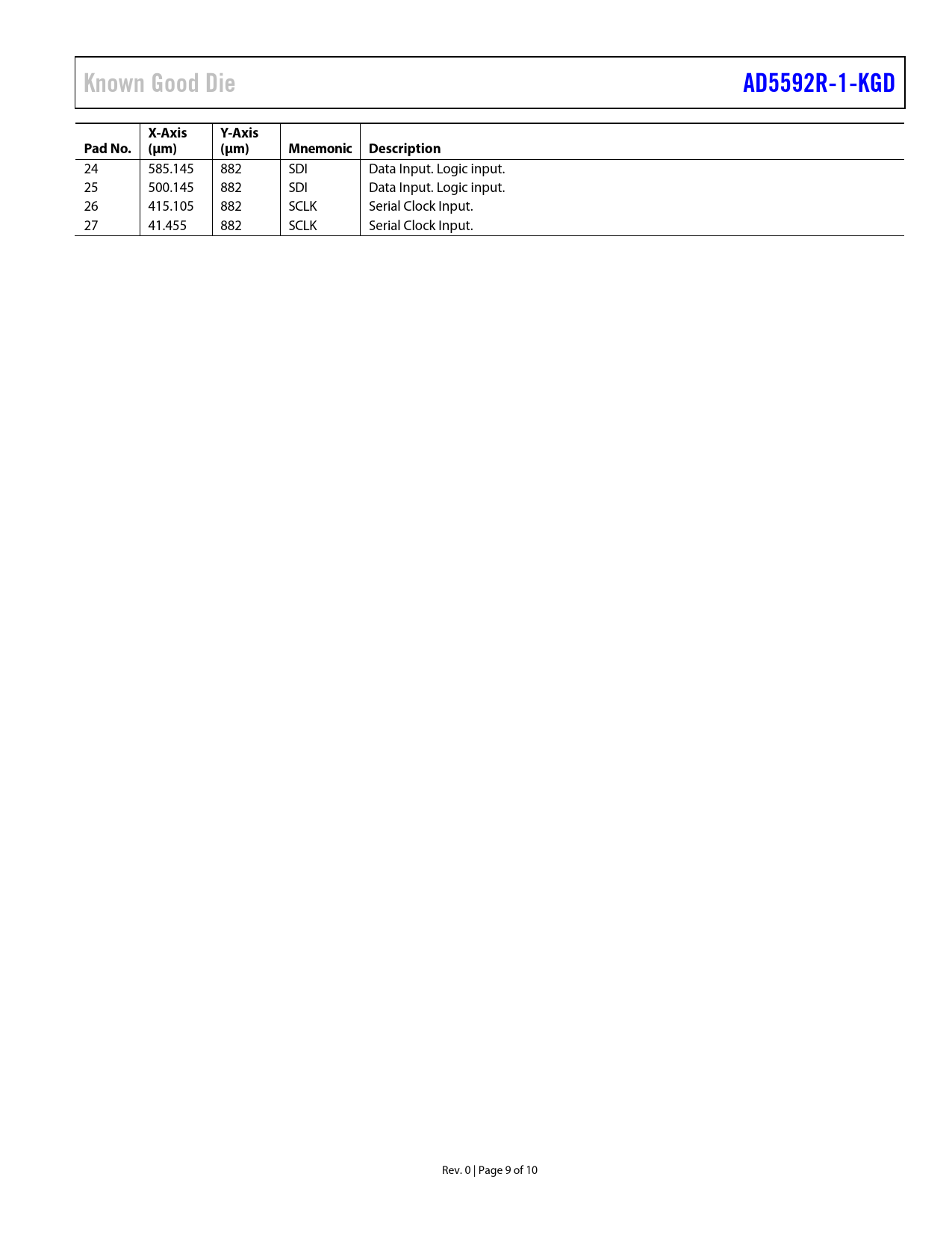 24 585.145 882 SDI Data Input. Logic input. 25 500.145 882 SDI Data Input. Logic input. 26 415.105 882 SCLK Serial Clock Input. 27 41.455 882 SCLK Serial Clock Input. Rev. 0 | Page 9 of 10 Document Outline Features Applications General Description Functional Block Diagram Revision History Specifications Timing Characteristics Absolute Maximum Ratings ESD Caution Pin Configuration and Function Descriptions Outline Dimensions Die Specifications and Assembly Recommendations Ordering Guide
