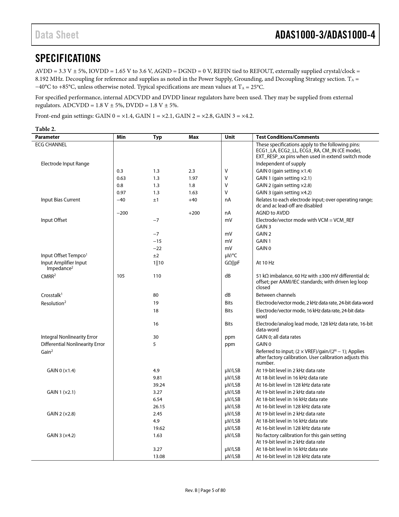 link to page 78 link to page 9 link to page 9 link to page 9 link to page 9 link to page 9 link to page 9 Data SheetADAS1000-3/ADAS1000-4SPECIFICATIONS AVDD = 3.3 V ± 5%, IOVDD = 1.65 V to 3.6 V, AGND = DGND = 0 V, REFIN tied to REFOUT, externally supplied crystal/clock = 8.192 MHz. Decoupling for reference and supplies as noted in the Power Supply, Grounding, and Decoupling Strategy section. TA = −40°C to +85°C, unless otherwise noted. Typical specifications are mean values at TA = 25°C. For specified performance, internal ADCVDD and DVDD linear regulators have been used. They may be supplied from external regulators. ADCVDD = 1.8 V ± 5%, DVDD = 1.8 V ± 5%. Front-end gain settings: GAIN 0 = ×1.4, GAIN 1 = ×2.1, GAIN 2 = ×2.8, GAIN 3 = ×4.2. Table 2. ParameterMinTypMaxUnitTest Conditions/Comments ECG CHANNEL These specifications apply to the following pins: ECG1_LA, ECG2_LL, ECG3_RA, CM_IN (CE mode), EXT_RESP_xx pins when used in extend switch mode Electrode Input Range Independent of supply 0.3 1.3 2.3 V GAIN 0 (gain setting ×1.4) 0.63 1.3 1.97 V GAIN 1 (gain setting ×2.1) 0.8 1.3 1.8 V GAIN 2 (gain setting ×2.8) 0.97 1.3 1.63 V GAIN 3 (gain setting ×4.2) Input Bias Current −40 ±1 +40 nA Relates to each electrode input; over operating range; dc and ac lead-off are disabled −200 +200 nA AGND to AVDD Input Offset −7 mV Electrode/vector mode with VCM = VCM_REF GAIN 3 −7 mV GAIN 2 −15 mV GAIN 1 −22 mV GAIN 0 Input Offset Tempco1 ±2 μV/°C Input Amplifier Input 1||10 GΩ||pF At 10 Hz Impedance2 CMRR2 105 110 dB 51 kΩ imbalance, 60 Hz with ±300 mV differential dc offset; per AAMI/IEC standards; with driven leg loop closed Crosstalk1 80 dB Between channels Resolution2 19 Bits Electrode/vector mode, 2 kHz data rate, 24-bit data-word 18 Bits Electrode/vector mode, 16 kHz data rate, 24-bit data- word 16 Bits Electrode/analog lead mode, 128 kHz data rate, 16-bit data-word Integral Nonlinearity Error 30 ppm GAIN 0; all data rates Differential Nonlinearity Error 5 ppm GAIN 0 Gain2 Referred to input; (2 × VREF)/gain/(2N − 1); Applies after factory calibration. User calibration adjusts this number. GAIN 0 (×1.4) 4.9 µV/LSB At 19-bit level in 2 kHz data rate 9.81 μV/LSB At 18-bit level in 16 kHz data rate 39.24 μV/LSB At 16-bit level in 128 kHz data rate GAIN 1 (×2.1) 3.27 μV/LSB At 19-bit level in 2 kHz data rate 6.54 μV/LSB At 18-bit level in 16 kHz data rate 26.15 μV/LSB At 16-bit level in 128 kHz data rate GAIN 2 (×2.8) 2.45 μV/LSB At 19-bit level in 2 kHz data rate 4.9 μV/LSB At 18-bit level in 16 kHz data rate 19.62 μV/LSB At 16-bit level in 128 kHz data rate GAIN 3 (×4.2) 1.63 μV/LSB No factory calibration for this gain setting At 19-bit level in 2 kHz data rate 3.27 μV/LSB At 18-bit level in 16 kHz data rate 13.08 μV/LSB At 16-bit level in 128 kHz data rate Rev. B | Page 5 of 80 Document Outline FEATURES APPLICATIONS GENERAL DESCRIPTION TABLE OF CONTENTS REVISION HISTORY FUNCTIONAL BLOCK DIAGRAM SPECIFICATIONS NOISE PERFORMANCE TIMING CHARACTERISTICS Standard Serial Interface Secondary Serial Interface (Master Interface for Customer-Based Digital Pace Algorithm) ADAS1000-4 Only ABSOLUTE MAXIMUM RATINGS THERMAL RESISTANCE ESD CAUTION PIN CONFIGURATIONS AND FUNCTION DESCRIPTIONS TYPICAL PERFORMANCE CHARACTERISTICS APPLICATIONS INFORMATION OVERVIEW ECG INPUTS—ELECTRODES/LEADS ECG CHANNEL ELECTRODE/LEAD FORMATION AND INPUT STAGE CONFIGURATION Analog Lead Mode and Calculation Digital Lead Mode and Calculation Electrode Mode: Single-Ended Input Electrode Configuration Electrode Mode: Common Electrode A and Common Electrode B Configurations DEFIBRILLATOR PROTECTION ESIS FILTERING ECG PATH INPUT MULTIPLEXING COMMON-MODE SELECTION AND AVERAGING WILSON CENTRAL TERMINAL (WCT) RIGHT LEG DRIVE/REFERENCE DRIVE CALIBRATION DAC GAIN CALIBRATION LEAD-OFF DETECTION DC Lead-Off Detection DC Lead-Off and High Gains AC Lead-Off Detection ADC Out of Range SHIELD DRIVER RESPIRATION (ADAS1000-4 MODEL ONLY) Internal Respiration Capacitors External Respiration Path External Respiration Capacitors Respiration Carrier Frequency EVALUATING RESPIRATION PERFORMANCE PACING ARTIFACT DETECTION FUNCTION (ADAS1000-4 ONLY) Choice of Leads Detection Algorithm Overview Pace Edge Threshold Pace Level Threshold Pace Amplitude Threshold Pace Validation Filters Pace Width Filter BIVENTRICULAR PACERS PACE DETECTION MEASUREMENTS EVALUATING PACE DETECTION PERFORMANCE PACE WIDTH PACE LATENCY PACE DETECTION VIA SECONDARY SERIAL INTERFACE FILTERING VOLTAGE REFERENCE GANG MODE OPERATION Master/Slave Synchronizing Devices Calibration Common Mode Right Leg Drive Sequencing Devices into Gang Mode INTERFACING IN GANG MODE SERIAL INTERFACES STANDARD SERIAL INTERFACE Write Mode Write/Read Data Format Data Frames/Packets Read Mode Serial Clock Rate Data Rate and Skip Mode Data Ready (DRDY) Detecting Missed Conversion Data CRC Word Clocks SECONDARY SERIAL INTERFACE RESET PD FUNCTION SPI OUTPUT FRAME STRUCTURE (ECG AND STATUS DATA) SPI REGISTER DEFINITIONS AND MEMORY MAP CONTROL REGISTERS DETAILS INTERFACE EXAMPLES Example 1: Initialize the Device for ECG Capture and Start Streaming Data Example 2: Enable Respiration and Stream Conversion Data (Applies to ADAS1000-4 Only) Example 3: DC Lead-Off and Stream Conversion Data Example 4: Configure 150 Hz Test Tone Sine Wave on Each ECG Channel and Stream Conversion Data Example 5: Enable Pace Detection and Stream Conversion Data (Applies to ADAS1000-4 Only) Example 6: Writing to Master and Slave Devices and Streaming Conversion Data Slave Configuration (ADAS1000-3) Master Configuration (ADAS1000) SOFTWARE FLOWCHART POWER SUPPLY, GROUNDING, AND DECOUPLING STRATEGY AVDD ADCVDD AND DVDD SUPPLIES UNUSED PINS/PATHS LAYOUT RECOMMENDATIONS OUTLINE DIMENSIONS ORDERING GUIDE