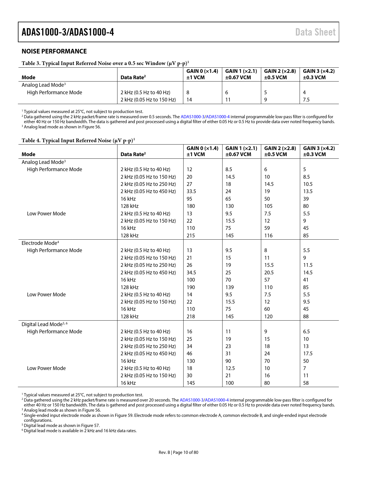 link to page 30 link to page 30 link to page 31 link to page 30 ADAS1000-3/ADAS1000-4Data SheetNOISE PERFORMANCETable 3. Typical Input Referred Noise over a 0.5 sec Window (μV p-p)1GAIN 0 (×1.4) GAIN 1 (×2.1) GAIN 2 (×2.8) GAIN 3 (×4.2)ModeData Rate2±1 VCM±0.67 VCM±0.5 VCM±0.3 VCM Analog Lead Mode3 High Performance Mode 2 kHz (0.5 Hz to 40 Hz) 8 6 5 4 2 kHz (0.05 Hz to 150 Hz) 14 11 9 7.5 1 Typical values measured at 25°C, not subject to production test. 2 Data gathered using the 2 kHz packet/frame rate is measured over 0.5 seconds. The ADAS1000-3/ADAS1000-4 internal programmable low-pass filter is configured for either 40 Hz or 150 Hz bandwidth. The data is gathered and post processed using a digital filter of either 0.05 Hz or 0.5 Hz to provide data over noted frequency bands. 3 Analog lead mode as shown in Figure 56. Table 4. Typical Input Referred Noise (μV p-p)1GAIN 0 (×1.4) GAIN 1 (×2.1) GAIN 2 (×2.8) GAIN 3 (×4.2)ModeData Rate2±1 VCM±0.67 VCM±0.5 VCM±0.3 VCM Analog Lead Mode3 High Performance Mode 2 kHz (0.5 Hz to 40 Hz) 12 8.5 6 5 2 kHz (0.05 Hz to 150 Hz) 20 14.5 10 8.5 2 kHz (0.05 Hz to 250 Hz) 27 18 14.5 10.5 2 kHz (0.05 Hz to 450 Hz) 33.5 24 19 13.5 16 kHz 95 65 50 39 128 kHz 180 130 105 80 Low Power Mode 2 kHz (0.5 Hz to 40 Hz) 13 9.5 7.5 5.5 2 kHz (0.05 Hz to 150 Hz) 22 15.5 12 9 16 kHz 110 75 59 45 128 kHz 215 145 116 85 Electrode Mode4 High Performance Mode 2 kHz (0.5 Hz to 40 Hz) 13 9.5 8 5.5 2 kHz (0.05 Hz to 150 Hz) 21 15 11 9 2 kHz (0.05 Hz to 250 Hz) 26 19 15.5 11.5 2 kHz (0.05 Hz to 450 Hz) 34.5 25 20.5 14.5 16 kHz 100 70 57 41 128 kHz 190 139 110 85 Low Power Mode 2 kHz (0.5 Hz to 40 Hz) 14 9.5 7.5 5.5 2 kHz (0.05 Hz to 150 Hz) 22 15.5 12 9.5 16 kHz 110 75 60 45 128 kHz 218 145 120 88 Digital Lead Mode5, 6 High Performance Mode 2 kHz (0.5 Hz to 40 Hz) 16 11 9 6.5 2 kHz (0.05 Hz to 150 Hz) 25 19 15 10 2 kHz (0.05 Hz to 250 Hz) 34 23 18 13 2 kHz (0.05 Hz to 450 Hz) 46 31 24 17.5 16 kHz 130 90 70 50 Low Power Mode 2 kHz (0.5 Hz to 40 Hz) 18 12.5 10 7 2 kHz (0.05 Hz to 150 Hz) 30 21 16 11 16 kHz 145 100 80 58 1 Typical values measured at 25°C, not subject to production test. 2 Data gathered using the 2 kHz packet/frame rate is measured over 20 seconds. The ADAS1000-3/ADAS1000-4 internal programmable low-pass filter is configured for either 40 Hz or 150 Hz bandwidth. The data is gathered and post processed using a digital filter of either 0.05 Hz or 0.5 Hz to provide data over noted frequency bands. 3 Analog lead mode as shown in Figure 56. 4 Single-ended input electrode mode as shown in Figure 59. Electrode mode refers to common electrode A, common electrode B, and single-ended input electrode configurations. 5 Digital lead mode as shown in Figure 57. 6 Digital lead mode is available in 2 kHz and 16 kHz data rates. Rev. B | Page 10 of 80 Document Outline FEATURES APPLICATIONS GENERAL DESCRIPTION TABLE OF CONTENTS REVISION HISTORY FUNCTIONAL BLOCK DIAGRAM SPECIFICATIONS NOISE PERFORMANCE TIMING CHARACTERISTICS Standard Serial Interface Secondary Serial Interface (Master Interface for Customer-Based Digital Pace Algorithm) ADAS1000-4 Only ABSOLUTE MAXIMUM RATINGS THERMAL RESISTANCE ESD CAUTION PIN CONFIGURATIONS AND FUNCTION DESCRIPTIONS TYPICAL PERFORMANCE CHARACTERISTICS APPLICATIONS INFORMATION OVERVIEW ECG INPUTS—ELECTRODES/LEADS ECG CHANNEL ELECTRODE/LEAD FORMATION AND INPUT STAGE CONFIGURATION Analog Lead Mode and Calculation Digital Lead Mode and Calculation Electrode Mode: Single-Ended Input Electrode Configuration Electrode Mode: Common Electrode A and Common Electrode B Configurations DEFIBRILLATOR PROTECTION ESIS FILTERING ECG PATH INPUT MULTIPLEXING COMMON-MODE SELECTION AND AVERAGING WILSON CENTRAL TERMINAL (WCT) RIGHT LEG DRIVE/REFERENCE DRIVE CALIBRATION DAC GAIN CALIBRATION LEAD-OFF DETECTION DC Lead-Off Detection DC Lead-Off and High Gains AC Lead-Off Detection ADC Out of Range SHIELD DRIVER RESPIRATION (ADAS1000-4 MODEL ONLY) Internal Respiration Capacitors External Respiration Path External Respiration Capacitors Respiration Carrier Frequency EVALUATING RESPIRATION PERFORMANCE PACING ARTIFACT DETECTION FUNCTION (ADAS1000-4 ONLY) Choice of Leads Detection Algorithm Overview Pace Edge Threshold Pace Level Threshold Pace Amplitude Threshold Pace Validation Filters Pace Width Filter BIVENTRICULAR PACERS PACE DETECTION MEASUREMENTS EVALUATING PACE DETECTION PERFORMANCE PACE WIDTH PACE LATENCY PACE DETECTION VIA SECONDARY SERIAL INTERFACE FILTERING VOLTAGE REFERENCE GANG MODE OPERATION Master/Slave Synchronizing Devices Calibration Common Mode Right Leg Drive Sequencing Devices into Gang Mode INTERFACING IN GANG MODE SERIAL INTERFACES STANDARD SERIAL INTERFACE Write Mode Write/Read Data Format Data Frames/Packets Read Mode Serial Clock Rate Data Rate and Skip Mode Data Ready (DRDY) Detecting Missed Conversion Data CRC Word Clocks SECONDARY SERIAL INTERFACE RESET PD FUNCTION SPI OUTPUT FRAME STRUCTURE (ECG AND STATUS DATA) SPI REGISTER DEFINITIONS AND MEMORY MAP CONTROL REGISTERS DETAILS INTERFACE EXAMPLES Example 1: Initialize the Device for ECG Capture and Start Streaming Data Example 2: Enable Respiration and Stream Conversion Data (Applies to ADAS1000-4 Only) Example 3: DC Lead-Off and Stream Conversion Data Example 4: Configure 150 Hz Test Tone Sine Wave on Each ECG Channel and Stream Conversion Data Example 5: Enable Pace Detection and Stream Conversion Data (Applies to ADAS1000-4 Only) Example 6: Writing to Master and Slave Devices and Streaming Conversion Data Slave Configuration (ADAS1000-3) Master Configuration (ADAS1000) SOFTWARE FLOWCHART POWER SUPPLY, GROUNDING, AND DECOUPLING STRATEGY AVDD ADCVDD AND DVDD SUPPLIES UNUSED PINS/PATHS LAYOUT RECOMMENDATIONS OUTLINE DIMENSIONS ORDERING GUIDE