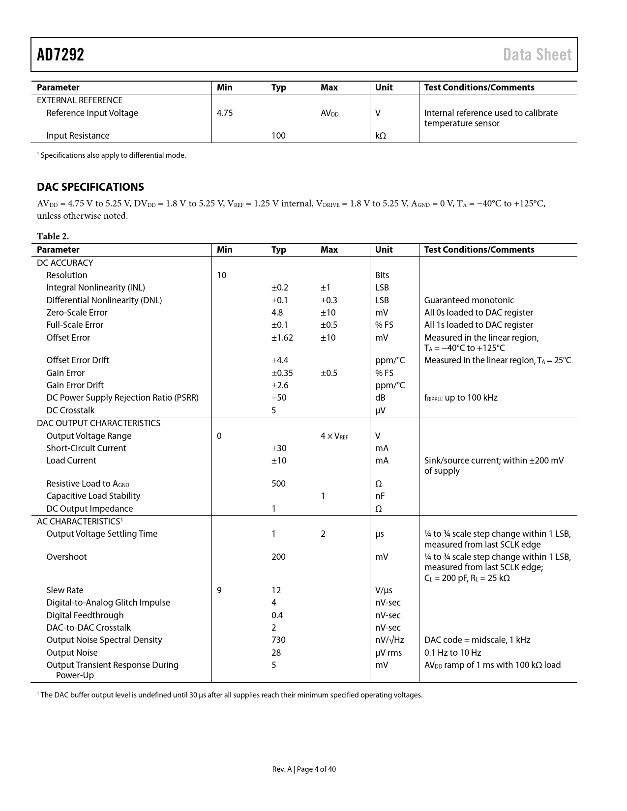 AD7292 Data Sheet Parameter Min Typ Max Unit Test Conditions/Comments DAC SPECIFICATIONS Table 2 Parameter