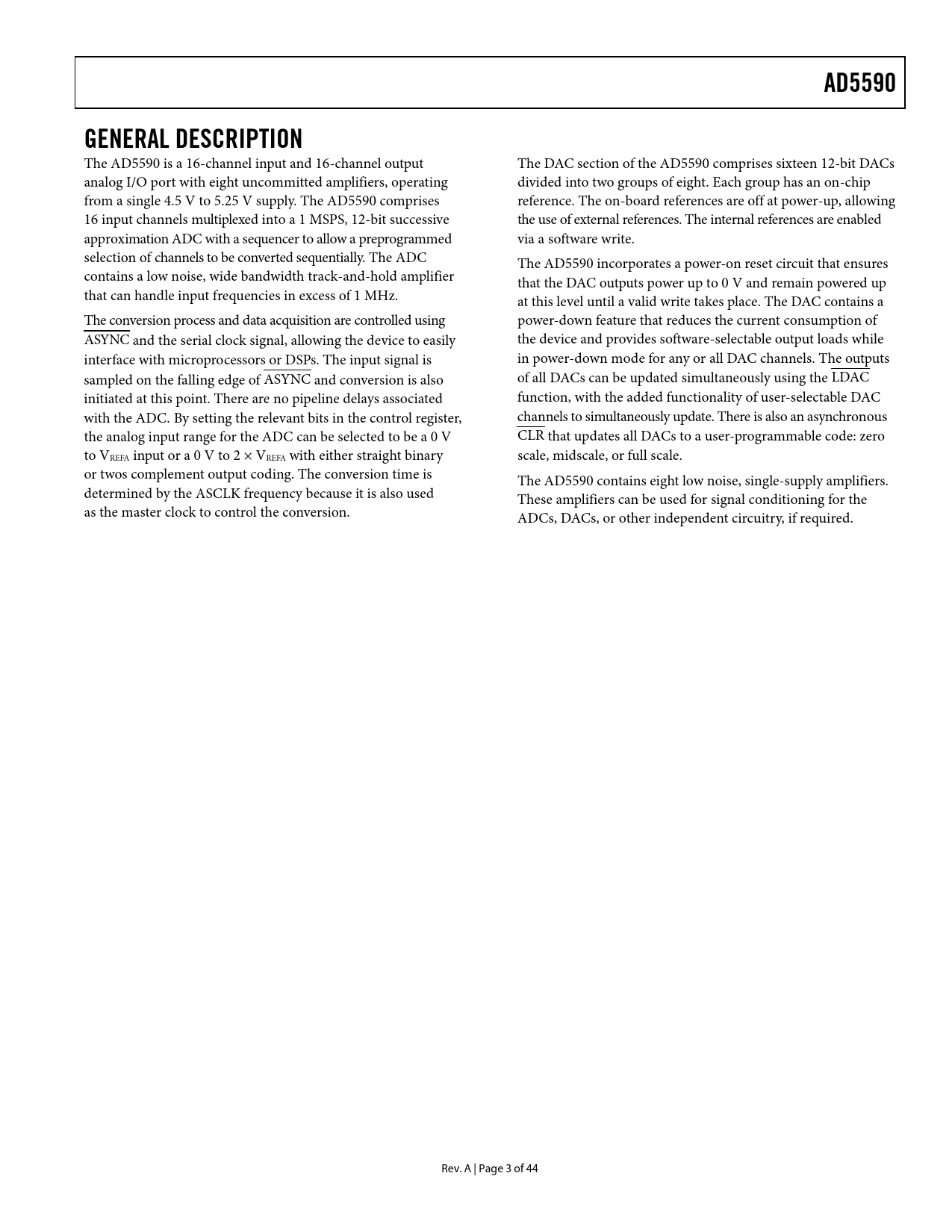 AD5590GENERAL DESCRIPTION The AD5590 is a 16-channel input and 16-channel output The DAC section of the AD5590 comprises sixteen 12-bit DACs analog I/O port with eight uncommitted amplifiers, operating divided into two groups of eight. Each group has an on-chip from a single 4.5 V to 5.25 V supply. The AD5590 comprises reference. The on-board references are off at power-up, allowing 16 input channels multiplexed into a 1 MSPS, 12-bit successive the use of external references. The internal references are enabled approximation ADC with a sequencer to al ow a preprogrammed via a software write. selection of channels to be converted sequential y. The ADC The AD5590 incorporates a power-on reset circuit that ensures contains a low noise, wide bandwidth track-and-hold amplifier that the DAC outputs power up to 0 V and remain powered up that can handle input frequencies in excess of 1 MHz. at this level until a valid write takes place. The DAC contains a The conversion process and data acquisition are controlled using power-down feature that reduces the current consumption of ASYNC and the serial clock signal, allowing the device to easily the device and provides software-selectable output loads while interface with microprocessors or DSPs. The input signal is in power-down mode for any or all DAC channels. The outputs sampled on the falling edge of ASYNC and conversion is also of all DACs can be updated simultaneously using the LDAC initiated at this point. There are no pipeline delays associated function, with the added functionality of user-selectable DAC with the ADC. By setting the relevant bits in the control register, channels to simultaneously update. There is also an asynchronous the analog input range for the ADC can be selected to be a 0 V CLR that updates al DACs to a user-programmable code: zero to VREFA input or a 0 V to 2 × VREFA with either straight binary scale, midscale, or full scale. or twos complement output coding. The conversion time is The AD5590 contains eight low noise, single-supply amplifiers. determined by the ASCLK frequency because it is also used These amplifiers can be used for signal conditioning for the as the master clock to control the conversion. ADCs, DACs, or other independent circuitry, if required. Rev. A | Page 3 of 44 Document Outline Features Applications Functional Block Diagram Revision History General Description Specifications ADC Specifications DAC Specifications DAC AC Characteristics Operational Amplifier Specifications Timing Specifications ADC Timing Characteristics DAC Timing Characteristics Absolute Maximum Ratings Thermal Resistance ESD Caution Pin Configuration and Function Descriptions Typical Performance Characteristics DAC ADC Amplifier Terminology Theory of Operation DAC Section Resistor String DAC Internal Reference DAC Output Amplifier ADC Section ADC Converter Operation Analog Input ADC Transfer Function Analog Input Selection Digital Inputs VDRIVE Reference Section Amplifier Section Serial Interface Accessing the DAC Block DAC Input Shift Register Interrupt DAC Internal Reference Register DAC Power-On Reset DAC Power-Down Modes DAC Clear Code Register LDAC Function Accessing the ADC Block ADC Modes of Operation Normal Mode (PM1 = PM0 = 1) Full Shutdown (PM1 = 1, PM0 = 0) AutoShutdown (PM1 = 0, PM0 = 1) Autostandby (PM1 = PM0 = 0) Powering Up the ADC Interfacing to the ADC ADC Control Register ADC Sequencer Operation ADC Shadow Register ADC Power vs. Throughput Rate Outline Dimensions Ordering Guide