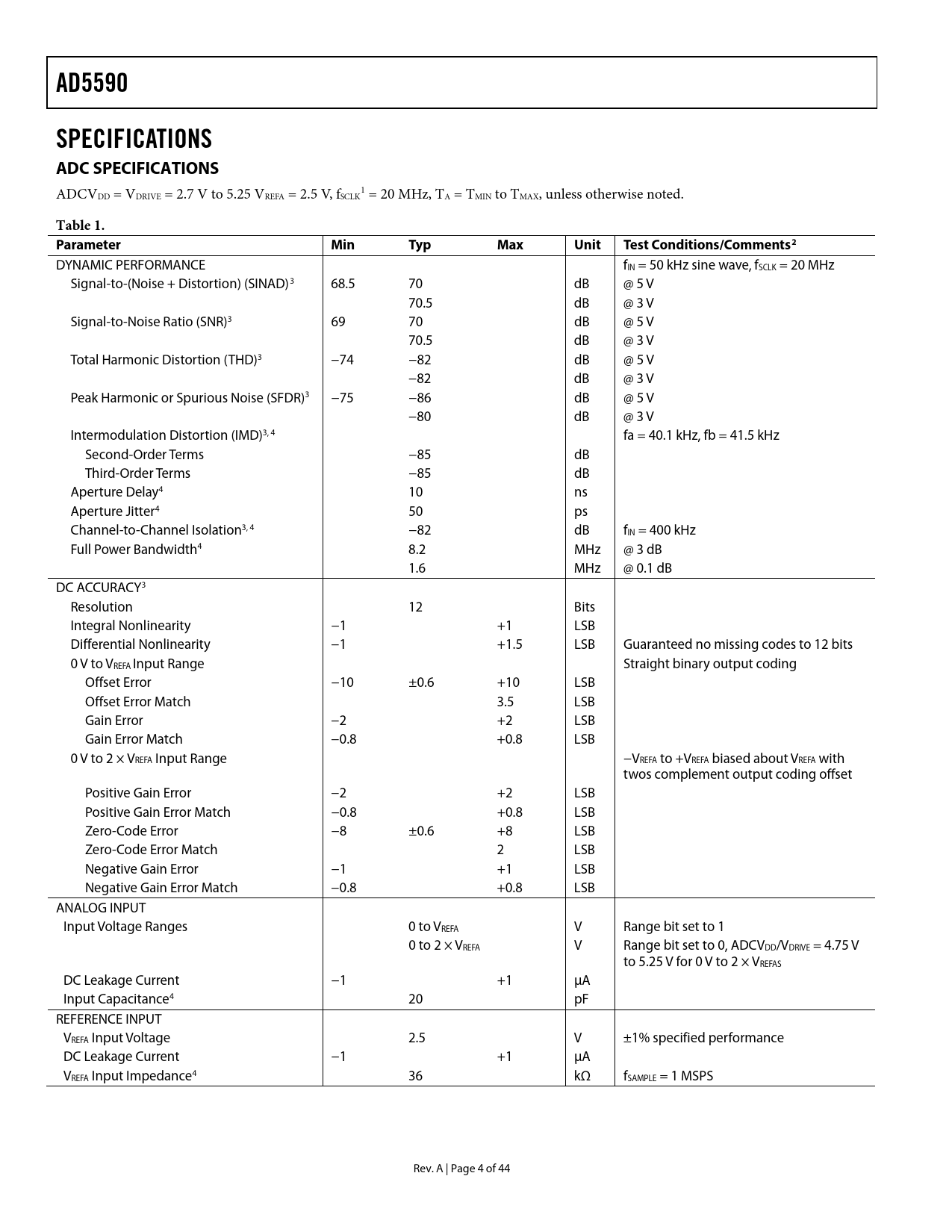 Seiten / Seite44 / 4 — AD5590. SPECIFICATIONS ADC SPECIFICATIONS. Table 1. Parameter. Min. Typ. …