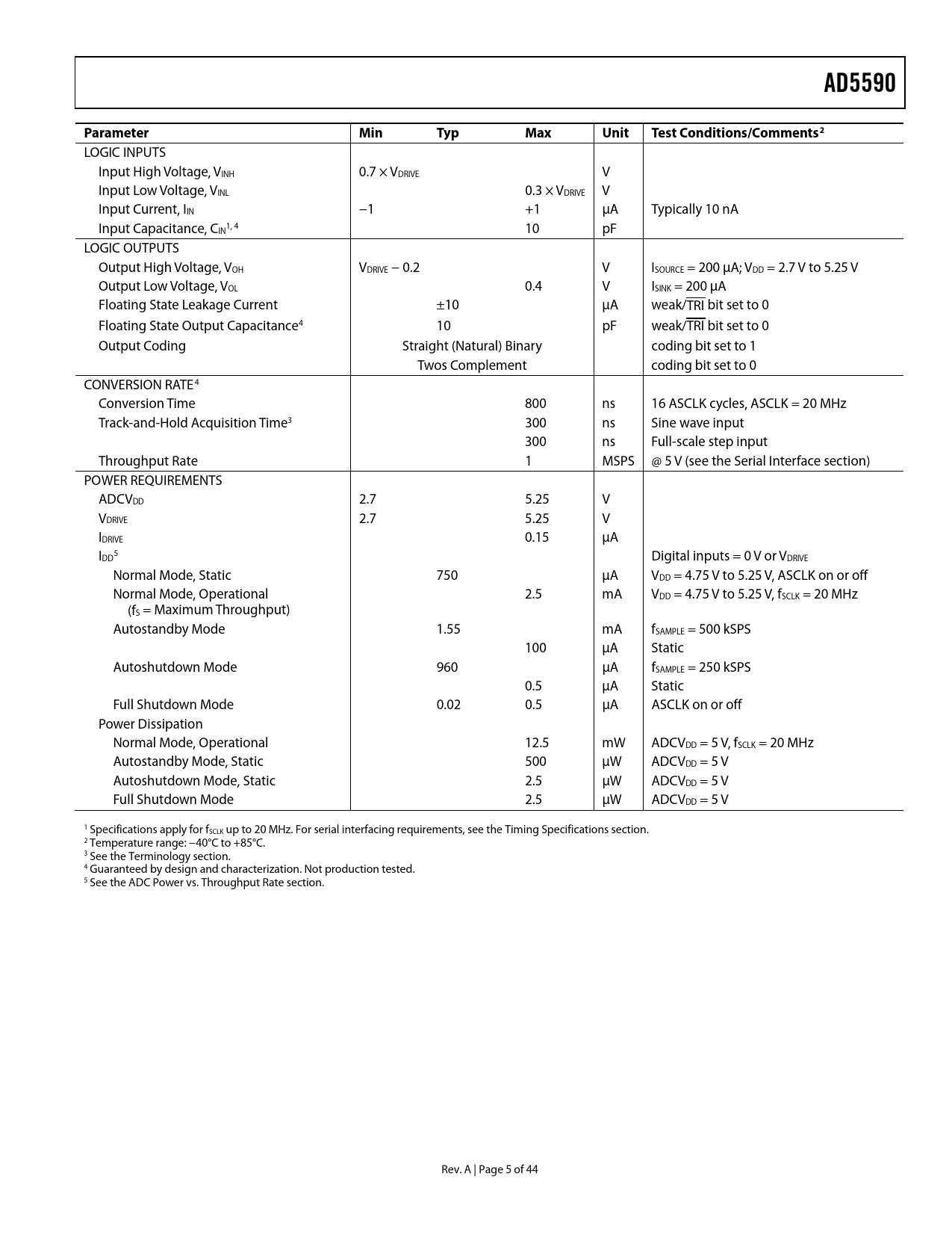 link to page 30 link to page 9 link to page 23 link to page 41 link to page 6 link to page 6 link to page 5 link to page 5 link to page 5 link to page 5 AD5590ParameterMinTypMaxUnitTest Conditions/Comments2 LOGIC INPUTS Input High Voltage, VINH 0.7 × VDRIVE V Input Low Voltage, VINL 0.3 × VDRIVE V Input Current, IIN −1 +1 µA Typically 10 nA Input Capacitance, C 1, 4 IN 10 pF LOGIC OUTPUTS Output High Voltage, VOH VDRIVE − 0.2 V ISOURCE = 200 µA; VDD = 2.7 V to 5.25 V Output Low Voltage, VOL 0.4 V ISINK = 200 µA Floating State Leakage Current ±10 µA weak/TRI bit set to 0 Floating State Output Capacitance4 10 pF weak/TRI bit set to 0 Output Coding Straight (Natural) Binary coding bit set to 1 Twos Complement coding bit set to 0 CONVERSION RATE4 Conversion Time 800 ns 16 ASCLK cycles, ASCLK = 20 MHz Track-and-Hold Acquisition Time3 300 ns Sine wave input 300 ns Full-scale step input Throughput Rate 1 MSPS @ 5 V (see the Serial Interface section) POWER REQUIREMENTS ADCVDD 2.7 5.25 V VDRIVE 2.7 5.25 V IDRIVE 0.15 µA I 5 DD Digital inputs = 0 V or VDRIVE Normal Mode, Static 750 µA VDD = 4.75 V to 5.25 V, ASCLK on or off Normal Mode, Operational 2.5 mA VDD = 4.75 V to 5.25 V, fSCLK = 20 MHz (fS = Maximum Throughput) Autostandby Mode 1.55 mA fSAMPLE = 500 kSPS 100 µA Static Autoshutdown Mode 960 µA fSAMPLE = 250 kSPS 0.5 µA Static Full Shutdown Mode 0.02 0.5 µA ASCLK on or off Power Dissipation Normal Mode, Operational 12.5 mW ADCVDD = 5 V, fSCLK = 20 MHz Autostandby Mode, Static 500 µW ADCVDD = 5 V Autoshutdown Mode, Static 2.5 µW ADCVDD = 5 V Full Shutdown Mode 2.5 µW ADCVDD = 5 V 1 Specifications apply for fSCLK up to 20 MHz. For serial interfacing requirements, see the Timing Specifications section. 2 Temperature range: −40°C to +85°C. 3 See the Terminology section. 4 Guaranteed by design and characterization. Not production tested. 5 See the ADC Power vs. Throughput Rate section. Rev. A | Page 5 of 44 Document Outline Features Applications Functional Block Diagram Revision History General Description Specifications ADC Specifications DAC Specifications DAC AC Characteristics Operational Amplifier Specifications Timing Specifications ADC Timing Characteristics DAC Timing Characteristics Absolute Maximum Ratings Thermal Resistance ESD Caution Pin Configuration and Function Descriptions Typical Performance Characteristics DAC ADC Amplifier Terminology Theory of Operation DAC Section Resistor String DAC Internal Reference DAC Output Amplifier ADC Section ADC Converter Operation Analog Input ADC Transfer Function Analog Input Selection Digital Inputs VDRIVE Reference Section Amplifier Section Serial Interface Accessing the DAC Block DAC Input Shift Register Interrupt DAC Internal Reference Register DAC Power-On Reset DAC Power-Down Modes DAC Clear Code Register LDAC Function Accessing the ADC Block ADC Modes of Operation Normal Mode (PM1 = PM0 = 1) Full Shutdown (PM1 = 1, PM0 = 0) AutoShutdown (PM1 = 0, PM0 = 1) Autostandby (PM1 = PM0 = 0) Powering Up the ADC Interfacing to the ADC ADC Control Register ADC Sequencer Operation ADC Shadow Register ADC Power vs. Throughput Rate Outline Dimensions Ordering Guide