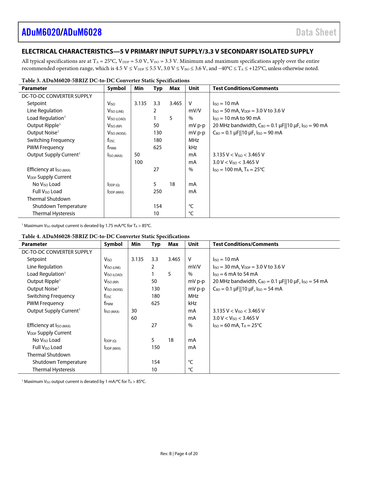 Table 4. ADuM6028-5BRIZ DC-to-DC Converter Static Specifications Parameter Symbol Min Typ Max Unit Test Conditions/Comments