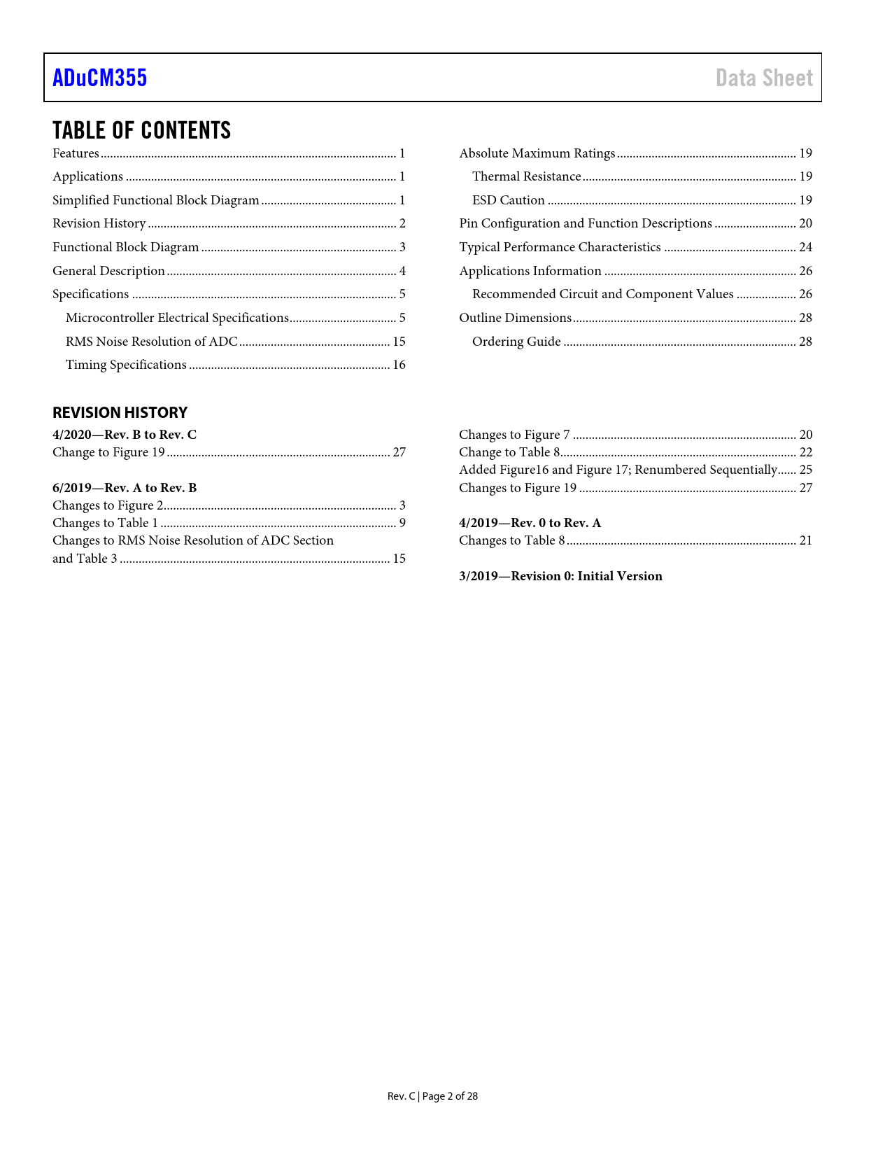 Seiten / Seite28 / 2 — ADuCM355. Data Sheet. TABLE OF CONTENTS. REVISION HISTORY. 4/2020—Rev. B …