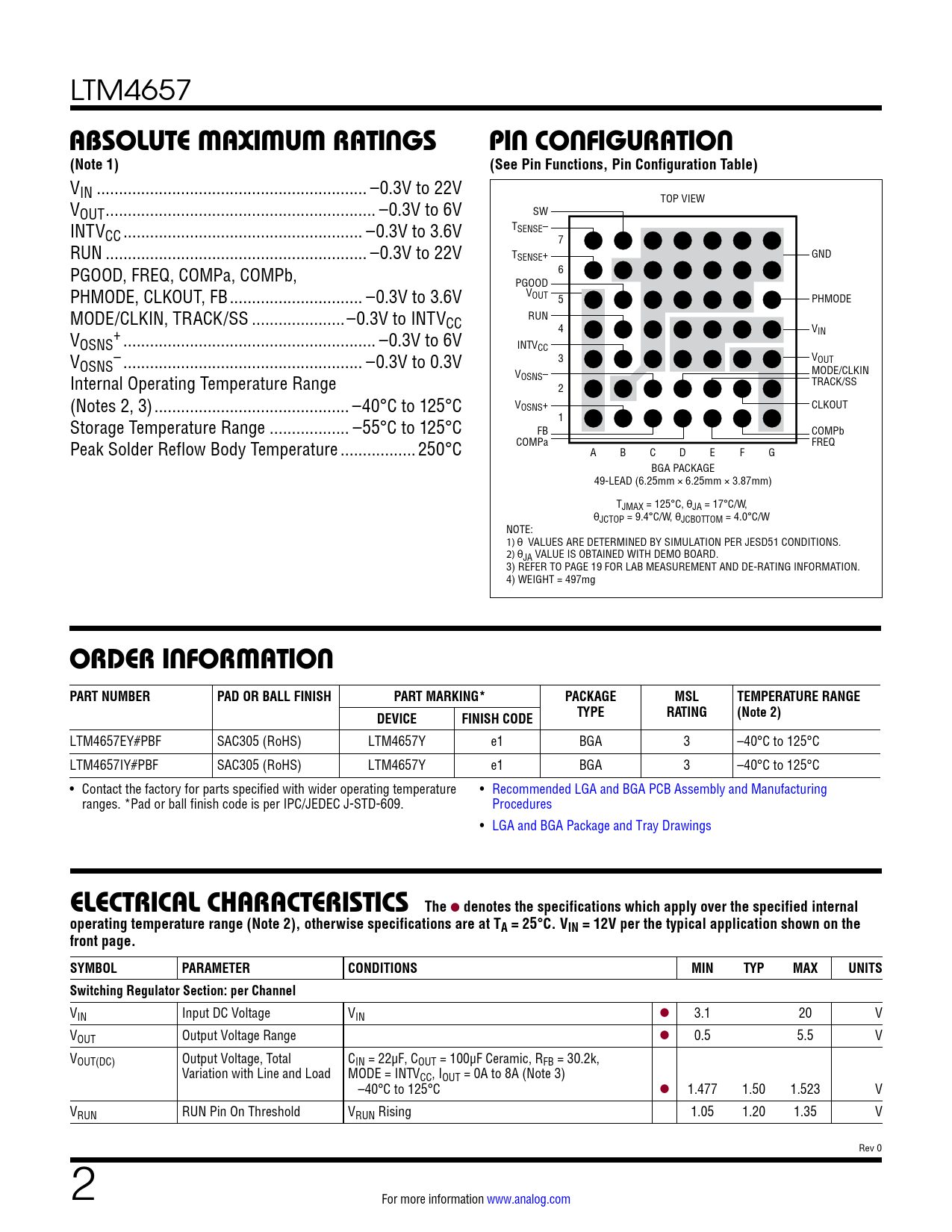 LTM4657EY#PBF SAC305 (RoHS) LTM4657Y e1 BGA 3 –40°C to 125°C LTM4657IY#PBF SAC305 (RoHS) LTM4657Y e1 BGA 3 –40°C to 125°C • Contact the factory for parts specified with wider operating temperature • Recommended LGA and BGA PCB Assembly and Manufacturing ranges. *Pad or ball finish code is per IPC/JEDEC J-STD-609. Procedures • LGA and BGA Package and Tray Drawings