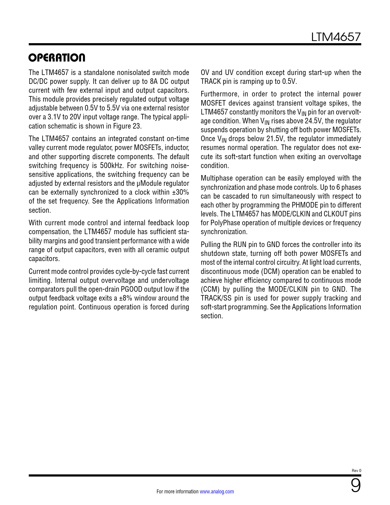 link to page 23 link to page 10 link to page 10 LTM4657 OPERATION The LTM4657 is a standalone nonisolated switch mode OV and UV condition except during start-up when the DC/DC power supply. It can deliver up to 8A DC output TRACK pin is ramping up to 0.5V. current with few external input and output capacitors. Furthermore, in order to protect the internal power This module provides precisely regulated output voltage MOSFET devices against transient voltage spikes, the adjustable between 0.5V to 5.5V via one external resistor LTM4657 constantly monitors the V over a 3.1V to 20V input voltage range. The typical appli- IN pin for an overvolt- age condition. When V cation schematic is shown in Figure 23. IN rises above 24.5V, the regulator suspends operation by shutting off both power MOSFETs. The LTM4657 contains an integrated constant on-time Once VIN drops below 21.5V, the regulator immediately valley current mode regulator, power MOSFETs, inductor, resumes normal operation. The regulator does not exe- and other supporting discrete components. The default cute its soft-start function when exiting an overvoltage switching frequency is 500kHz. For switching noise- condition. sensitive applications, the switching frequency can be Multiphase operation can be easily employed with the adjusted by external resistors and the μModule regulator synchronization and phase mode controls. Up to 6 phases can be externally synchronized to a clock within ±30% can be cascaded to run simultaneously with respect to of the set frequency. See the Applications Information each other by programming the PHMODE pin to different section. levels. The LTM4657 has MODE/CLKIN and CLKOUT pins With current mode control and internal feedback loop for PolyPhase operation of multiple devices or frequency compensation, the LTM4657 module has sufficient sta- synchronization. bility margins and good transient performance with a wide Pulling the RUN pin to GND forces the controller into its range of output capacitors, even with all ceramic output shutdown state, turning off both power MOSFETs and capacitors. most of the internal control circuitry. At light load currents, Current mode control provides cycle-by-cycle fast current discontinuous mode (DCM) operation can be enabled to limiting. Internal output overvoltage and undervoltage achieve higher efficiency compared to continuous mode comparators pull the open-drain PGOOD output low if the (CCM) by pul ing the MODE/CLKIN pin to GND. The output feedback voltage exits a ±8% window around the TRACK/SS pin is used for power supply tracking and regulation point. Continuous operation is forced during soft-start programming. See the Applications Information section. Rev 0 For more information www.analog.com 9 Document Outline Features Applications Typical Application Description Absolute Maximum Ratings Order Information Electrical Characteristics Pin Configuration Typical Performance Characteristics Pin Functions Block Diagram Decoupling Requirements Operation Applications Information Package Description Package Photo Design Resources Related Parts