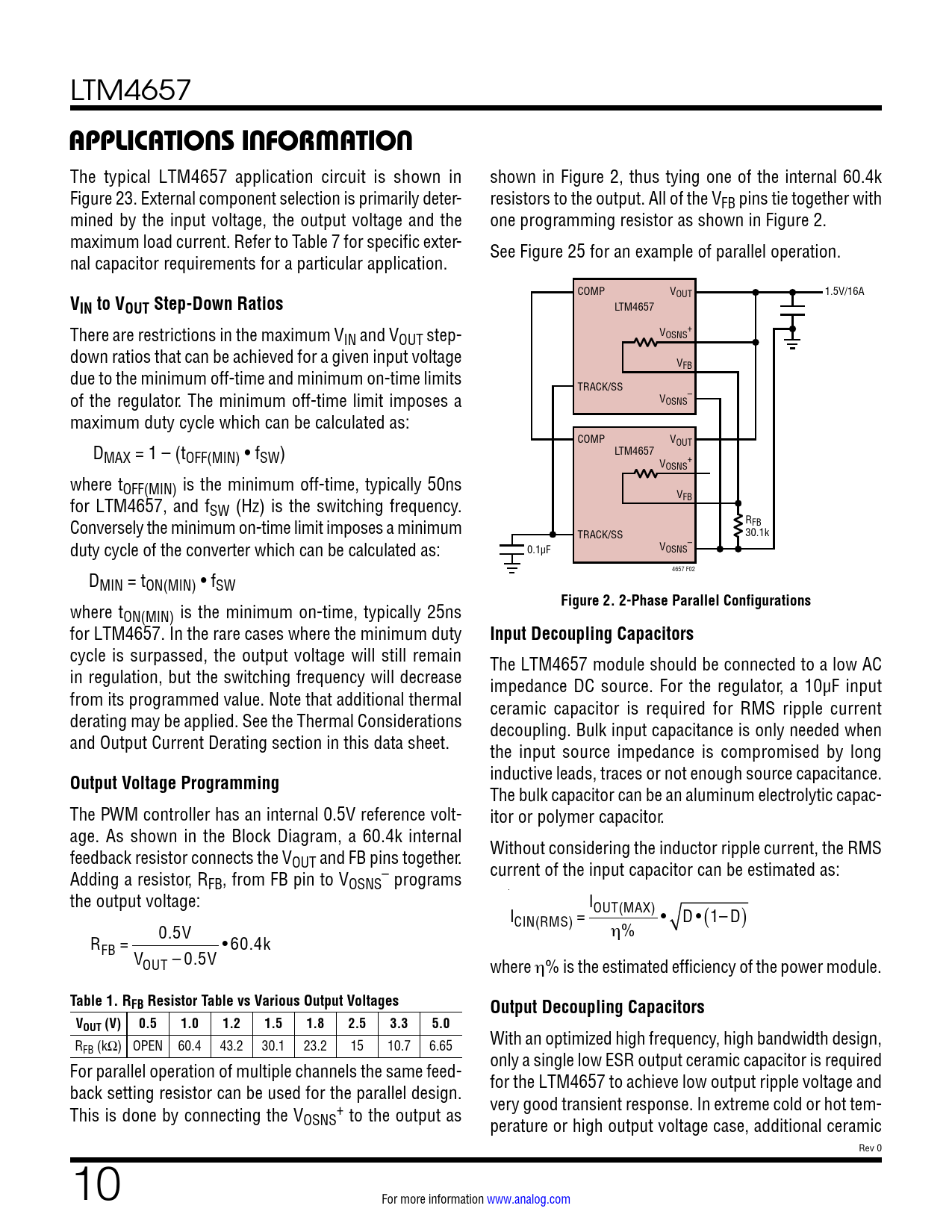 R With an optimized high frequency, high bandwidth design, FB (kΩ) OPEN 60.4 43.2 30.1 23.2 15 10.7 6.65 For parallel operation of multiple channels the same feed- only a single low ESR output ceramic capacitor is required back setting resistor can be used for the parallel design. for the LTM4657 to achieve low output ripple voltage and This is done by connecting the V + very good transient response. In extreme cold or hot tem- OSNS to the output as perature or high output voltage case, additional ceramic Rev 0 10 For more information www.analog.com Document Outline Features Applications Typical Application Description Absolute Maximum Ratings Order Information Electrical Characteristics Pin Configuration Typical Performance Characteristics Pin Functions Block Diagram Decoupling Requirements Operation Applications Information Package Description Package Photo Design Resources Related Parts