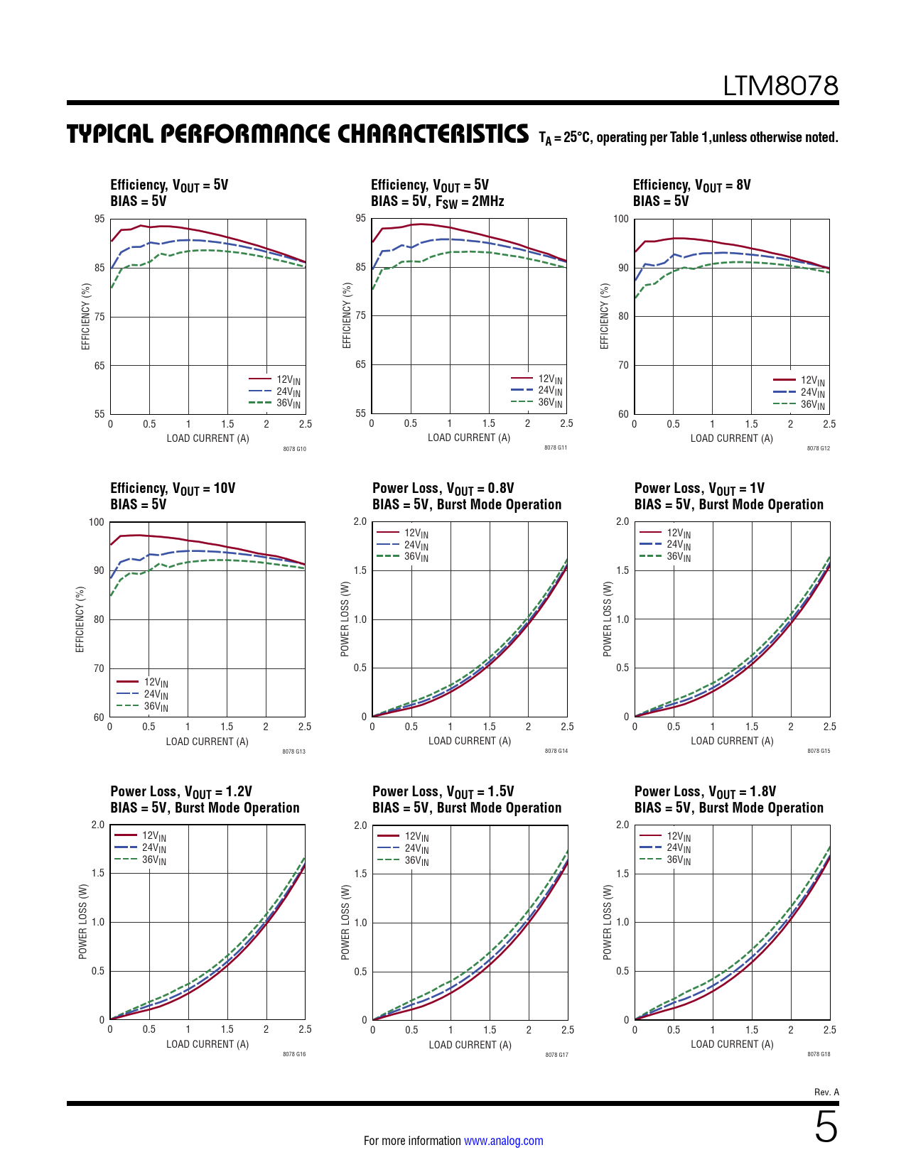 95 95 100 85 85 90 75 75 80 EFFICIENCY (%) EFFICIENCY (%) EFFICIENCY (%) 65 65 70 12VIN 12VIN 12VIN 24VIN 24VIN 24VIN 36VIN 36VIN 36VIN 55 55 60 0 0.5 1 1.5 2 2.5 0 0.5 1 1.5 2 2.5 0 0.5 1 1.5 2 2.5 LOAD CURRENT (A) LOAD CURRENT (A) LOAD CURRENT (A) 8078 G10 8078 G11 8078 G12
