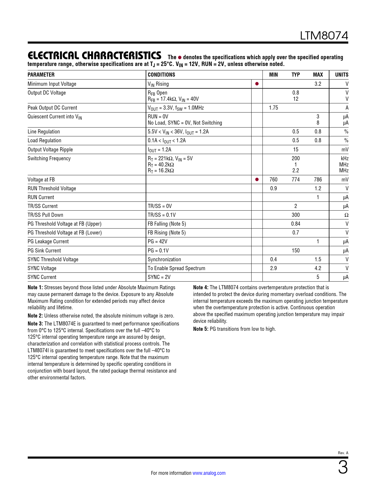PG transitions from low to high. 125°C internal operating temperature range are assured by design, characterization and correlation with statistical process controls. The LTM8074I is guaranteed to meet specifications over the full –40°C to 125°C internal operating temperature range. Note that the maximum internal temperature is determined by specific operating conditions in conjunction with board layout, the rated package thermal resistance and other environmental factors. Rev. A For more information www.analog.com 3 Document Outline Features Applications Typical Application Description Absolute Maximum Ratings Order Information Pin Configuration Electrical Characteristics Typical Performance Characteristics Pin Functions Block Diagram Operation Applications Information Package Photo Package Description Typical Application Related Parts