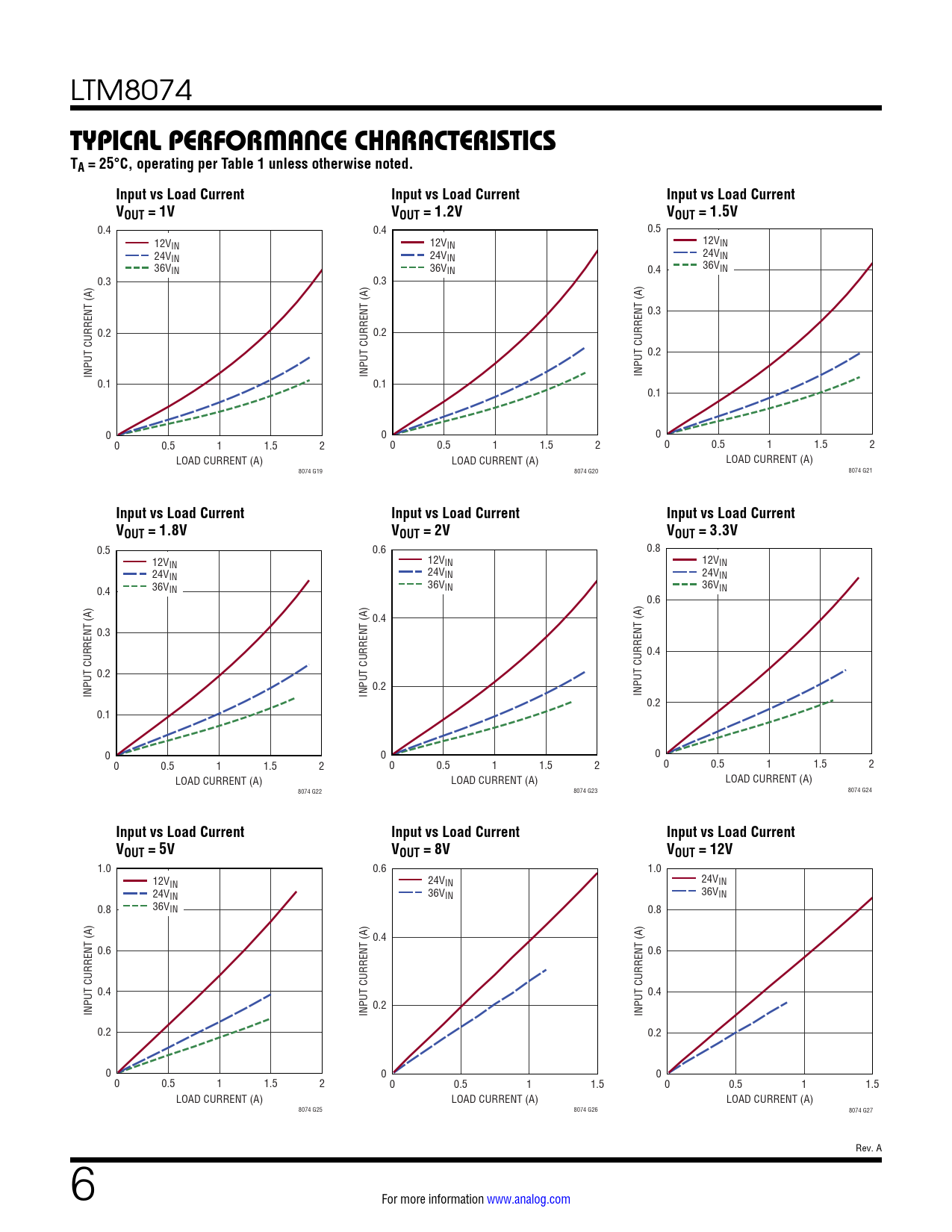 0.5 0.6 0.8 12VIN 12VIN 12VIN 24VIN 24VIN 24VIN 36V 0.4 IN 36VIN 36VIN 0.6 0.4 0.3 0.4 0.2 0.2 INPUT CURRENT (A) INPUT CURRENT (A) INPUT CURRENT (A) 0.2 0.1 0 0 0 0 0.5 1 1.5 2 0 0.5 1 1.5 2 0 0.5 1 1.5 2 LOAD CURRENT (A) LOAD CURRENT (A) LOAD CURRENT (A) 8074 G22 8074 G23 8074 G24