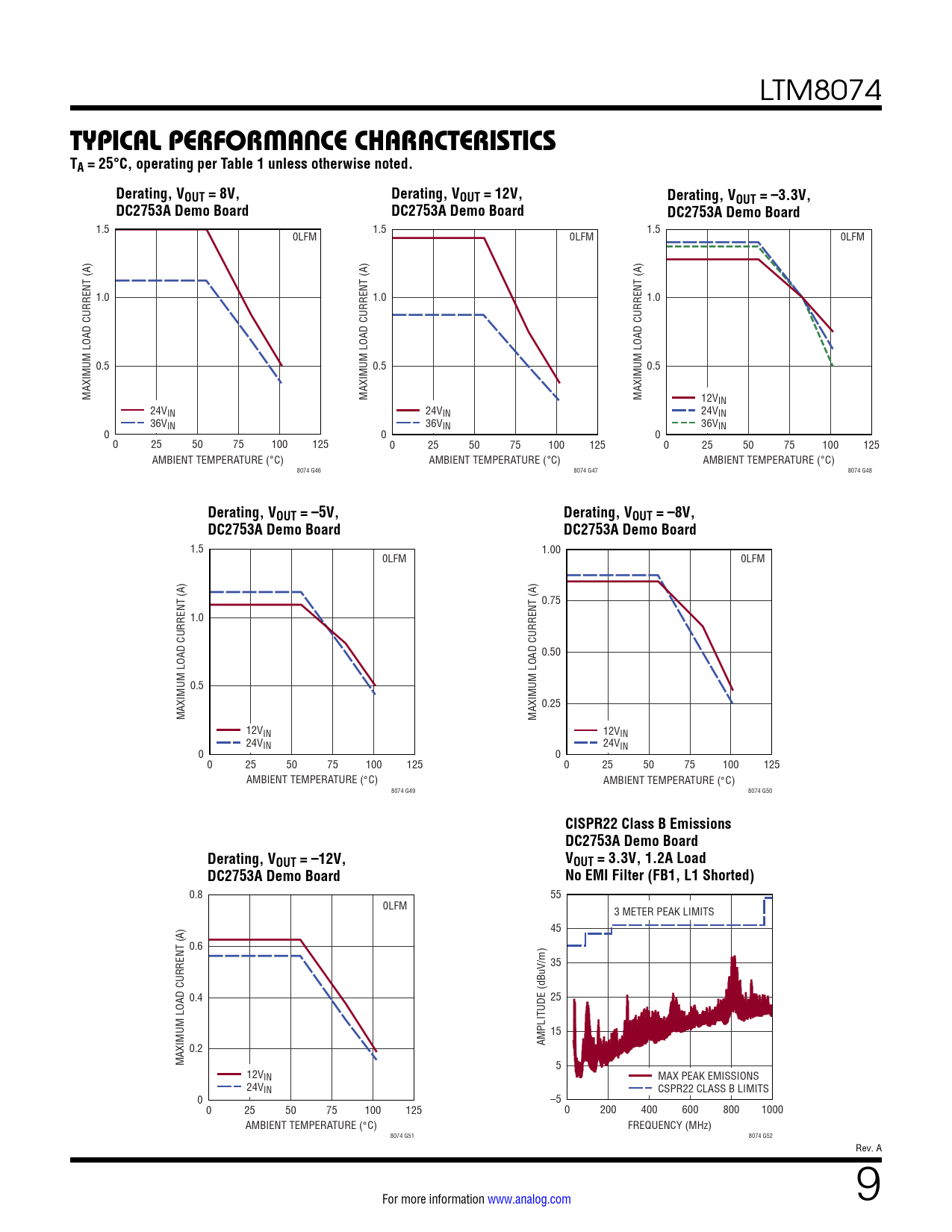 TYPICAL PERFORMANCE CHARACTERISTICS TA = 25°C, operating per Table 1 unless otherwise noted. Derating, VOUT = 8V, Derating, VOUT = 12V, Derating, VOUT = –3.3V, DC2753A Demo Board DC2753A Demo Board DC2753A Demo Board