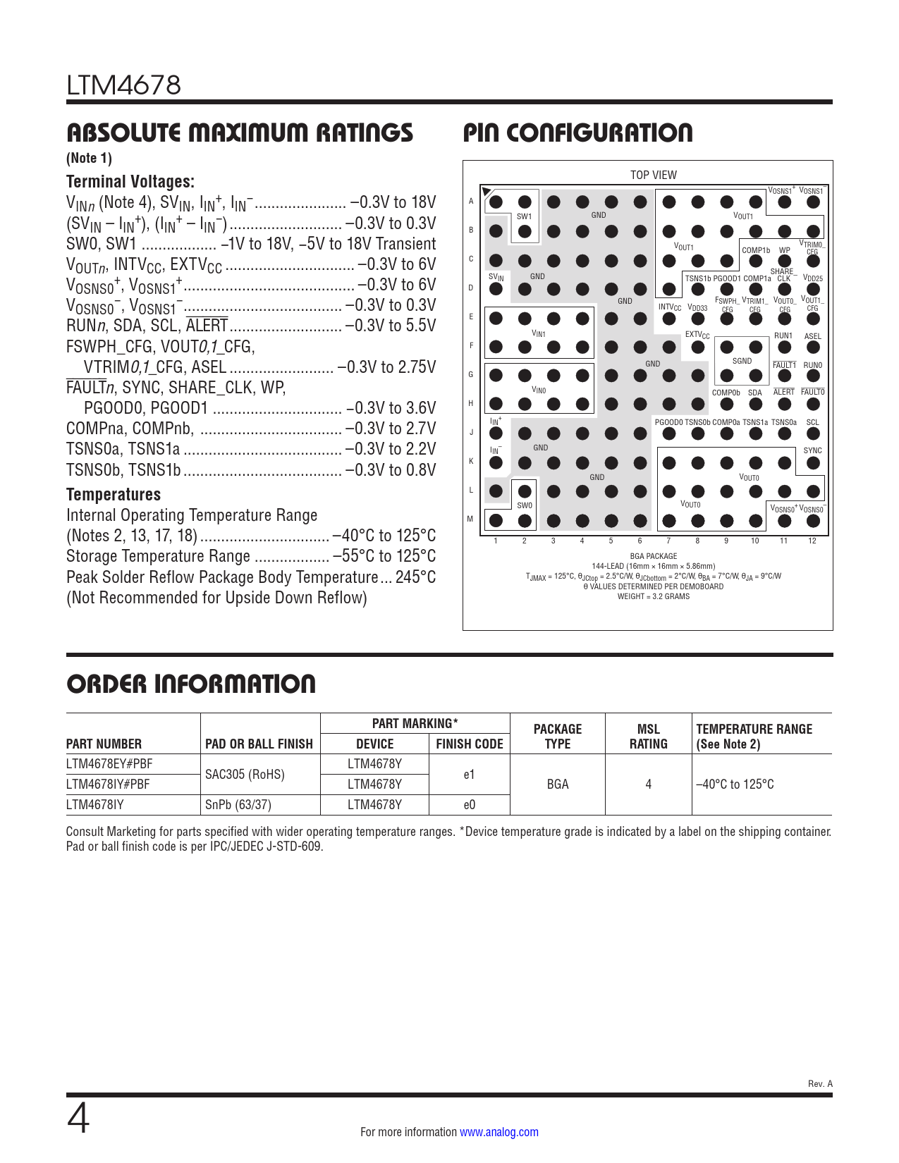 LTM4678 ABSOLUTE MAXIMUM RATINGSPIN CONFIGURATION(Note 1) Terminal Voltages: TOP VIEW V + V – V + − OSNS1 OSNS1 INn (Note 4), SVIN, IIN , IIN .. –0.3V to 18V A (SV + + − SW1 GND VOUT1 IN – IIN ), (IIN – IIN ) ... –0.3V to 0.3V B SW0, SW1 .. −1V to 18V, −5V to 18V Transient V V OUT1 TRIM0_ COMP1b WP CFG V C OUTn, INTVCC, EXTVCC ... –0.3V to 6V SHARE_ V + + SV GND IN TSNS1b PGOOD1 COMP1a CLK VDD25 OSNS0 , VOSNS1 ... –0.3V to 6V D V − − GND F VTRIM1_ V VOUT1_ OSNS0 , VOSNS1 .. –0.3V to 0.3V INTV SWPH_ OUT0_ CC VDD33 CFG CFG CFG CFG RUNn, SDA, SCL, ALERT ... –0.3V to 5.5V E VIN1 EXTV FSWPH_CFG, VOUT0,1_CFG, CC RUN1 ASEL F VTRIM0,1_CFG, ASEL ... –0.3V to 2.75V GND SGND FAULT1 RUN0 G FAULTn, SYNC, SHARE_CLK, WP, VIN0 COMP0b SDA ALERT FAULT0 PGOOD0, PGOOD1 ... −0.3V to 3.6V H COMPna, COMPnb, .. –0.3V to 2.7V I + IN PGOOD0 TSNS0b COMP0a TSNS1a TSNS0a SCL J TSNS0a, TSNS1a .. –0.3V to 2.2V I – GND IN SYNC TSNS0b, TSNS1b .. –0.3V to 0.8V K GND VOUT0 Temperatures L V Internal Operating Temperature Range SW0 OUT0 V + – OSNS0 VOSNS0 M (Notes 2, 13, 17, 18) ... –40°C to 125°C 1 2 3 4 5 6 7 8 9 10 11 12 Storage Temperature Range .. –55°C to 125°C BGA PACKAGE Peak Solder Reflow Package Body Temperature ... 245°C 144-LEAD (16mm × 16mm × 5.86mm) TJMAX = 125°C, θJCtop = 2.5°C/W, θJCbottom = 2°C/W, θBA = 7°C/W, θJA = 9°C/W (Not Recommended for Upside Down Reflow) θ VALUES DETERMINED PER DEMOBOARD WEIGHT = 3.2 GRAMS ORDER INFORMATIONPART MARKING*PACKAGEMSLTEMPERATURE RANGEPART NUMBERPAD OR BALL FINISHDEVICEFINISH CODETYPERATING(See Note 2) LTM4678EY#PBF LTM4678Y SAC305 (RoHS) e1 LTM4678IY#PBF LTM4678Y BGA 4 –40°C to 125°C LTM4678IY SnPb (63/37) LTM4678Y e0 Consult Marketing for parts specified with wider operating temperature ranges. *Device temperature grade is indicated by a label on the shipping container. Pad or ball finish code is per IPC/JEDEC J-STD-609. Rev. A 4 For more information www.analog.com Document Outline Features Applications Typical Application Description Table of Contents Absolute Maximum Ratings Order Information Pin Configuration Electrical Characteristics Typical Performance Characteristics Pin Functions Simplified Block Diagram Decoupling Requirements Functional Diagram Test Circuits Operation Power Module Introduction Power Module Overview, Major Features EEPROM with ECC Power-Up and Initialization Soft-Start Time-Based Sequencing Voltage-Based Sequencing Shutdown Light-Load Current Operation Switching Frequency and Phase PWM Loop Compensation Output Voltage Sensing INTVCC/EXTVCC Power Output Current Sensing and Sub Milliohm DCR Current Sensing Input Current Sensing PolyPhase Load Sharing External/Internal Temperature Sense RCONFIG (Resistor Configuration) Pins VOUTn _CFG Pin Strapping Look-Up Table for the LTM4678’s Output Voltage, Coarse Setting (Not Applicable if MFR_CONFIG_ALL[6] = 1b) VTRIMn_CFG Pin Strapping Look-Up Table for the LTM4678’s Output Voltage, Fine Adjustment Setting (Not Applicable if MFR_CONFIG_ALL[6] = 1b) FSWPH_CFG Pin Strapping Look-Up Table to Set the LTM4678’s Switching Frequency and Channel Phase-Interleaving Angle (Not Applicable if MFR_CONFIG_ALL[6] = 1b) ASEL Pin Strapping Look-Up Table to Set the LTM4678’s Slave Address (Applicable Regardless of MFR_CONFIG_ALL[6] Setting) LTM4678 MFR_ADDRESS Command Examples Expressed in 7- and 8-Bit Addressing Fault Detection and Handling Status Registers and ALERT Masking Mapping Faults to FAULT Pins Power Good Pins CRC Protection Serial Interface Communication Protection Device Addressing Responses to VOUT and IIN/IOUT Faults Output Overvoltage Fault Response Output Undervoltage Response Peak Output Overcurrent Fault Response Responses to Timing Faults Responses to VIN OV Faults Responses to OT/UT Faults Internal Overtemperature Fault Response External Overtemperature and Undertemperature Fault Response Responses to Input Overcurrent and Output Undercurrent Faults Responses to External Faults Fault Logging Bus Timeout Protection Similarity Between PMBus, SMBus and I2C 2-Wire Interface PMBus Serial Digital Interface Abbreviations of Supported Data Formats Figure 7 to Figure 24 PMBus Protocols PMBus Command Summary PMBus Commands PMBus Commands Summary (Note: The Data Format Abbreviations are Detailed in Table 8) Data Format Abbreviations Applications Information VIN to VOUT Step-Down Ratios Input Capacitors Output Capacitors Light Load Current Operation Switching Frequency and Phase Recommended Switching Frequency for Various VIN-to-VOUT Step-Down Scenarios Output Current Limit Programming Minimum On-Time Considerations Variable Delay Time, Soft-Start and Output Voltage Ramping Digital Servo Mode Soft Off (Sequenced Off) Undervoltage Lockout Fault Detection and Handling Open-Drain Pins Phase-Locked Loop and Frequency Synchronization Input Current Sense Amplifier Programmable Loop Compensation Checking Transient Response PolyPhase Configuration Connecting The USB to I2C/SMBus/PMBus Controller to the LTM4678 In System LTpowerPlay: An Interactive GUI for Digital Power PMBus Communication and Command Processing Thermal Considerations and Output Current Derating Table 10 thru Table 11: Output Current Derating 0.9V Output 1.8V Output Channel Output Voltage vs Component Selection, 0A to 12.5A/μs Load Step Output Capacitor-GRM32ER60G337ME05L, 330μF, 4V, X5R, Murata Low VOUT Range for VOUT ≤ 2.5V High VOUT Range for 2.5V ≤ VOUT ILIMIT Range = High Channel Output Voltage vs Component Selection, 0A to 12.5A/μs Load Step Low VOUT Range for VOUT ≤ 2.5V High VOUT Range for 2.5V ≤ VOUT ILIMIT Range = High Dual Phase Single Output – Ceramic and Poscap Output Capacitors Applications Information-Derating Curves EMI Performance Safety Considerations Layout Checklist/Example Typical Applications PMBus Command Details Addressing and Write Protect General Configuration Commands On/Off/Margin PWM Configuration Voltage Input Voltage and Limits Output Volt