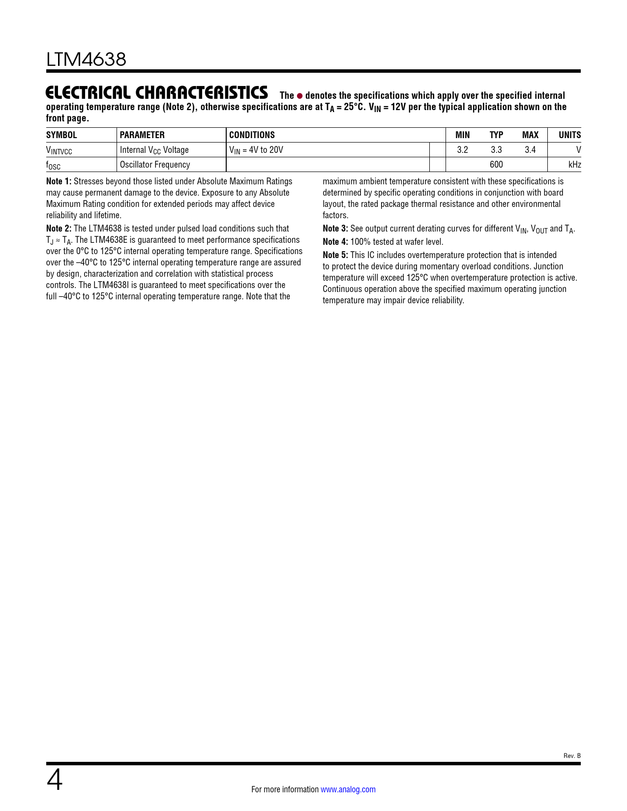VINTVCC Internal VCC Voltage VIN = 4V to 20V 3.2 3.3 3.4 V fOSC Oscillator Frequency 600 kHz