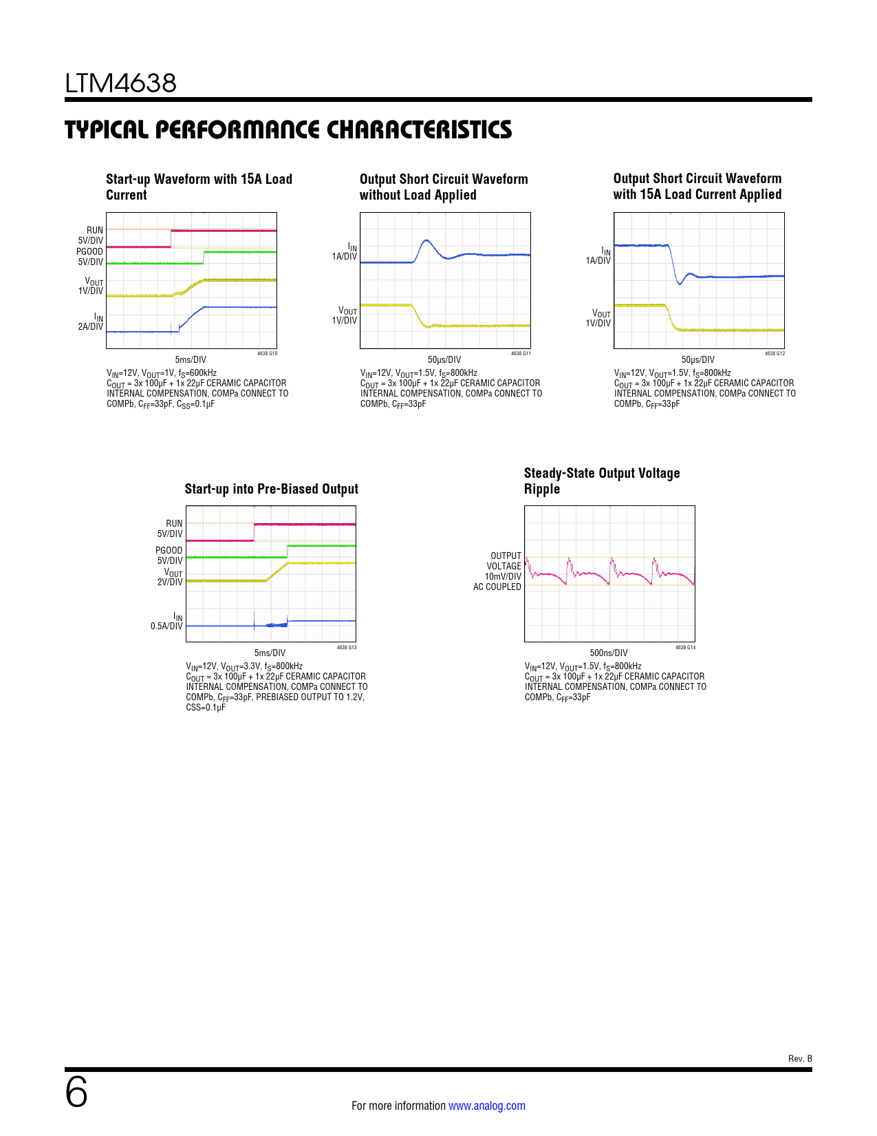 RUN 5V/DIV PGOOD 5V/DIV OUTPUT VOLTAGE VOUT 10mV/DIV 2V/DIV AC COUPLED IIN 0.5A/DIV 4638 G13 4638 G14 5ms/DIV 500ns/DIV VIN=12V, VOUT=3.3V, fS=800kHz VIN=12V, VOUT=1.5V, fS=800kHz COUT = 3x 100µF + 1x 22µF CERAMIC CAPACITOR COUT = 3x 100µF + 1x 22µF CERAMIC CAPACITOR INTERNAL COMPENSATION, COMPa CONNECT TO INTERNAL COMPENSATION, COMPa CONNECT TO COMPb, CFF=33pF, PREBIASED OUTPUT TO 1.2V, COMPb, CFF=33pF CSS=0.1µF Rev. B 6 For more information www.analog.com Document Outline Features Applications Typical Application Description Absolute Maximum Ratings Order Information Pin Configuration Electrical Characteristics Typical Performance Characteristics Pin Functions Block Diagram Decoupling Requirements Operation Applications Information Package Description Revision History Package Photo Related Parts