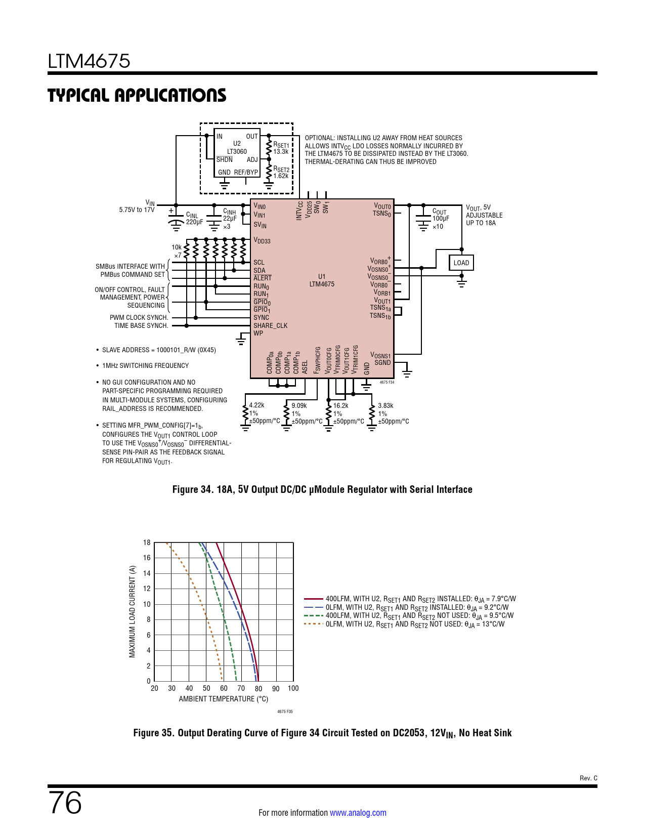 link to page 76 LTM4675 TYPICAL APPLICATIONS IN OUT OPTIONAL: INSTALLING U2 AWAY FROM HEAT SOURCES U2 RSET1 ALLOWS INTVCC LDO LOSSES NORMALLY INCURRED BY LT3060 13.3k THE LTM4675 TO BE DISSIPATED INSTEAD BY THE LT3060. SHDN ADJ THERMAL-DERATING CAN THUS BE IMPROVED RSET2 GND REF/BYP 1.62k VIN V 0 1 V 5.75V to 17V + C IN0 V CC OUT0 V INH OUT, 5V C SW C INL TSNS OUT V 22µF IN1 V DD25 SW 0 ADJUSTABLE 220µF INT 100µF SV UP TO 18A ×3 IN ×10 V DD33 10k ×7 + SCL VORB0 LOAD SMBus INTERFACE WITH + SDA VOSNS0 PMBus COMMAND SET – ALERT U1 VOSNS0– RUN V 0 LTM4675 ON/OFF CONTROL, FAULT ORB0 RUN V 1 MANAGEMENT, POWER ORB1 GPIO V 0 SEQUENCING OUT1 GPIO TSNS 1 1a PWM CLOCK SYNCH. SYNC TSNS1b TIME BASE SYNCH. SHARE_CLK WP • SLAVE ADDRESS = 1000101_R/W (0X45) 0a 0b 1a 1b VOSNS1 • 1MHz SWITCHING FREQUENCY SGND COMP COMP COMP COMP F SWPHCFG ASEL V OUT0CFG V TRIM0CFG V OUT1CFG V TRIM1CFG GND • NO GUI CONFIGURATION AND NO 4675 F34 PART-SPECIFIC PROGRAMMING REQUIRED IN MULTI-MODULE SYSTEMS, CONFIGURING RAIL_ADDRESS IS RECOMMENDED. 4.22k 9.09k 16.2k 3.83k 1% 1% 1% 1% ±50ppm/°C • SETTING MFR_PWM_CONFIG[7]=1 ±50ppm/°C ±50ppm/°C ±50ppm/°C b, CONFIGURES THE VOUT1 CONTROL LOOP TO USE THE V + – OSNS0 /VOSNS0 DIFFERENTIAL- SENSE PIN-PAIR AS THE FEEDBACK SIGNAL FOR REGULATING VOUT1. Figure 34. 18A, 5V Output DC/DC µModule Regulator with Serial Interface 18 16 14 12 400LFM, WITH U2, R 10 SET1 AND RSET2 INSTALLED: θJA = 7.9°C/W 0LFM, WITH U2, RSET1 AND RSET2 INSTALLED: θJA = 9.2°C/W 8 400LFM, WITH U2, RSET1 AND RSET2 NOT USED: θJA = 9.5°C/W 0LFM, WITH U2, RSET1 AND RSET2 NOT USED: θJA = 13°C/W 6 4 MAXIMUM LOAD CURRENT (A) 2 020 30 40 50 60 70 80 90 100 AMBIENT TEMPERATURE (°C) 4675 F35 Figure 35. Output Derating Curve of Figure 34Circuit Tested on DC2053, 12VIN, No Heat Sink Rev. C 76 For more information www.analog.com Document Outline Features Applications Typical Application Description Absolute Maximum Ratings Order Information Pin Configuration Electrical Characteristics Typical Performance Characteristics Pin Functions Simplified Block Diagram Decoupling Requirements Functional Diagram Test Circuits Operation Power Module Introduction Power Module Configurability and Readback Data Time-Averaged and Peak Readback Data Power Module Overview EEPROM Serial Interface Device Addressing Fault Detection and Handling Responses to VOUT and IOUT Faults Responses to Timing Faults Responses to SVIN OV Faults Responses to OT/UT Faults Responses to External Faults Fault Logging Bus Timeout Protection PMBus Command Summary PMBus Commands Applications Information VIN to VOUT Step-Down Ratios Input Capacitors Output Capacitors Light Load Current Operation Switching Frequency and Phase Minimum On-Time Considerations Variable Delay Time, Soft-Start and Output Voltage Ramping Digital Servo Mode Soft Off (Sequenced Off) Undervoltage Lockout Fault Detection and Handling Open-Drain Pins Phase-Locked Loop and Frequency Synchronization RCONFIG Pin-Straps (External Resistor Configuration Pins) Voltage Selection Connecting the USB to the I2C/SMBus/PMBus Controller to the LTM4675 In System LTpowerPlay: An Interactive GUI for Digital Power System Management PMBus Communication and Command Processing Thermal Considerations and Output Current Derating EMI Performance Safety Considerations Layout Checklist/Example Typical Applications Appendix A Similarity Between PMBus, SMBus and I2C 2-Wire Interface Appendix B PMBus Serial Digital Interface Appendix C: PMBus Command Details Addressing and Write Protect General Configuration Registers On/Off/Margin PWM Config Voltage Current Temperature Timing Fault Response Fault Sharing Scratchpad Identification Fault Warning and Status Telemetry NVM (EEPROM) Memory Commands Package Description Package Photograph Package Description Revision History Typical Application Design Resources Related Parts