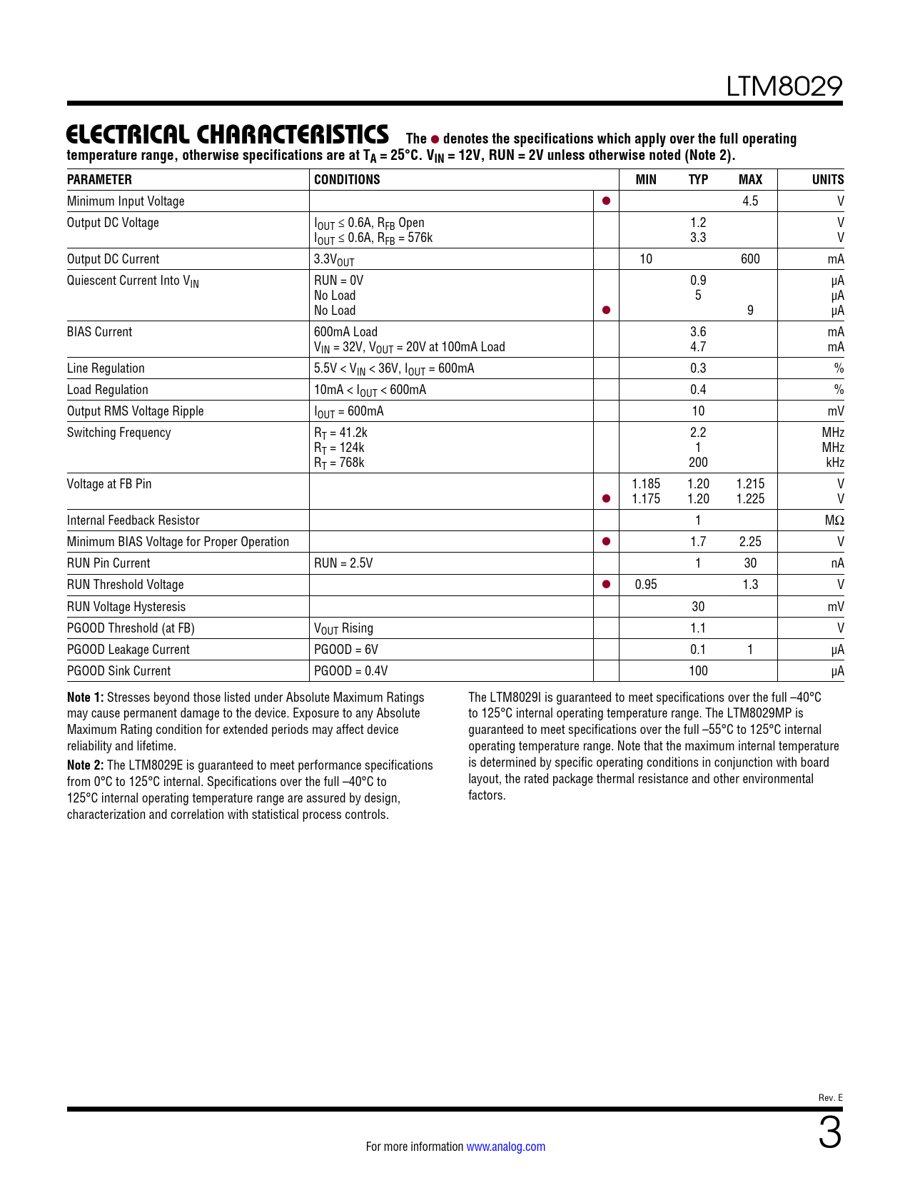 LTM8029 ELECTRICALCHARACTERISTICS The l denotes the specifications which apply over the full operatingtemperature range, otherwise specifications are at TA = 25°C. VIN = 12V, RUN = 2V unless otherwise noted (Note 2). PARAMETERCONDITIONSMINTYPMAXUNITS Minimum Input Voltage l 4.5 V Output DC Voltage IOUT ≤ 0.6A, RFB Open 1.2 V IOUT ≤ 0.6A, RFB = 576k 3.3 V Output DC Current 3.3VOUT 10 600 mA Quiescent Current Into VIN RUN = 0V 0.9 µA No Load 5 µA No Load l 9 µA BIAS Current 600mA Load 3.6 mA VIN = 32V, VOUT = 20V at 100mA Load 4.7 mA Line Regulation 5.5V < VIN < 36V, IOUT = 600mA 0.3 % Load Regulation 10mA < IOUT < 600mA 0.4 % Output RMS Voltage Ripple IOUT = 600mA 10 mV Switching Frequency RT = 41.2k 2.2 MHz RT = 124k 1 MHz RT = 768k 200 kHz Voltage at FB Pin 1.185 1.20 1.215 V l 1.175 1.20 1.225 V Internal Feedback Resistor 1 MΩ Minimum BIAS Voltage for Proper Operation l 1.7 2.25 V RUN Pin Current RUN = 2.5V 1 30 nA RUN Threshold Voltage l 0.95 1.3 V RUN Voltage Hysteresis 30 mV PGOOD Threshold (at FB) VOUT Rising 1.1 V PGOOD Leakage Current PGOOD = 6V 0.1 1 µA PGOOD Sink Current PGOOD = 0.4V 100 µA Note 1: Stresses beyond those listed under Absolute Maximum Ratings The LTM8029I is guaranteed to meet specifications over the full –40°C may cause permanent damage to the device. Exposure to any Absolute to 125°C internal operating temperature range. The LTM8029MP is Maximum Rating condition for extended periods may affect device guaranteed to meet specifications over the full –55°C to 125°C internal reliability and lifetime. operating temperature range. Note that the maximum internal temperature Note 2: The LTM8029E is guaranteed to meet performance specifications is determined by specific operating conditions in conjunction with board from 0°C to 125°C internal. Specifications over the full –40°C to layout, the rated package thermal resistance and other environmental 125°C internal operating temperature range are assured by design, factors. characterization and correlation with statistical process controls. Rev. E For more information www.analog.com 3 Document Outline Features Applications Typical Application Description Absolute Maximum Ratings Order Information Pin Configuration Electrical Characteristics Typical Performance Characteristics Pin Functions Block Diagram Operation Applications Information Typical Application Package Description Revision History Package Photo Design Resources Related Parts