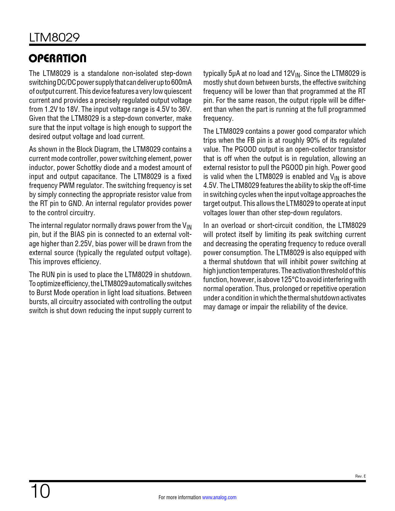 LTM8029 OPERATION The LTM8029 is a standalone non-isolated step-down typically 5μA at no load and 12VIN. Since the LTM8029 is switching DC/DC power supply that can deliver up to 600mA mostly shut down between bursts, the effective switching of output current. This device features a very low quiescent frequency will be lower than that programmed at the RT current and provides a precisely regulated output voltage pin. For the same reason, the output ripple will be differ- from 1.2V to 18V. The input voltage range is 4.5V to 36V. ent than when the part is running at the full programmed Given that the LTM8029 is a step-down converter, make frequency. sure that the input voltage is high enough to support the The LTM8029 contains a power good comparator which desired output voltage and load current. trips when the FB pin is at roughly 90% of its regulated As shown in the Block Diagram, the LTM8029 contains a value. The PGOOD output is an open-collector transistor current mode controller, power switching element, power that is off when the output is in regulation, allowing an inductor, power Schottky diode and a modest amount of external resistor to pull the PGOOD pin high. Power good input and output capacitance. The LTM8029 is a fixed is valid when the LTM8029 is enabled and VIN is above frequency PWM regulator. The switching frequency is set 4.5V. The LTM8029 features the ability to skip the off-time by simply connecting the appropriate resistor value from in switching cycles when the input voltage approaches the the RT pin to GND. An internal regulator provides power target output. This allows the LTM8029 to operate at input to the control circuitry. voltages lower than other step-down regulators. The internal regulator normally draws power from the VIN In an overload or short-circuit condition, the LTM8029 pin, but if the BIAS pin is connected to an external volt- will protect itself by limiting its peak switching current age higher than 2.25V, bias power will be drawn from the and decreasing the operating frequency to reduce overall external source (typically the regulated output voltage). power consumption. The LTM8029 is also equipped with This improves efficiency. a thermal shutdown that will inhibit power switching at The RUN pin is used to place the LTM8029 in shutdown. high junction temperatures. The activation threshold of this To optimize efficiency, the LTM8029 automatically switches function, however, is above 125°C to avoid interfering with to Burst Mode operation in light load situations. Between normal operation. Thus, prolonged or repetitive operation bursts, all circuitry associated with controlling the output under a condition in which the thermal shutdown activates switch is shut down reducing the input supply current to may damage or impair the reliability of the device. Rev. E 10 For more information www.analog.com Document Outline Features Applications Typical Application Description Absolute Maximum Ratings Order Information Pin Configuration Electrical Characteristics Typical Performance Characteristics Pin Functions Block Diagram Operation Applications Information Typical Application Package Description Revision History Package Photo Design Resources Related Parts