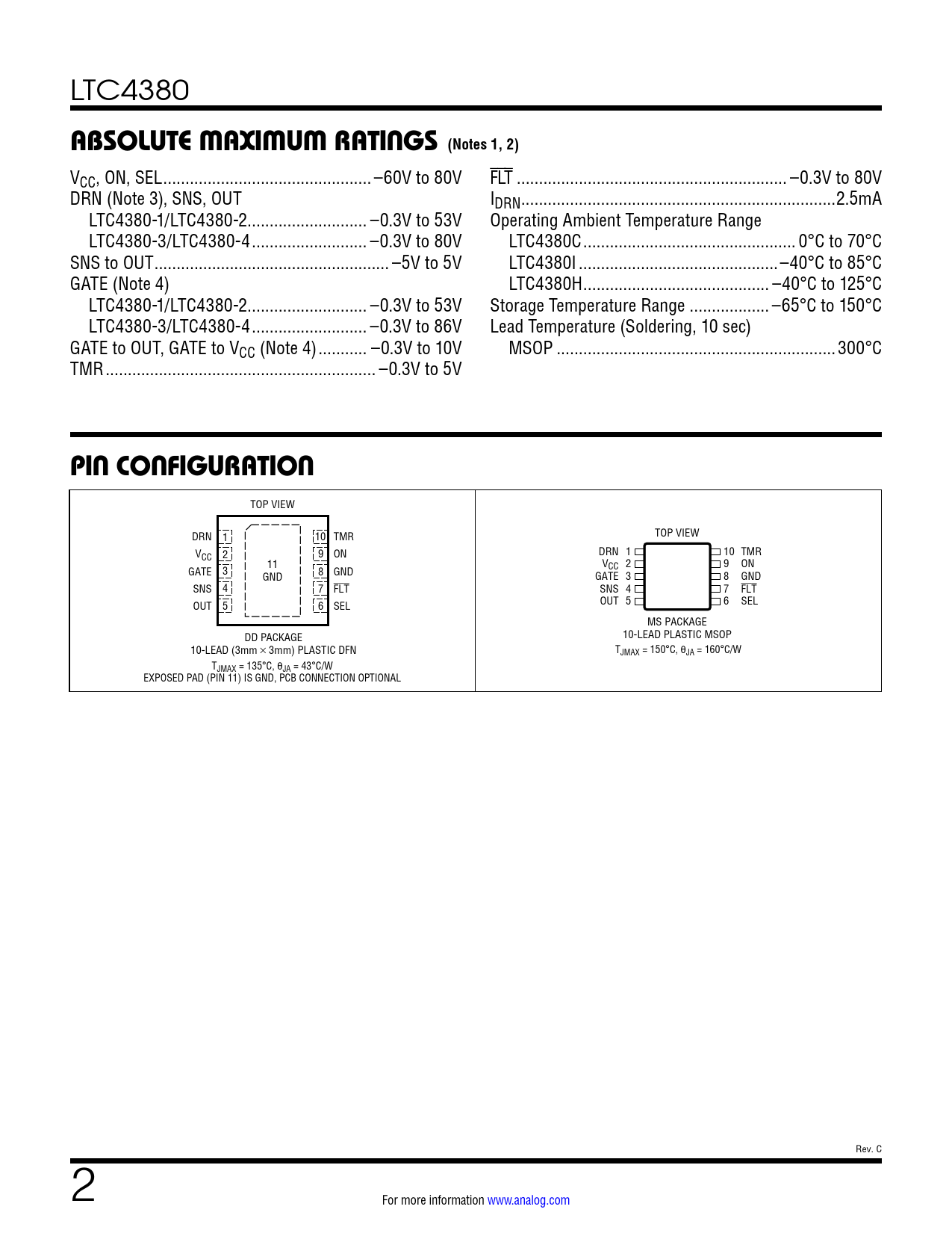 LTC4380 ABSOLUTE MAXIMUM RATINGS (Notes 1, 2) VCC, ON, SEL ...–60V to 80V FLT ... –0.3V to 80V DRN (Note 3), SNS, OUT IDRN ...2.5mA LTC4380-1/LTC4380-2... –0.3V to 53V Operating Ambient Temperature Range LTC4380-3/LTC4380-4 .. –0.3V to 80V LTC4380C .. 0°C to 70°C SNS to OUT ... –5V to 5V LTC4380I ...–40°C to 85°C GATE (Note 4) LTC4380H .. –40°C to 125°C LTC4380-1/LTC4380-2... –0.3V to 53V Storage Temperature Range .. –65°C to 150°C LTC4380-3/LTC4380-4 .. –0.3V to 86V Lead Temperature (Soldering, 10 sec) GATE to OUT, GATE to VCC (Note 4) ... –0.3V to 10V MSOP ...300°C TMR ... –0.3V to 5V PIN CONFIGURATION TOP VIEW DRN 1 10 TMR TOP VIEW VCC 2 9 ON DRN 1 10 TMR 11 VCC 2 9 ON GATE 3 GND 8 GND GATE 3 8 GND SNS 4 7 FLT SNS 4 7 FLT OUT 5 6 SEL OUT 5 6 SEL MS PACKAGE DD PACKAGE 10-LEAD PLASTIC MSOP 10-LEAD (3mm × 3mm) PLASTIC DFN TJMAX = 150°C, θJA = 160°C/W TJMAX = 135°C, θJA = 43°C/W EXPOSED PAD (PIN 11) IS GND, PCB CONNECTION OPTIONAL Rev. C 2 For more information www.analog.com Document Outline Features Applications Typical Application Description Absolute Maximum Ratings Pin Configuration Order Information Electrical Characteristics Typical Performance Characteristics Pin Functions Block Diagram Operation Applications Information Package Description Revision History Typical Application Related Parts