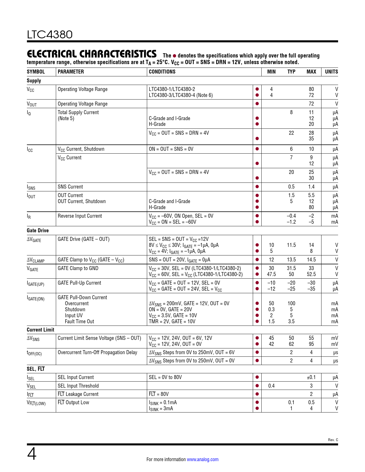 VCC Operating Voltage Range LTC4380-1/LTC4380-2 l 4 80 V LTC4380-3/LTC4380-4 (Note 6) l 4 72 V VOUT Operating Voltage Range l 72 V IQ Total Supply Current 8 11 µA (Note 5) C-Grade and I-Grade l 12 µA H-Grade l 20 µA VCC = OUT = SNS = DRN = 4V 22 28 µA l 35 µA ICC VCC Current, Shutdown ON = OUT = SNS = 0V l 6 10 µA VCC Current 7 9 µA l 12 µA VCC = OUT = SNS = DRN = 4V 20 25 µA l 30 µA ISNS SNS Current l 0.5 1.4 µA IOUT OUT Current l 1.5 5.5 µA OUT Current, Shutdown C-Grade and I-Grade l 5 12 µA H-Grade l 80 µA IR Reverse Input Current VCC = –60V, ON Open, SEL = 0V l –0.4 –2 mA VCC = ON = SEL = –60V l –1.2 –5 mA