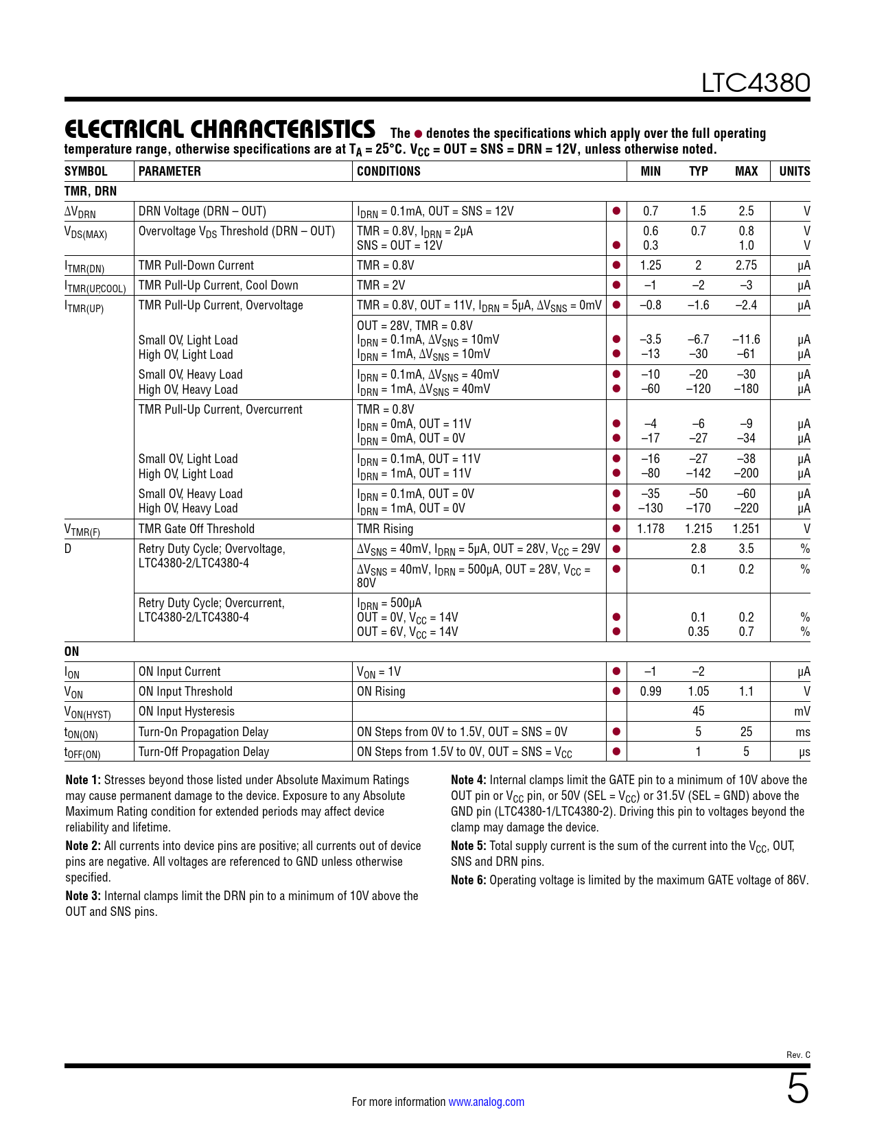 LTC4380 ELECTRICAL CHARACTERISTICS The l denotes the specifications which apply over the full operatingtemperature range, otherwise specifications are at TA = 25°C. VCC = OUT = SNS = DRN = 12V, unless otherwise noted. SYMBOLPARAMETERCONDITIONSMINTYPMAXUNITSTMR, DRN ∆VDRN DRN Voltage (DRN – OUT) IDRN = 0.1mA, OUT = SNS = 12V l 0.7 1.5 2.5 V VDS(MAX) Overvoltage VDS Threshold (DRN – OUT) TMR = 0.8V, IDRN = 2µA 0.6 0.7 0.8 V SNS = OUT = 12V l 0.3 1.0 V ITMR(DN) TMR Pull-Down Current TMR = 0.8V l 1.25 2 2.75 µA ITMR(UP,COOL) TMR Pull-Up Current, Cool Down TMR = 2V l –1 –2 –3 µA ITMR(UP) TMR Pull-Up Current, Overvoltage TMR = 0.8V, OUT = 11V, IDRN = 5µA, ∆VSNS = 0mV l –0.8 –1.6 –2.4 µA OUT = 28V, TMR = 0.8V Small OV, Light Load IDRN = 0.1mA, ∆VSNS = 10mV l –3.5 –6.7 –11.6 µA High OV, Light Load IDRN = 1mA, ∆VSNS = 10mV l –13 –30 –61 µA Small OV, Heavy Load IDRN = 0.1mA, ∆VSNS = 40mV l –10 –20 –30 µA High OV, Heavy Load IDRN = 1mA, ∆VSNS = 40mV l –60 –120 –180 µA TMR Pull-Up Current, Overcurrent TMR = 0.8V IDRN = 0mA, OUT = 11V l –4 –6 –9 µA IDRN = 0mA, OUT = 0V l –17 –27 –34 µA Small OV, Light Load IDRN = 0.1mA, OUT = 11V l –16 –27 –38 µA High OV, Light Load IDRN = 1mA, OUT = 11V l –80 –142 –200 µA Small OV, Heavy Load IDRN = 0.1mA, OUT = 0V l –35 –50 –60 µA High OV, Heavy Load IDRN = 1mA, OUT = 0V l –130 –170 –220 µA VTMR(F) TMR Gate Off Threshold TMR Rising l 1.178 1.215 1.251 V D Retry Duty Cycle; Overvoltage, ∆VSNS = 40mV, IDRN = 5µA, OUT = 28V, VCC = 29V l 2.8 3.5 % LTC4380-2/LTC4380-4 ∆VSNS = 40mV, IDRN = 500µA, OUT = 28V, VCC = l 0.1 0.2 % 80V Retry Duty Cycle; Overcurrent, IDRN = 500µA LTC4380-2/LTC4380-4 OUT = 0V, VCC = 14V l 0.1 0.2 % OUT = 6V, VCC = 14V l 0.35 0.7 % ON ION ON Input Current VON = 1V l –1 –2 µA VON ON Input Threshold ON Rising l 0.99 1.05 1.1 V VON(HYST) ON Input Hysteresis 45 mV tON(ON) Turn-On Propagation Delay ON Steps from 0V to 1.5V, OUT = SNS = 0V l 5 25 ms tOFF(ON) Turn-Off Propagation Delay ON Steps from 1.5V to 0V, OUT = SNS = VCC l 1 5 µs Note 1: Stresses beyond those listed under Absolute Maximum Ratings Note 4: Internal clamps limit the GATE pin to a minimum of 10V above the may cause permanent damage to the device. Exposure to any Absolute OUT pin or VCC pin, or 50V (SEL = VCC) or 31.5V (SEL = GND) above the Maximum Rating condition for extended periods may affect device GND pin (LTC4380-1/LTC4380-2). Driving this pin to voltages beyond the reliability and lifetime. clamp may damage the device. Note 2: All currents into device pins are positive; all currents out of device Note 5: Total supply current is the sum of the current into the VCC, OUT, pins are negative. All voltages are referenced to GND unless otherwise SNS and DRN pins. specified. Note 6: Operating voltage is limited by the maximum GATE voltage of 86V. Note 3: Internal clamps limit the DRN pin to a minimum of 10V above the OUT and SNS pins. Rev. C For more information www.analog.com 5 Document Outline Features Applications Typical Application Description Absolute Maximum Ratings Pin Configuration Order Information Electrical Characteristics Typical Performance Characteristics Pin Functions Block Diagram Operation Applications Information Package Description Revision History Typical Application Related Parts