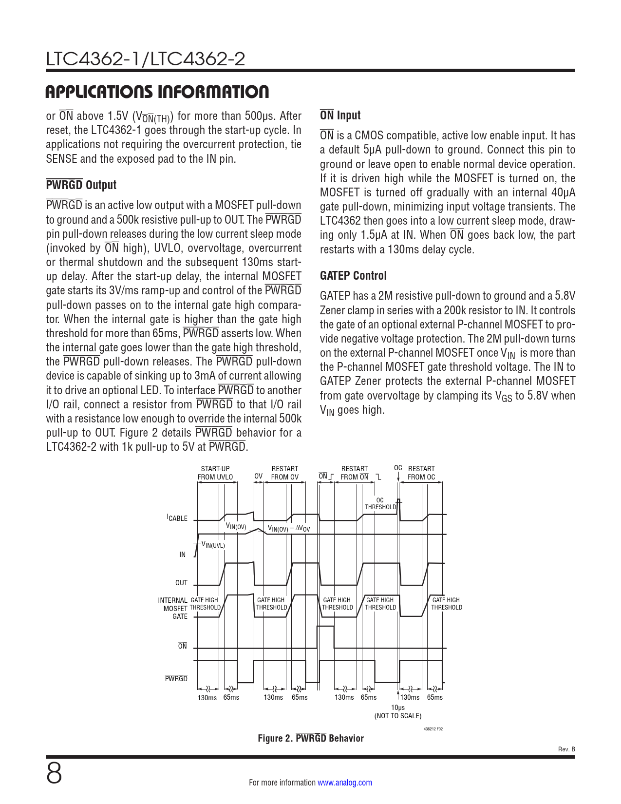 link to page 8 LTC4362-1/LTC4362-2 APPLICATIONS INFORMATION or ON above 1.5V (V ON Input ON(TH)) for more than 500µs. After reset, the LTC4362-1 goes through the start-up cycle. In ON is a CMOS compatible, active low enable input. It has applications not requiring the overcurrent protection, tie a default 5µA pull-down to ground. Connect this pin to SENSE and the exposed pad to the IN pin. ground or leave open to enable normal device operation. If it is driven high while the MOSFET is turned on, the PWRGD Output MOSFET is turned off gradual y with an internal 40µA PWRGD is an active low output with a MOSFET pull-down gate pull-down, minimizing input voltage transients. The to ground and a 500k resistive pull-up to OUT. The PWRGD LTC4362 then goes into a low current sleep mode, draw- pin pul -down releases during the low current sleep mode ing only 1.5µA at IN. When ON goes back low, the part (invoked by ON high), UVLO, overvoltage, overcurrent restarts with a 130ms delay cycle. or thermal shutdown and the subsequent 130ms start- up delay. After the start-up delay, the internal MOSFET GATEP Control gate starts its 3V/ms ramp-up and control of the PWRGD GATEP has a 2M resistive pull-down to ground and a 5.8V pull-down passes on to the internal gate high compara- Zener clamp in series with a 200k resistor to IN. It controls tor. When the internal gate is higher than the gate high the gate of an optional external P-channel MOSFET to pro- threshold for more than 65ms, PWRGD asserts low. When vide negative voltage protection. The 2M pull-down turns the internal gate goes lower than the gate high threshold, on the external P-channel MOSFET once VIN is more than the PWRGD pull-down releases. The PWRGD pull-down the P-channel MOSFET gate threshold voltage. The IN to device is capable of sinking up to 3mA of current allowing GATEP Zener protects the external P-channel MOSFET it to drive an optional LED. To interface PWRGD to another from gate overvoltage by clamping its VGS to 5.8V when I/O rail, connect a resistor from PWRGD to that I/O rail VIN goes high. with a resistance low enough to override the internal 500k pull-up to OUT. Figure 2 details PWRGD behavior for a LTC4362-2 with 1k pull-up to 5V at PWRGD. START-UP RESTART RESTART OC RESTART FROM UVLO OV FROM OV ON FROM ON FROM OC OC THRESHOLD ICABLE VIN(OV) VIN(OV) – ∆VOV VIN(UVL) IN OUT INTERNAL GATE HIGH GATE HIGH GATE HIGH GATE HIGH GATE HIGH MOSFET THRESHOLD THRESHOLD THRESHOLD THRESHOLD THRESHOLD GATE ON PWRGD 130ms 65ms 130ms 65ms 130ms 65ms 130ms 65ms 10µs (NOT TO SCALE) 436212 F02 Figure 2. PWRGD Behavior Rev. B 8 For more information www.analog.com Document Outline Features Applications Typical Application Description Absolute Maximum Ratings order information Pin Configuration Electrical Characteristics Typical Performance Characteristics Pin Functions Block Diagram Operation Applications Information Package Description Revision History Typical Application Related Parts