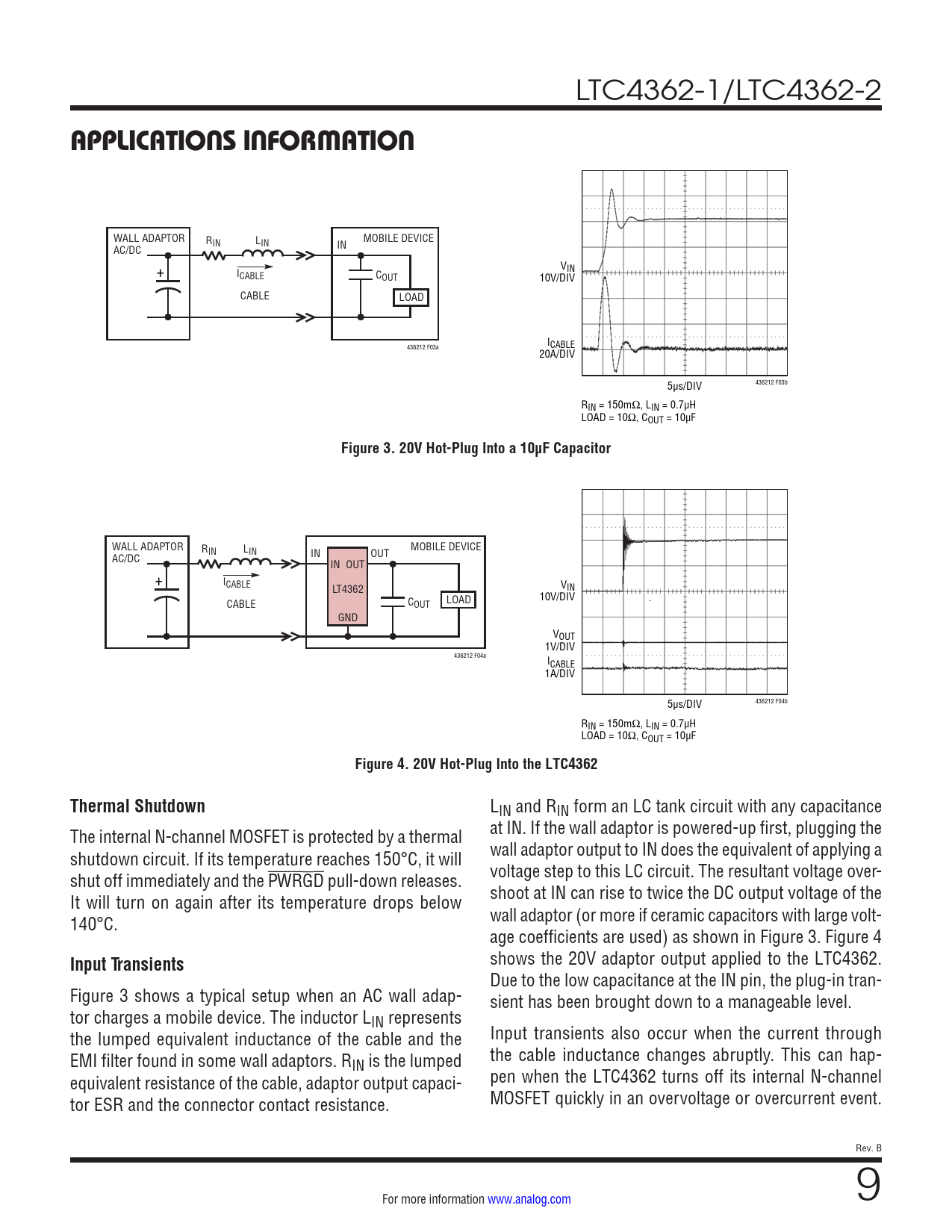 WALL ADAPTOR RIN LIN MOBILE DEVICE AC/DC IN OUT IN OUT + ICABLE VIN LT4362 LOAD 10V/DIV CABLE COUT GND VOUT 1V/DIV 436212 F04a ICABLE 1A/DIV 5µs/DIV 436212 F04b RIN = 150mΩ, LIN = 0.7µH LOAD = 10Ω, COUT = 10µF