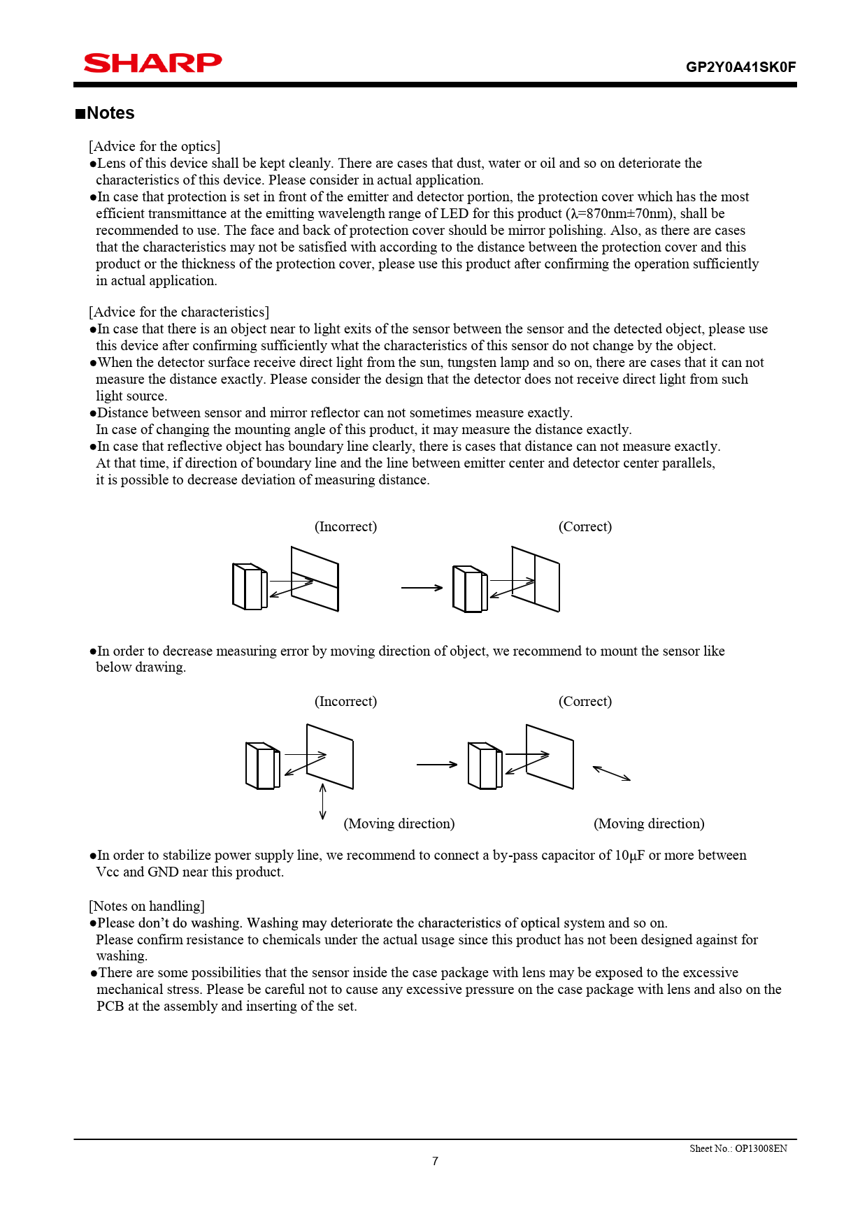 GP2Y0A41SK0FNotes [Advice for the optics] Lens of this device shall be kept cleanly. There are cases that dust, water or oil and so on deteriorate the characteristics of this device. Please consider in actual application. In case that protection is set in front of the emitter and detector portion, the protection cover which has the most efficient transmittance at the emitting wavelength range of LED for this product ( =870nm±70nm), shall be recommended to use. The face and back of protection cover should be mirror polishing. Also, as there are cases that the characteristics may not be satisfied with according to the distance between the protection cover and this product or the thickness of the protection cover, please use this product after confirming the operation sufficiently in actual application. [Advice for the characteristics] In case that there is an object near to light exits of the sensor between the sensor and the detected object, please use this device after confirming sufficiently what the characteristics of this sensor do not change by the object. When the detector surface receive direct light from the sun, tungsten lamp and so on, there are cases that it can not measure the distance exactly. Please consider the design that the detector does not receive direct light from such light source. Distance between sensor and mirror reflector can not sometimes measure exactly. In case of changing the mounting angle of this product, it may measure the distance exactly. In case that reflective object has boundary line clearly, there is cases that distance can not measure exactly. At that time, if direction of boundary line and the line between emitter center and detector center parallels, it is possible to decrease deviation of measuring distance. (Incorrect) (Correct) In order to decrease measuring error by moving direction of object, we recommend to mount the sensor like below drawing. (Incorrect) (Correct) (Moving direction) (Moving direction) In order to stabilize power supply line, we recommend to connect a by-pass capacitor of 10 F or more between Vcc and GND near this product. [Notes on handling] ystem and so on. Please confirm resistance to chemicals under the actual usage since this product has not been designed against for washing. There are some possibilities that the sensor inside the case package with lens may be exposed to the excessive mechanical stress. Please be careful not to cause any excessive pressure on the case package with lens and also on the PCB at the assembly and inserting of the set. Sheet No.: OP13008EN 7
