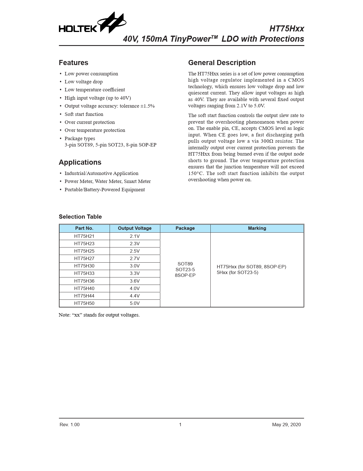 HT75Hxx. 40V, 150mA TinyPowerTM LDO with Protections. Features. General Description. Applications. Selection Table. Part No