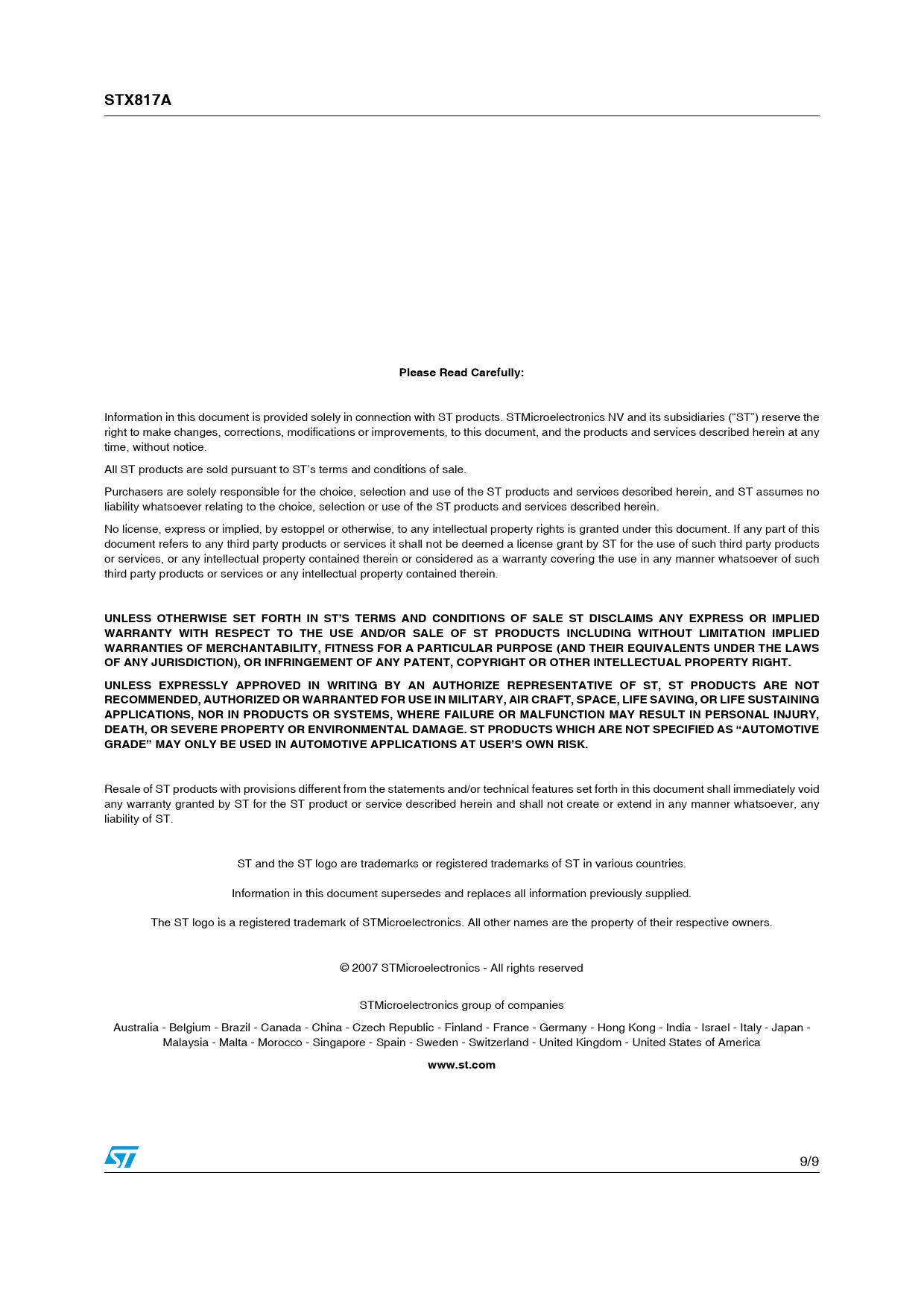 Resale of ST products with provisions different from the statements and/or technical features set forth in this document shall immediately void any warranty granted by ST for the ST product or service described herein and shall not create or extend in any manner whatsoever, any liability of ST. ST and the ST logo are trademarks or registered trademarks of ST in various countries. Information in this document supersedes and replaces all information previously supplied. The ST logo is a registered trademark of STMicroelectronics. Al other names are the property of their respective owners. © 2007 STMicroelectronics - Al rights reserved STMicroelectronics group of companies Australia - Belgium - Brazil - Canada - China - Czech Republic - Finland - France - Germany - Hong Kong - India - Israel - Italy - Japan - Malaysia - Malta - Morocco - Singapore - Spain - Sweden - Switzerland - United Kingdom - United States of America