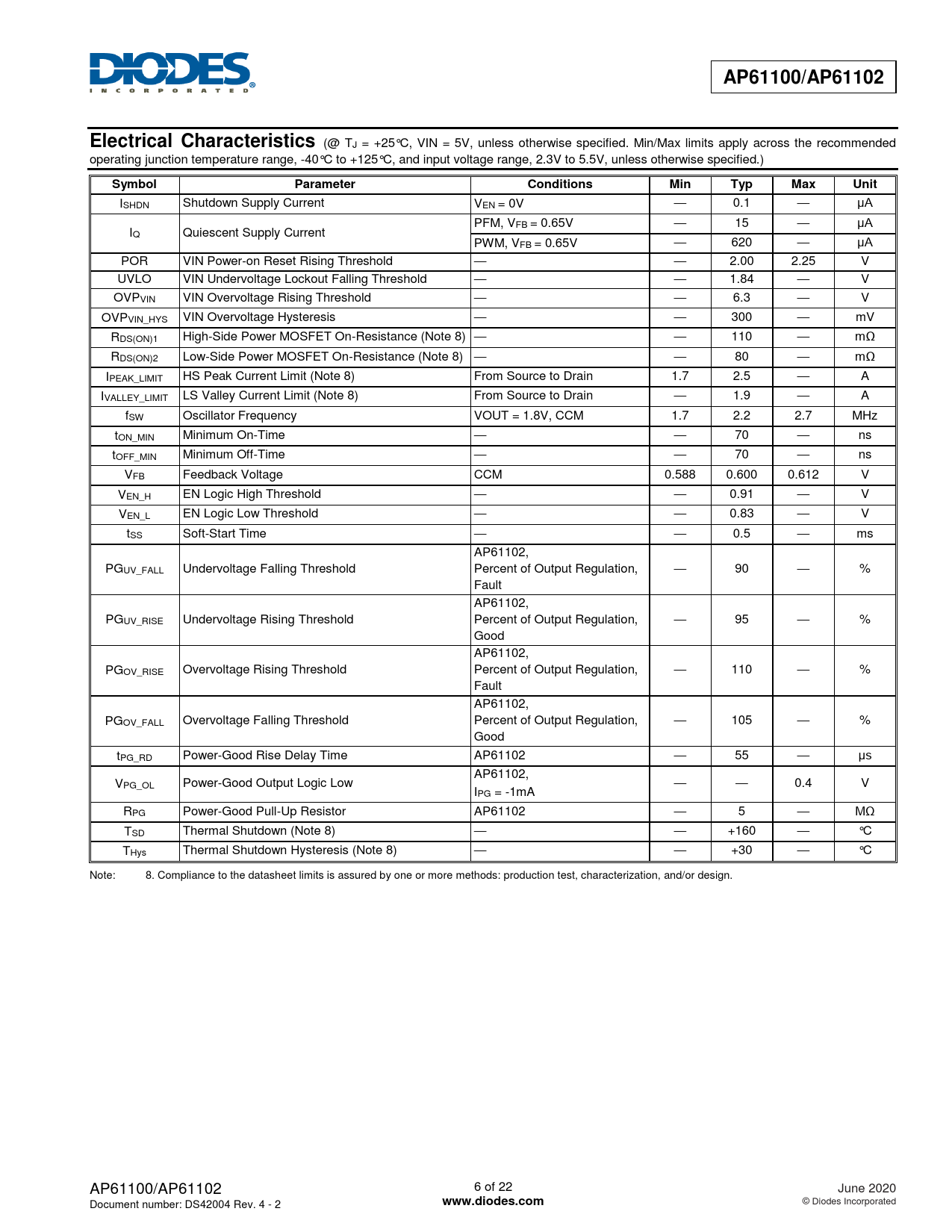 AP61100/AP61102. Electrical Characteristics. Symbol. Parameter. Conditions. Min. Typ. Max. Unit. www.diodes.com