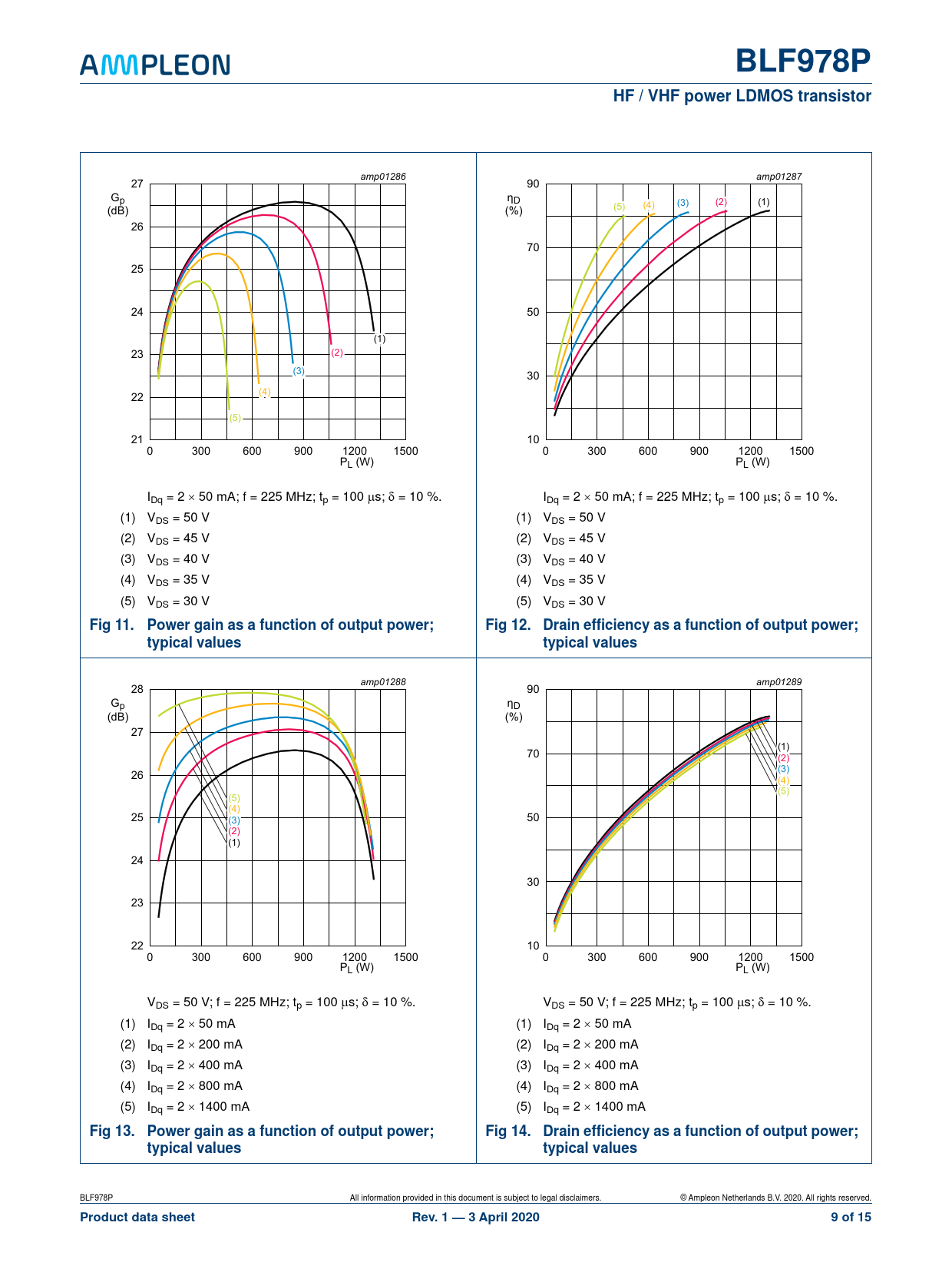 amp01286 amp01287 27 90 Gp G ηD (3) (3) (3) (2) (2) (2) (1) (1) (1) (4) (4) (4) (dB) (dB) (dB) (%) (%) (%) (5) (5) (5) 26 70 25 24 50 (1) (1) (1) 23 (2) (2) (2) (3) (3) (3) 30 (4) (4) (4) 22 (5) (5) (5) 21 10 0 300 600 900 1200 1500 0 300 600 900 1200 1500 PL (W) PL (W) IDq = 2 50 mA; f = 225 MHz; tp = 100 s; = 10 %. IDq = 2 50 mA; f = 225 MHz; tp = 100 s; = 10 %. (1) VDS = 50 V (1) VDS = 50 V (2) VDS = 45 V (2) VDS = 45 V (3) VDS = 40 V (3) VDS = 40 V (4) VDS = 35 V (4) VDS = 35 V (5) VDS = 30 V (5) VDS = 30 V