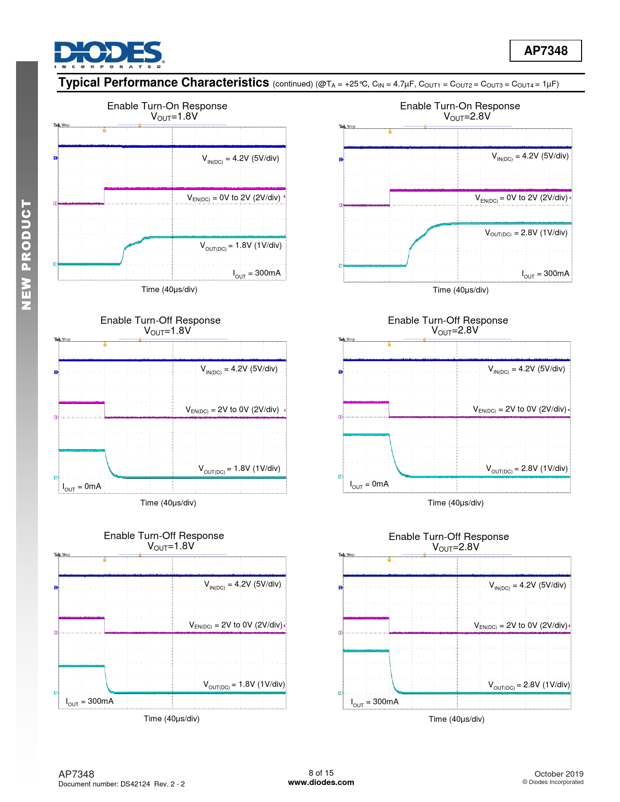 Enable Turn-Off Response Enable Turn-Off Response VOUT=1.8V VOUT=2.8V V = 4.2V (5V/div) V = 4.2V (5V/div) IN(DC) IN(DC) VEN(DC) = 2V to 0V (2V/div) VEN(DC) = 2V to 0V (2V/div) V = 1.8V (1V/div) V = 2.8V (1V/div) OUT(DC) OUT(DC) I = 0mA I = 0mA OUT OUT Time (40μs/div) Time (40μs/div) Enable Turn-Off Response Enable Turn-Off Response VOUT=1.8V VOUT=2.8V V = 4.2V (5V/div) V = 4.2V (5V/div) IN(DC) IN(DC) VEN(DC) = 2V to 0V (2V/div) VEN(DC) = 2V to 0V (2V/div) V = 1.8V (1V/div) V = 2.8V (1V/div) OUT(DC) OUT(DC) I = 300mA I = 300mA OUT OUT Time (40μs/div) Time (40μs/div) AP7348 8 of 15 October 2019 Document number: DS42124 Rev. 2 - 2