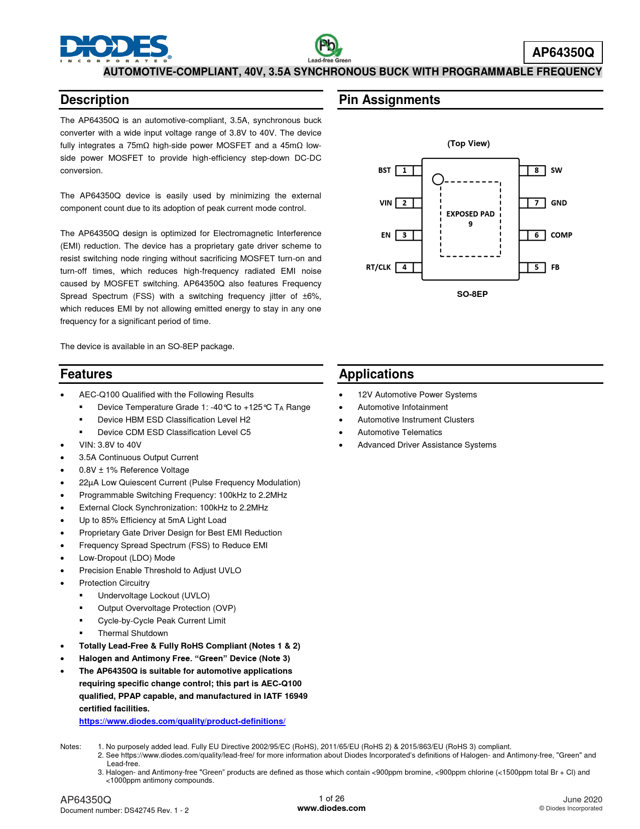 Totally Lead-Free & Fully RoHS Compliant (Notes 1 & 2) Halogen and Antimony Free. “Green” Device (Note 3) The AP64350Q is suitable for automotive applications requiring specific change control; this part is AEC-Q100 qualified, PPAP capable, and manufactured in IATF 16949 certified facilities. https://www.diodes.com/quality/product-definitions/