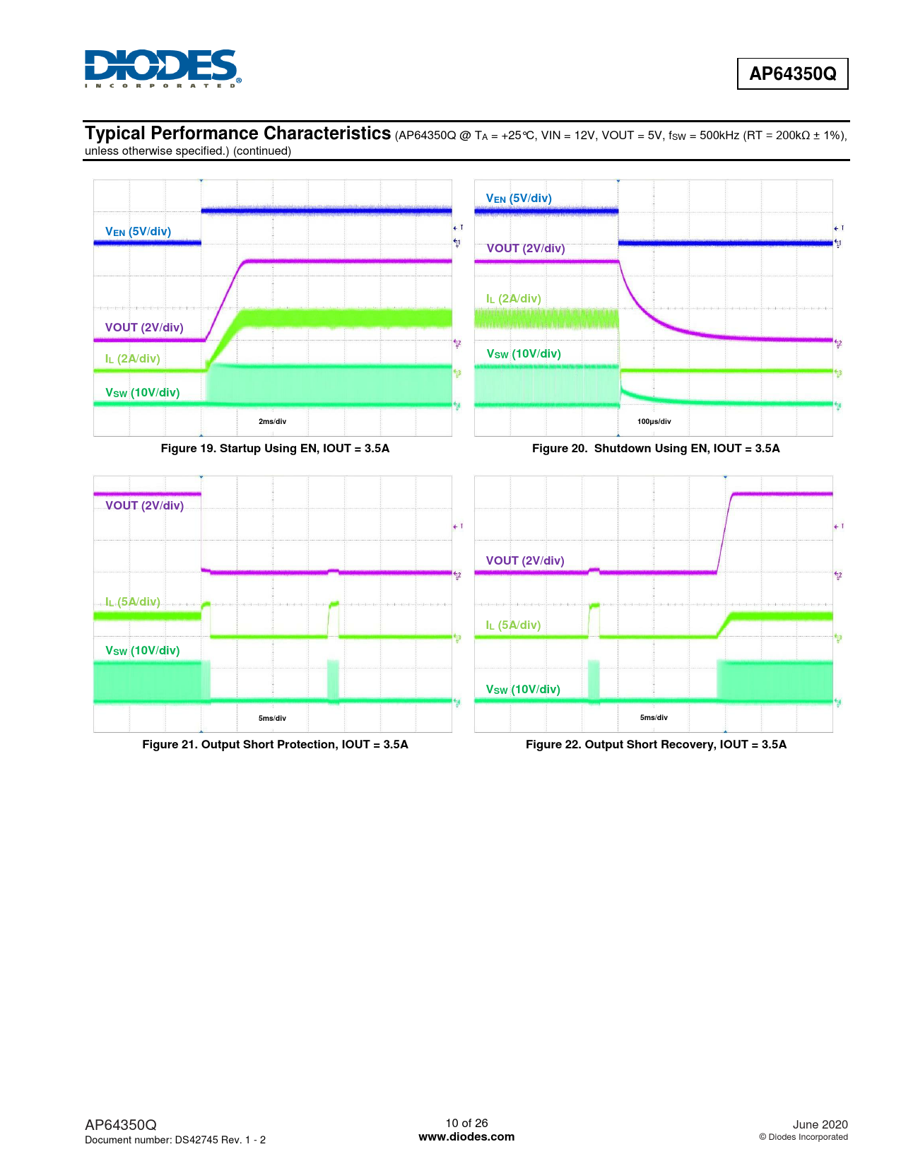 AP64350Q. Typical Performance Characteristics. VEN (5V/div). VOUT (2V/div). IL (2A/div). VSW (10V/div). L (2A/div). 2ms/div. 100μs/div