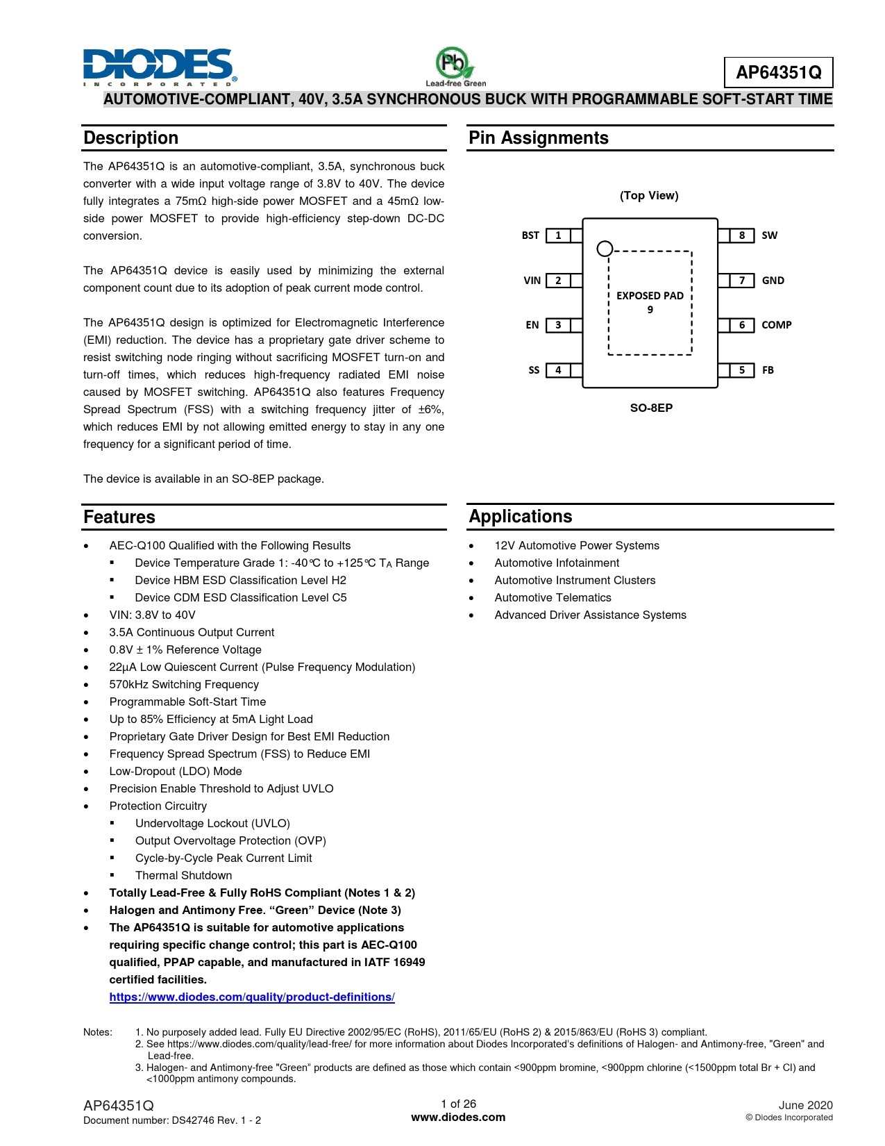 Totally Lead-Free & Fully RoHS Compliant (Notes 1 & 2) Halogen and Antimony Free. “Green” Device (Note 3) The AP64351Q is suitable for automotive applications requiring specific change control; this part is AEC-Q100 qualified, PPAP capable, and manufactured in IATF 16949 certified facilities. https://www.diodes.com/quality/product-definitions/