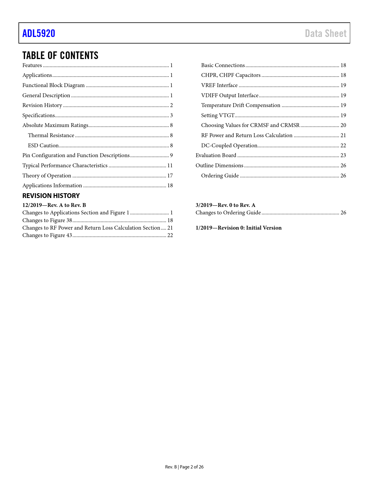 ADL5920 Data Sheet TABLE OF CONTENTS REVISION HISTORY 12/2019—Rev A to Rev B 3/2019—Rev 0 to Rev A