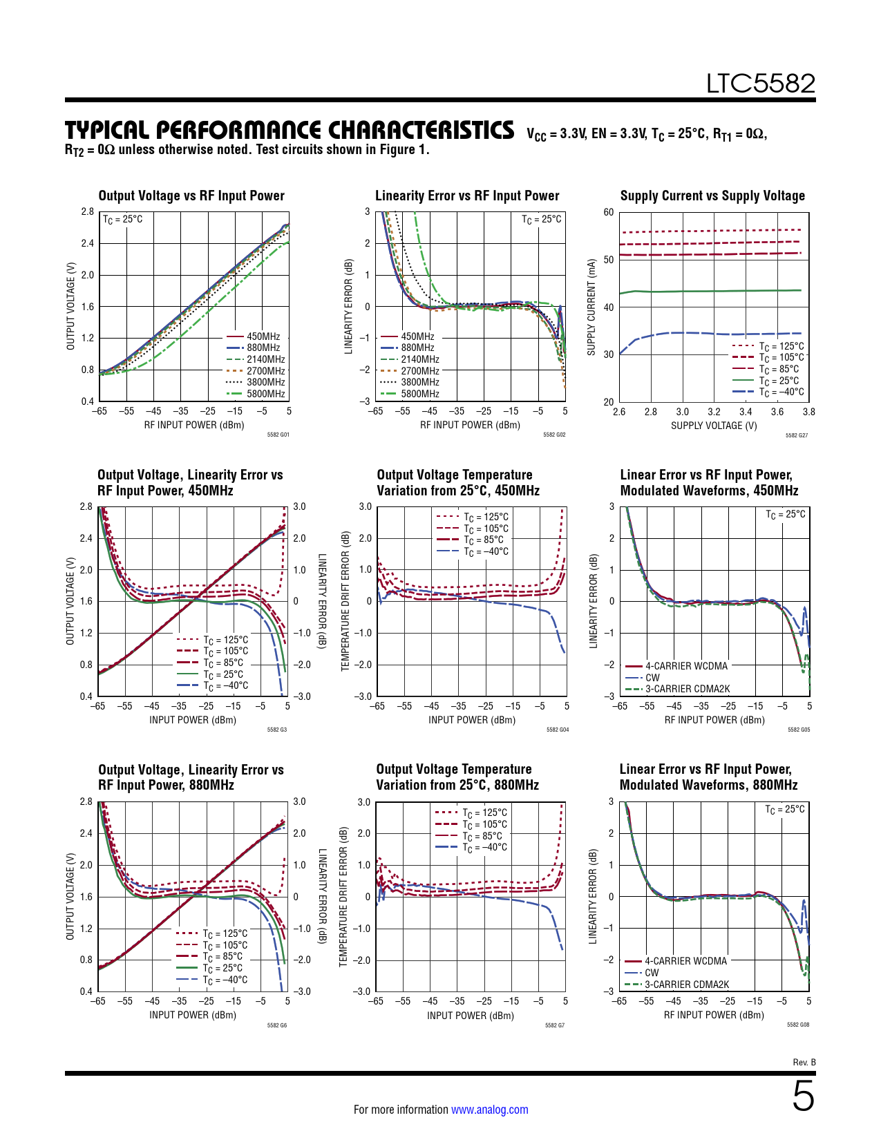 2.8 3.0 3.0 3 TC = 125°C TC = 25°C TC = 105°C 2.4 2.0 2.0 TC = 85°C 2 LINEARIT TC = –40°C 2.0 1.0 1.0 1 TAGE (V) Y ERROR (dB) T ERROR (dB) 1.6 0 0 Y ERROR (dB) 0 1.2 –1.0 TURE DRIF –1.0 –1 OUTPUT VOL TC = 125°C T LINEARIT C = 105°C 0.8 TC = 85°C –2.0 –2.0 –2 4-CARRIER WCDMA T TEMPERA C = 25°C CW TC = –40°C 3-CARRIER CDMA2K 0.4 –3.0 –3.0 –3 –65 –55 –45 –35 –25 –15 –5 5 –65 –55 –45 –35 –25 –15 –5 5 –65 –55 –45 –35 –25 –15 –5 5 INPUT POWER (dBm) INPUT POWER (dBm) RF INPUT POWER (dBm) 5582 G3 5582 G04 5582 G05