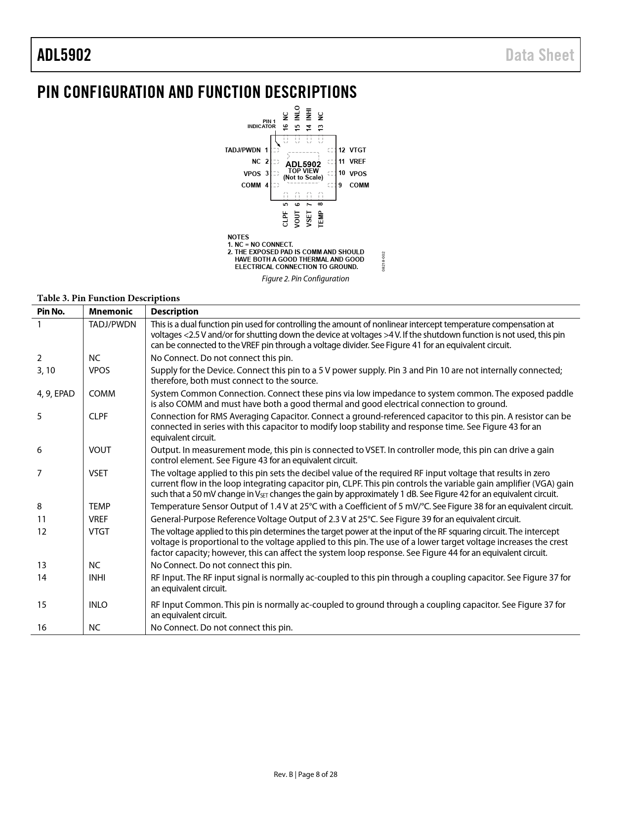 link to page 18 link to page 18 link to page 18 link to page 18 link to page 17 link to page 17 link to page 19 link to page 16 link to page 16 ADL5902Data SheetPIN CONFIGURATION AND FUNCTION DESCRIPTIONSILOHNCININNCPIN 1INDICATOR16151413TADJ/PWDN 112 VTGTNC 211 VREFADL5902VPOS 3TOP VIEW10 VPOS(Not to Scale)COMM 49COMM5678FTPPUMCLVOVSETTENOTES 1. NC = NO CONNECT. 2. THE EXPOSED PAD IS COMM AND SHOULD 2 -00 HAVE BOTH A GOOD THERMAL AND GOOD 218 ELECTRICAL CONNECTION TO GROUND. 08 Figure 2. Pin Configuration Table 3. Pin Function Descriptions Pin No.MnemonicDescription 1 TADJ/PWDN This is a dual function pin used for controlling the amount of nonlinear intercept temperature compensation at voltages <2.5 V and/or for shutting down the device at voltages >4 V. If the shutdown function is not used, this pin can be connected to the VREF pin through a voltage divider. See Figure 41 for an equivalent circuit. 2 NC No Connect. Do not connect this pin. 3, 10 VPOS Supply for the Device. Connect this pin to a 5 V power supply. Pin 3 and Pin 10 are not internally connected; therefore, both must connect to the source. 4, 9, EPAD COMM System Common Connection. Connect these pins via low impedance to system common. The exposed paddle is also COMM and must have both a good thermal and good electrical connection to ground. 5 CLPF Connection for RMS Averaging Capacitor. Connect a ground-referenced capacitor to this pin. A resistor can be connected in series with this capacitor to modify loop stability and response time. See Figure 43 for an equivalent circuit. 6 VOUT Output. In measurement mode, this pin is connected to VSET. In controller mode, this pin can drive a gain control element. See Figure 43 for an equivalent circuit. 7 VSET The voltage applied to this pin sets the decibel value of the required RF input voltage that results in zero current flow in the loop integrating capacitor pin, CLPF. This pin controls the variable gain amplifier (VGA) gain such that a 50 mV change in VSET changes the gain by approximately 1 dB. See Figure 42 for an equivalent circuit. 8 TEMP Temperature Sensor Output of 1.4 V at 25°C with a Coefficient of 5 mV/°C. See Figure 38 for an equivalent circuit. 11 VREF General-Purpose Reference Voltage Output of 2.3 V at 25°C. See Figure 39 for an equivalent circuit. 12 VTGT The voltage applied to this pin determines the target power at the input of the RF squaring circuit. The intercept voltage is proportional to the voltage applied to this pin. The use of a lower target voltage increases the crest factor capacity; however, this can affect the system loop response. See Figure 44 for an equivalent circuit. 13 NC No Connect. Do not connect this pin. 14 INHI RF Input. The RF input signal is normally ac-coupled to this pin through a coupling capacitor. See Figure 37 for an equivalent circuit. 15 INLO RF Input Common. This pin is normally ac-coupled to ground through a coupling capacitor. See Figure 37 for an equivalent circuit. 16 NC No Connect. Do not connect this pin. Rev. B | Page 8 of 28 Document Outline FEATURES APPLICATIONS FUNCTIONAL BLOCK DIAGRAM GENERAL DESCRIPTION REVISION HISTORY SPECIFICATIONS ABSOLUTE MAXIMUM RATINGS ESD CAUTION PIN CONFIGURATION AND FUNCTION DESCRIPTIONS TYPICAL PERFORMANCE CHARACTERISTICS THEORY OF OPERATION SQUARE LAW DETECTOR AND AMPLITUDE TARGET RF INPUT INTERFACE SMALL SIGNAL LOOP RESPONSE TEMPERATURE SENSOR INTERFACE VREF INTERFACE TEMPERATURE COMPENSATION INTERFACE POWER-DOWN INTERFACE VSET INTERFACE OUTPUT INTERFACE VTGT INTERFACE BASIS FOR ERROR CALCULATIONS MEASUREMENT MODE BASIC CONNECTIONS SETTING VTADJ SETTING VTGT CHOOSING A VALUE FOR CLPF OUTPUT VOLTAGE SCALING SYSTEM CALIBRATION AND ERROR CALCULATION HIGH FREQUENCY PERFORMANCE LOW FREQUENCY PERFORMANCE DESCRIPTION OF CHARACTERIZATION EVALUATION BOARD SCHEMATICS AND ARTWORK ASSEMBLY DRAWINGS OUTLINE DIMENSIONS ORDERING GUIDE