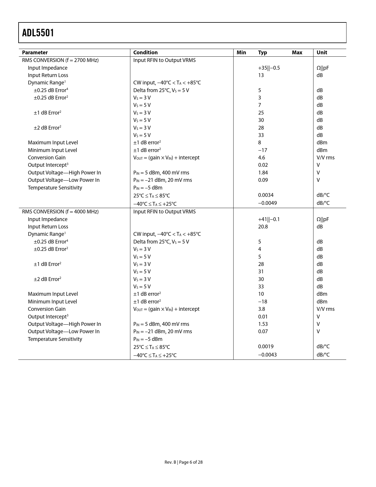 link to page 8 link to page 8 link to page 8 link to page 8 link to page 8 link to page 8 link to page 8 link to page 8 link to page 8 link to page 8 link to page 8 link to page 8 link to page 8 link to page 8 link to page 8 link to page 8 link to page 8 link to page 8 link to page 8 link to page 8 link to page 8 link to page 8 link to page 8 link to page 8 link to page 8 link to page 8 link to page 8 link to page 8 ADL5501Parameter ConditionMinTypMaxUnit RMS CONVERSION (f = 2700 MHz) Input RFIN to Output VRMS Input Impedance +35||−0.5 Ω||pF Input Return Loss 13 dB Dynamic Range1 CW input, −40°C < TA < +85°C ±0.25 dB Error4 Delta from 25°C, VS = 5 V 5 dB ±0.25 dB Error2 VS = 3 V 3 dB VS = 5 V 7 dB ±1 dB Error2 VS = 3 V 25 dB VS = 5 V 30 dB ±2 dB Error2 VS = 3 V 28 dB VS = 5 V 33 dB Maximum Input Level ±1 dB error2 8 dBm Minimum Input Level ±1 dB error2 −17 dBm Conversion Gain VOUT = (gain × VIN) + intercept 4.6 V/V rms Output Intercept3 0.02 V Output Voltage—High Power In PIN = 5 dBm, 400 mV rms 1.84 V Output Voltage—Low Power In PIN = –21 dBm, 20 mV rms 0.09 V Temperature Sensitivity PIN = –5 dBm 25°C ≤ TA ≤ 85°C 0.0034 dB/°C −40°C ≤ TA ≤ +25°C −0.0049 dB/°C RMS CONVERSION (f = 4000 MHz) Input RFIN to Output VRMS Input Impedance +41||−0.1 Ω||pF Input Return Loss 20.8 dB Dynamic Range1 CW input, −40°C < TA < +85°C ±0.25 dB Error4 Delta from 25°C, VS = 5 V 5 dB ±0.25 dB Error2 VS = 3 V 4 dB VS = 5 V 5 dB ±1 dB Error2 VS = 3 V 28 dB VS = 5 V 31 dB ±2 dB Error2 VS = 3 V 30 dB VS = 5 V 33 dB Maximum Input Level ±1 dB error2 10 dBm Minimum Input Level ±1 dB error2 −18 dBm Conversion Gain VOUT = (gain × VIN) + intercept 3.8 V/V rms Output Intercept3 0.01 V Output Voltage—High Power In PIN = 5 dBm, 400 mV rms 1.53 V Output Voltage—Low Power In PIN = –21 dBm, 20 mV rms 0.07 V Temperature Sensitivity PIN = –5 dBm 25°C ≤ TA ≤ 85°C 0.0019 dB/°C −40°C ≤ TA ≤ +25°C −0.0043 dB/°C Rev. B | Page 6 of 28 Document Outline FEATURES APPLICATIONS GENERAL DESCRIPTION FUNCTIONAL BLOCK DIAGRAM TABLE OF CONTENTS REVISION HISTORY SPECIFICATIONS ABSOLUTE MAXIMUM RATINGS ESD CAUTION PIN CONFIGURATION AND FUNCTION DESCRIPTIONS TYPICAL PERFORMANCE CHARACTERISTICS CIRCUIT DESCRIPTION FILTERING APPLICATIONS INFORMATION BASIC CONNECTIONS OUTPUT SWING LINEARITY INPUT COUPLING USING A SERIES RESISTOR MULTIPLE RF INPUTS SELECTING THE SQUARE-DOMAIN FILTER AND OUTPUT LOW-PASS FILTER POWER CONSUMPTION, ENABLE, AND POWER-ON/POWER-OFF RESPONSE TIME OUTPUT DRIVE CAPABILITY AND BUFFERING VRMS OUTPUT OFFSET DEVICE CALIBRATION AND ERROR CALCULATION CALIBRATION FOR IMPROVED ACCURACY DRIFT OVER A REDUCED TEMPERATURE RANGE OPERATION BELOW 100 MHz EVALUATION BOARD OUTLINE DIMENSIONS ORDERING GUIDE