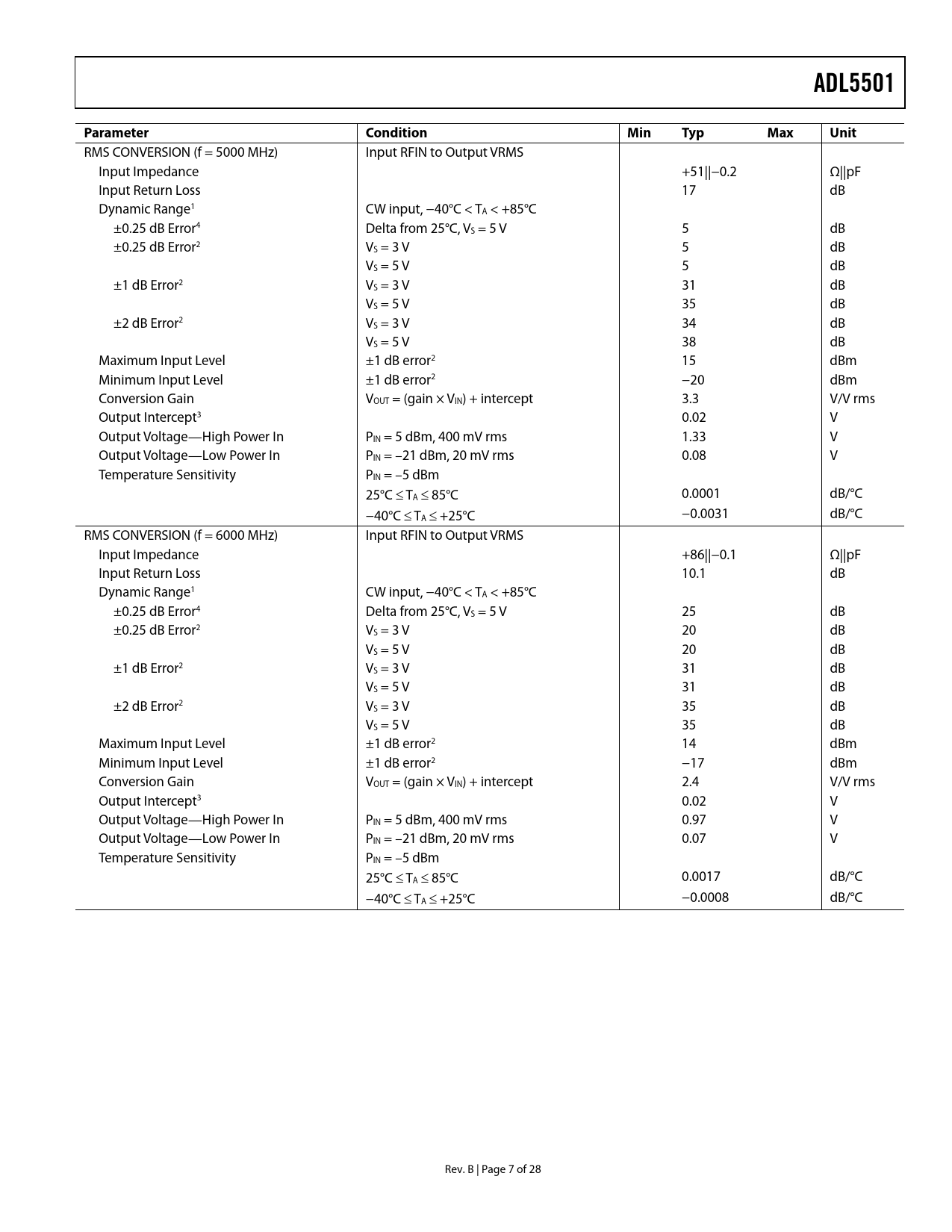 link to page 8 link to page 8 link to page 8 link to page 8 link to page 8 link to page 8 link to page 8 link to page 8 link to page 8 link to page 8 link to page 8 link to page 8 link to page 8 link to page 8 link to page 8 link to page 8 link to page 8 link to page 8 link to page 8 link to page 8 link to page 8 link to page 8 link to page 8 link to page 8 link to page 8 link to page 8 link to page 8 ADL5501Parameter ConditionMinTypMaxUnit RMS CONVERSION (f = 5000 MHz) Input RFIN to Output VRMS Input Impedance +51||−0.2 Ω||pF Input Return Loss 17 dB Dynamic Range1 CW input, −40°C < TA < +85°C ±0.25 dB Error4 Delta from 25°C, VS = 5 V 5 dB ±0.25 dB Error2 VS = 3 V 5 dB VS = 5 V 5 dB ±1 dB Error2 VS = 3 V 31 dB VS = 5 V 35 dB ±2 dB Error2 VS = 3 V 34 dB VS = 5 V 38 dB Maximum Input Level ±1 dB error2 15 dBm Minimum Input Level ±1 dB error2 −20 dBm Conversion Gain VOUT = (gain × VIN) + intercept 3.3 V/V rms Output Intercept3 0.02 V Output Voltage—High Power In PIN = 5 dBm, 400 mV rms 1.33 V Output Voltage—Low Power In PIN = –21 dBm, 20 mV rms 0.08 V Temperature Sensitivity PIN = –5 dBm 25°C ≤ TA ≤ 85°C 0.0001 dB/°C −40°C ≤ TA ≤ +25°C −0.0031 dB/°C RMS CONVERSION (f = 6000 MHz) Input RFIN to Output VRMS Input Impedance +86||−0.1 Ω||pF Input Return Loss 10.1 dB Dynamic Range1 CW input, −40°C < TA < +85°C ±0.25 dB Error4 Delta from 25°C, VS = 5 V 25 dB ±0.25 dB Error2 VS = 3 V 20 dB VS = 5 V 20 dB ±1 dB Error2 VS = 3 V 31 dB VS = 5 V 31 dB ±2 dB Error2 VS = 3 V 35 dB VS = 5 V 35 dB Maximum Input Level ±1 dB error2 14 dBm Minimum Input Level ±1 dB error2 −17 dBm Conversion Gain VOUT = (gain × VIN) + intercept 2.4 V/V rms Output Intercept3 0.02 V Output Voltage—High Power In PIN = 5 dBm, 400 mV rms 0.97 V Output Voltage—Low Power In PIN = –21 dBm, 20 mV rms 0.07 V Temperature Sensitivity PIN = –5 dBm 25°C ≤ TA ≤ 85°C 0.0017 dB/°C −40°C ≤ TA ≤ +25°C −0.0008 dB/°C Rev. B | Page 7 of 28 Document Outline FEATURES APPLICATIONS GENERAL DESCRIPTION FUNCTIONAL BLOCK DIAGRAM TABLE OF CONTENTS REVISION HISTORY SPECIFICATIONS ABSOLUTE MAXIMUM RATINGS ESD CAUTION PIN CONFIGURATION AND FUNCTION DESCRIPTIONS TYPICAL PERFORMANCE CHARACTERISTICS CIRCUIT DESCRIPTION FILTERING APPLICATIONS INFORMATION BASIC CONNECTIONS OUTPUT SWING LINEARITY INPUT COUPLING USING A SERIES RESISTOR MULTIPLE RF INPUTS SELECTING THE SQUARE-DOMAIN FILTER AND OUTPUT LOW-PASS FILTER POWER CONSUMPTION, ENABLE, AND POWER-ON/POWER-OFF RESPONSE TIME OUTPUT DRIVE CAPABILITY AND BUFFERING VRMS OUTPUT OFFSET DEVICE CALIBRATION AND ERROR CALCULATION CALIBRATION FOR IMPROVED ACCURACY DRIFT OVER A REDUCED TEMPERATURE RANGE OPERATION BELOW 100 MHz EVALUATION BOARD OUTLINE DIMENSIONS ORDERING GUIDE