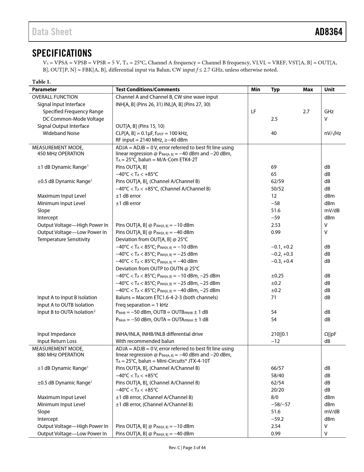 link to page 6 link to page 6 link to page 6 link to page 6 link to page 6 Data SheetAD8364SPECIFICATIONS VS = VPSA = VPSB = VPSR = 5 V, TA = 25°C, Channel A frequency = Channel B frequency, VLVL = VREF, VST[A, B] = OUT[A, B], OUT[P, N] = FBK[A, B], differential input via Balun, CW input f ≤ 2.7 GHz, unless otherwise noted. Table 1. ParameterTest Conditions/CommentsMinTypMaxUnit OVERALL FUNCTION Channel A and Channel B, CW sine wave input Signal Input Interface INH[A, B] (Pins 26, 31) INL[A, B] (Pins 27, 30) Specified Frequency Range LF 2.7 GHz DC Common-Mode Voltage 2.5 V Signal Output Interface OUT[A, B] (Pins 15, 10) Wideband Noise CLP[A, B] = 0.1µF, fSPOT = 100 kHz, 40 nV/√Hz RF input = 2140 MHz, ≥−40 dBm MEASUREMENT MODE, ADJA = ADJB = 0 V, error referred to best fit line using 450 MHz OPERATION linear regression @ PINH[A, B] = −40 dBm and −20 dBm, TA = 25°C, balun = M/A-Com ETK4-2T ±1 dB Dynamic Range1 Pins OUT[A, B] 69 dB −40°C < TA < +85°C 65 dB ±0.5 dB Dynamic Range1 Pins OUT[A, B], (Channel A/Channel B) 62/59 dB −40°C < TA < +85°C, (Channel A/Channel B) 50/52 dB Maximum Input Level ±1 dB error 12 dBm Minimum Input Level ±1 dB error −58 dBm Slope 51.6 mV/dB Intercept −59 dBm Output Voltage—High Power In Pins OUT[A, B] @ PINH[A, B] = −10 dBm 2.53 V Output Voltage—Low Power In Pins OUT[A, B] @ PINH[A, B] = −40 dBm 0.99 V Temperature Sensitivity Deviation from OUT[A, B] @ 25°C −40°C < TA < 85°C; PINH[A, B] = −10 dBm −0.1, +0.2 dB −40°C < TA < 85°C; PINH[A, B] = −25 dBm −0.2, +0.3 dB −40°C < TA < 85°C; PINH[A, B] = −40 dBm −0.3, +0.4 dB Deviation from OUTP to OUTN @ 25°C −40°C < TA < 85°C; PINH[A, B] = −10 dBm, −25 dBm ±0.25 dB −40°C < TA < 85°C; PINH[A, B] = −25 dBm, −25 dBm ±0.2 dB −40°C < TA < 85°C; PINH[A, B] = −40 dBm, −25 dBm ±0.2 dB Input A to Input B Isolation Baluns = Macom ETC1.6-4-2-3 (both channels) 71 dB Input A to OUTB Isolation Freq separation = 1 kHz Input B to OUTA Isolation2 PINHB = −50 dBm, OUTB = OUTBPINHB ± 1 dB 54 dB PINHA = −50 dBm, OUTA = OUTAPINHA ± 1 dB 54 dB Input Impedance INHA/INLA, INHB/INLB differential drive 210||0.1 Ω||pF Input Return Loss With recommended balun −12 dB MEASUREMENT MODE, ADJA = ADJB = 0 V, error referred to best fit line using 880 MHz OPERATION linear regression @ PINH[A, B] = −40 dBm and −20 dBm, TA = 25°C, balun = Mini-Circuits® JTX-4-10T ±1 dB Dynamic Range1 Pins OUT[A, B], (Channel A/Channel B) 66/57 dB −40°C < TA < +85°C 58/40 dB ±0.5 dB Dynamic Range1 Pins OUT[A, B], (Channel A/Channel B) 62/54 dB −40°C < TA < +85°C 20/20 dB Maximum Input Level ±1 dB error, (Channel A/Channel B) 8/0 dBm Minimum Input Level ±1 dB error, (Channel A/Channel B) −58/−57 dBm Slope 51.6 mV/dB Intercept −59.2 dBm Output Voltage—High Power In Pins OUT[A, B] @ PINH[A, B] = −10 dBm 2.54 V Output Voltage—Low Power In Pins OUT[A, B] @ PINH[A, B] = −40 dBm 0.99 V Rev. C | Page 3 of 44 Document Outline FEATURES APPLICATIONS FUNCTIONAL BLOCK DIAGRAM GENERAL DESCRIPTION REVISION HISTORY SPECIFICATIONS ABSOLUTE MAXIMUM RATINGS ESD CAUTION PIN CONFIGURATION AND FUNCTION DESCRIPTIONS TYPICAL PERFORMANCE CHARACTERISTICS THEORY OF OPERATION SQUARE LAW DETECTOR AND AMPLITUDE TARGET RF INPUT INTERFACE OFFSET COMPENSATION TEMPERATURE SENSOR INTERFACE VREF INTERFACE POWER-DOWN INTERFACE VST[A, B] INTERFACE OUT[A, B, P, N] OUTPUTS MEASUREMENT CHANNEL DIFFERENCE OUTPUT USING OUT[P, N] CONTROLLER MODE RF MEASUREMENT MODE BASIC CONNECTIONS CONTROLLER MODE BASIC CONNECTIONS Automatic Power Control Automatic Gain Control CONSTANT OUTPUT POWER OPERATION GAIN-STABLE TRANSMITTER/RECEIVER TEMPERATURE COMPENSATION ADJUSTMENT DEVICE CALIBRATION AND ERROR CALCULATION SELECTING CALIBRATION POINTS TO IMPROVE ACCURACY OVER A REDUCED RANGE CHANNEL ISOLATION ALTERING THE SLOPE CHOOSING THE RIGHT VALUE FOR CHP[A, B] AND CLP[A, B] RF BURST RESPONSE TIME SINGLE-ENDED INPUT OPERATION PRINTED CIRCUIT BOARD CONSIDERATIONS PACKAGE CONSIDERATIONS DESCRIPTION OF CHARACTERIZATION BASIS FOR ERROR CALCULATIONS EVALUATION BOARD OUTLINE DIMENSIONS ORDERING GUIDE