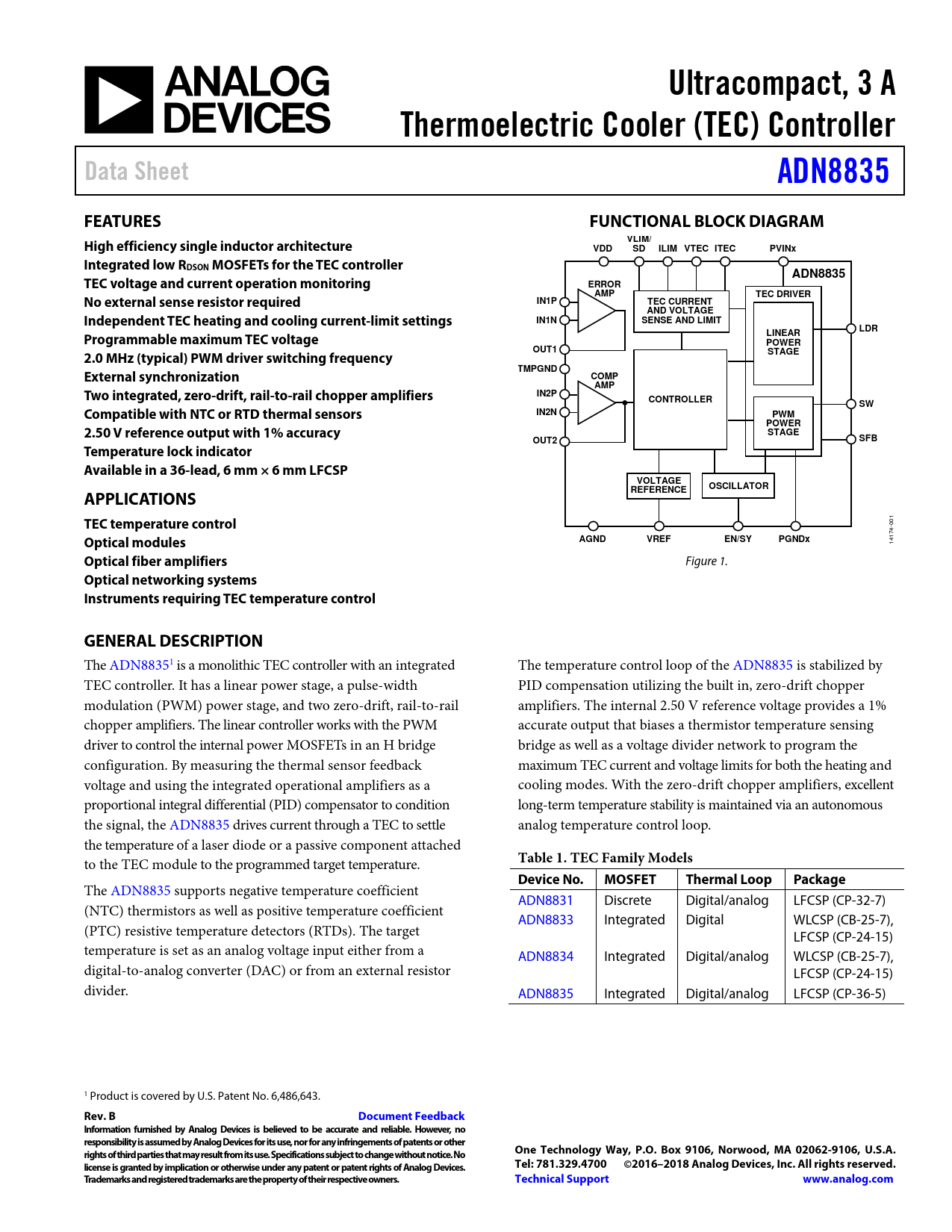 The ADN8835 supports negative temperature coefficient ADN8831 Discrete Digital/analog LFCSP (CP-32-7) (NTC) thermistors as wel as positive temperature coefficient ADN8833 Integrated Digital WLCSP (CB-25-7), (PTC) resistive temperature detectors (RTDs). The target LFCSP (CP-24-15) temperature is set as an analog voltage input either from a ADN8834 Integrated Digital/analog WLCSP (CB-25-7), digital-to-analog converter (DAC) or from an external resistor LFCSP (CP-24-15) divider. ADN8835 Integrated Digital/analog LFCSP (CP-36-5) 1 Product is covered by U.S. Patent No. 6,486,643.