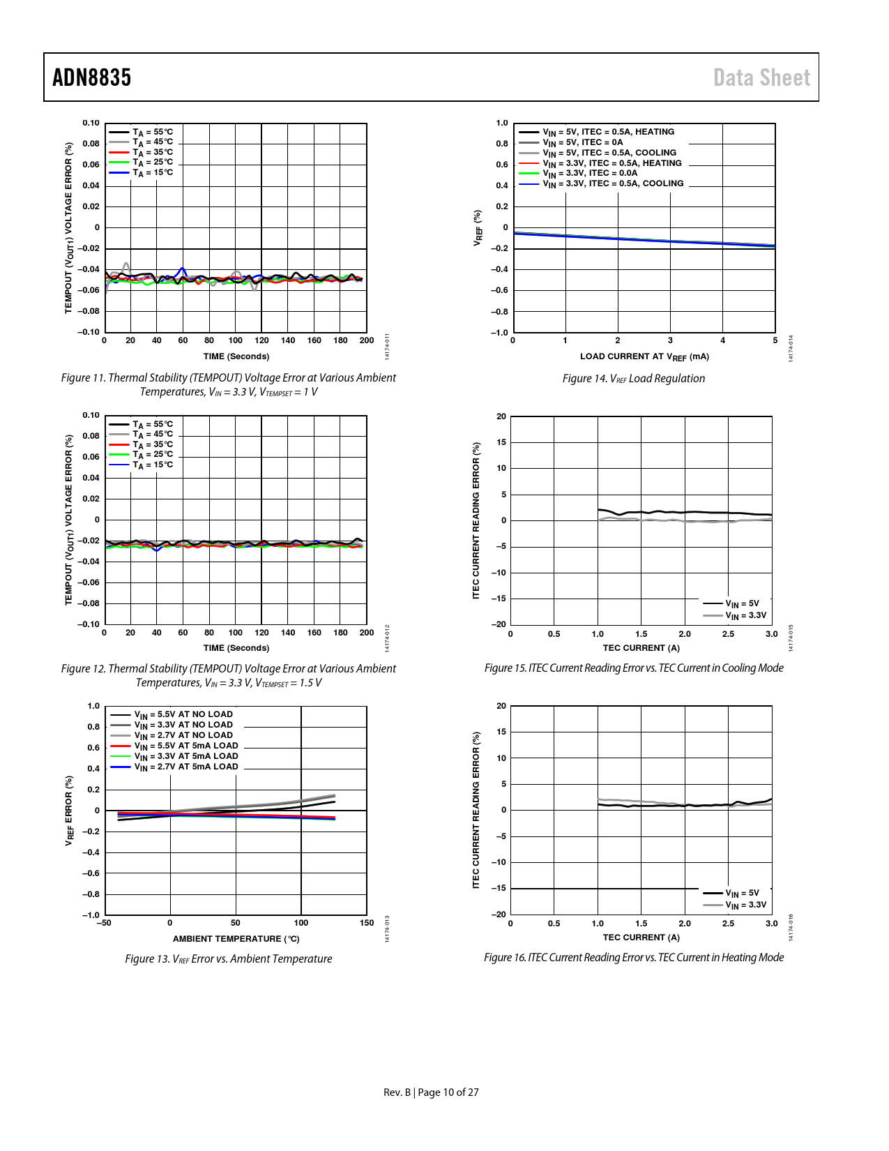 ADN8835Data Sheet0.101.0TA = 55°CVIN = 5V, ITEC = 0.5A, HEATING0.08TA = 45°C0.8VIN = 5V, ITEC = 0A%)TA = 35°CVIN = 5V, ITEC = 0.5A, COOLINGR (0.06TA = 25°C0.6VIN = 3.3V, ITEC = 0.5A, HEATINGTA = 15°CVIN = 3.3V, ITEC = 0.0ARRO0.04VE0.4IN = 3.3V, ITEC = 0.5A, COOLINGEAG0.020.2T L%)O(0F0) VRE1V–0.02UT–0.2O(V –0.04T–0.4U–0.06–0.6EMPO T –0.08–0.8–0.10 1 –1.0020406080100120140160180200 1 0 012345 014 TIME (Seconds) 14174- LOAD CURRENT AT VREF (mA) 14174- Figure 11. Thermal Stability (TEMPOUT) Voltage Error at Various Ambient Figure 14. VREF Load Regulation Temperatures, VIN = 3.3 V, VTEMPSET = 1 V 0.1020TA = 55°C0.08TA = 45°C%)T15A = 35°C%)R (0.06TA = 25°C TR (A = 15°C10RRO0.04ERROEE5AG0.02TNGL O0ADI0) V 1RE–0.02UTNTO–5(V –0.04T U–10–0.06C CURRE EEMPOIT–15T –0.08VIN = 5V VIN = 3.3V–0.10–20020406080100120140160180200 012 00.51.01.52.02.53.0 015 TIME (Seconds)TEC CURRENT (A) 14174- 14174- Figure 12. Thermal Stability (TEMPOUT) Voltage Error at Various Ambient Figure 15. ITEC Current Reading Error vs. TEC Current in Cooling Mode Temperatures, VIN = 3.3 V, VTEMPSET = 1.5 V 1.020VIN = 5.5V AT NO LOAD0.8VIN = 3.3V AT NO LOAD V15IN = 2.7V AT NO LOAD%)0.6VIN = 5.5V AT 5mA LOADR (VIN = 3.3V AT 5mA LOAD100.4VIN = 2.7V AT 5mA LOADRRO E%)50.2R (NG0ADI0RRO EREF–0.2NTRE–5V–0.4–10–0.6C CURRE E IT–15–0.8VIN = 5V VIN = 3.3V–1.0–20–50050100150 013 00.51.01.52.02.53.0 016 AMBIENT TEMPERATURE (°C)TEC CURRENT (A) 14174- 14174- Figure 13. VREF Error vs. Ambient Temperature Figure 16. ITEC Current Reading Error vs. TEC Current in Heating Mode Rev. B | Page 10 of 27 Document Outline FEATURES APPLICATIONS FUNCTIONAL BLOCK DIAGRAM GENERAL DESCRIPTION TABLE OF CONTENTS REVISION HISTORY DETAILED FUNCTIONAL BLOCK DIAGRAM SPECIFICATIONS ABSOLUTE MAXIMUM RATINGS THERMAL RESISTANCE MAXIMUM POWER DISSIPATION ESD CAUTION PIN CONFIGURATION AND FUNCTION DESCRIPTIONS TYPICAL PERFORMANCE CHARACTERISTICS THEORY OF OPERATION ANALOG PID CONTROL DIGITAL PID CONTROL POWERING THE CONTROLLER ENABLE AND SHUTDOWN OSCILLATOR CLOCK FREQUENCY External Clock Operation Connecting Multiple ADN8835 Devices TEMPERATURE LOCK INDICATOR SOFT START ON POWER-UP TEC VOLTAGE/CURRENT MONITOR Voltage Monitor Current Monitor MAXIMUM TEC VOLTAGE LIMIT Using a Resistor Divider to Set the TEC Voltage Limit MAXIMUM TEC CURRENT LIMIT Using a Resistor Divider to Set the TEC Current Limit APPLICATIONS INFORMATION SIGNAL FLOW THERMISTOR SETUP THERMISTOR AMPLIFIER (CHOPPER 1) PID COMPENSATION AMPLIFIER (CHOPPER 2) MOSFET DRIVER AMPLIFIERS PWM OUTPUT FILTER REQUIREMENTS Inductor Selection Capacitor Selection INPUT CAPACITOR SELECTION POWER DISSIPATION PWM Regulator Power Dissipation Conduction Loss (PCOND) Switching Losses (PSW) Transition Losses (PTRAN) Linear Regulator Power Dissipation THERMAL CONSIDERATION PCB LAYOUT GUIDELINES BLOCK DIAGRAMS AND SIGNAL FLOW GUIDELINES FOR REDUCING NOISE AND MINIMIZING POWER LOSS General PCB Layout Guidelines PWM Power Stage Layout Guidelines Linear Power Stage Layout Guidelines Placing the Thermistor Amplifier and PID Components EXAMPLE PCB LAYOUT USING TWO LAYERS OUTLINE DIMENSIONS ORDERING GUIDE
